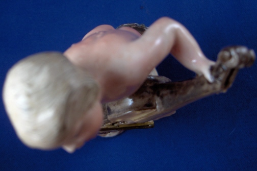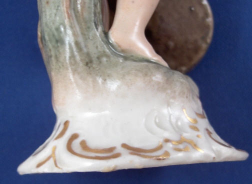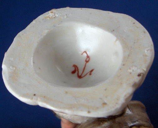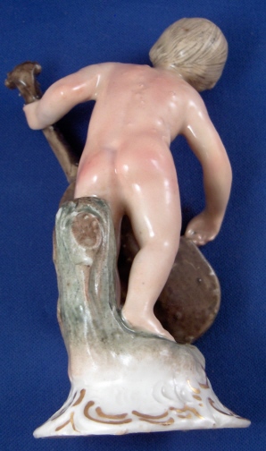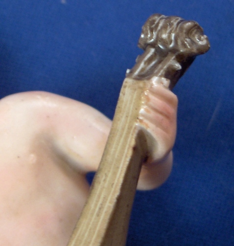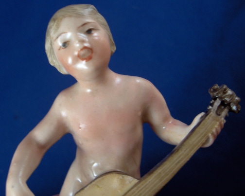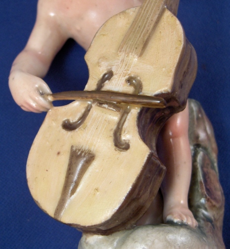 This is a figurine made by Cozzi in the early 19th century or maybe even late 18th century. It is of a young boy playing a contrabass. Very well modeled in softpaste porcelain and painted with a typical Italian base with lots of gilding. Cozzi ecisted from around 1764 until 1812 so quite a while and made some superb porcelain. The figurine displays perfectly though there has been some top notch restoration done to it - I cannot tell what was done but the bow was definitely worked on, as was the arm. The entire nude colored body has a weird feel though as usual it was probably jsut oversprayed to hide the bit of actual work. I cannot tell it was repaired when just looking at it so a true experts work and I rarely say this! The back of his body has lots of bumps in the paste which are original to it from the making. The figurine is about 4.625 inches tall, 2.5 inches wide and 2 inches deep. It is marked underneath with the red anchor mark. Please email me for more information or other pictures.