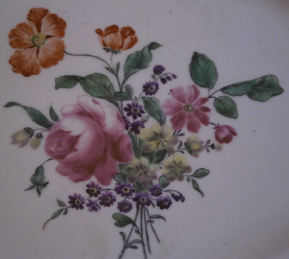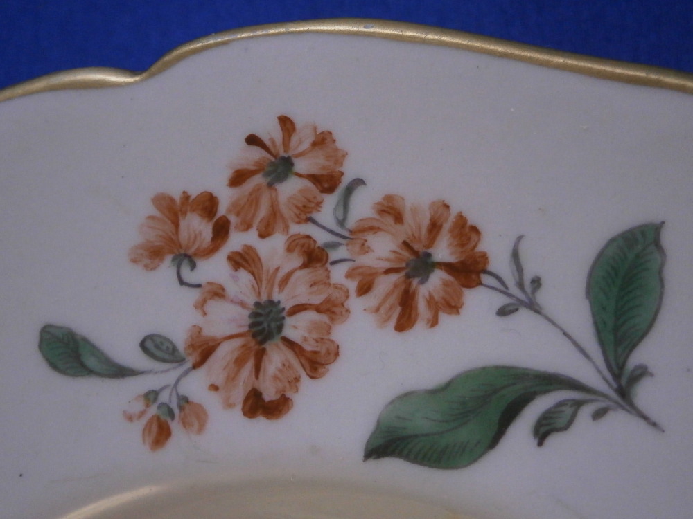 This is a superb floral serving dish made by Cozzi around 1770. The factory made soft-paste porcelain in Venice and was founded by Geminiano Cozzi in 1764. It closed in 1812. The oval plate is hand painted with a nice large floral arangement in the center as well as three larger single flowers and three smaller ones along the rim plus two little leaf designs. Gold trim along the nicely shaped edge. A superp dish from a rare maker! The piece is in great condition with a little wear to the gold trim. It displays superbly! The dish is 1 inch tall, 8.875 inches wide and 6.875 inches deep. It is marked with their red anchor mark underneath as shown. Please email me for more information or other pictures.