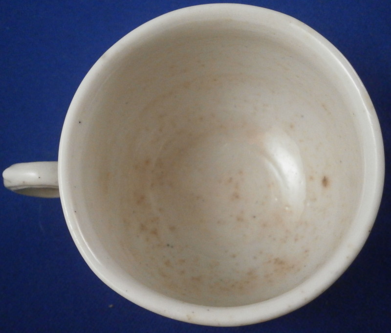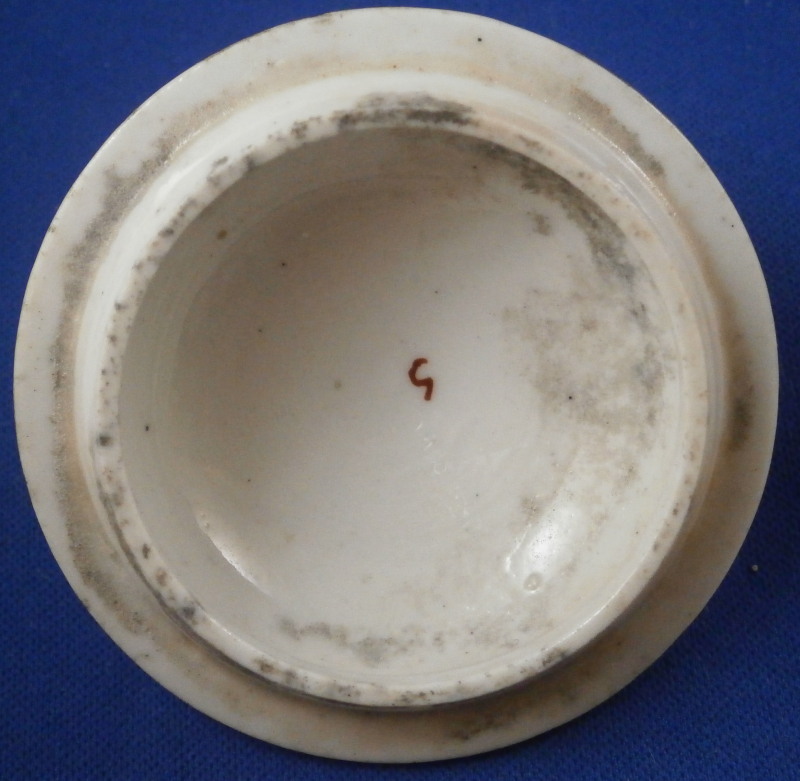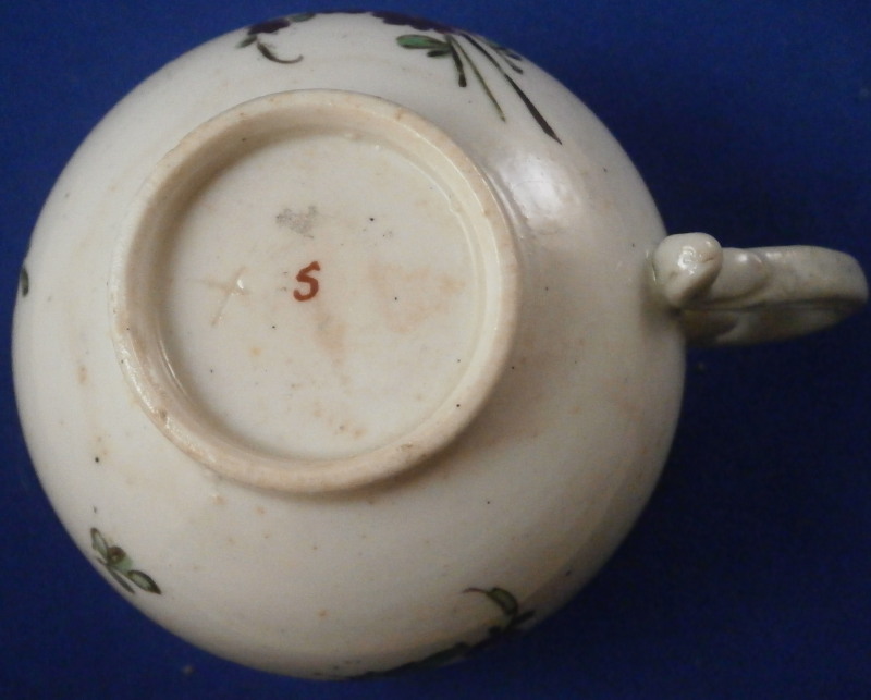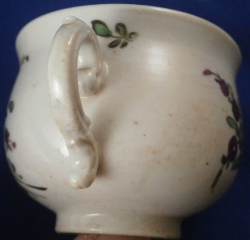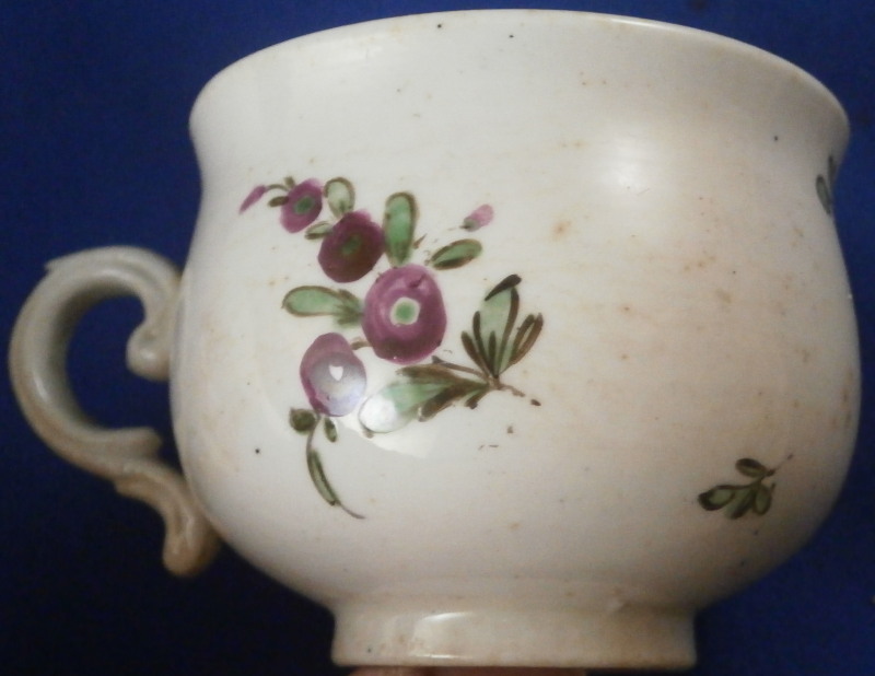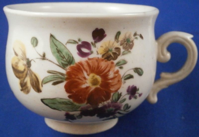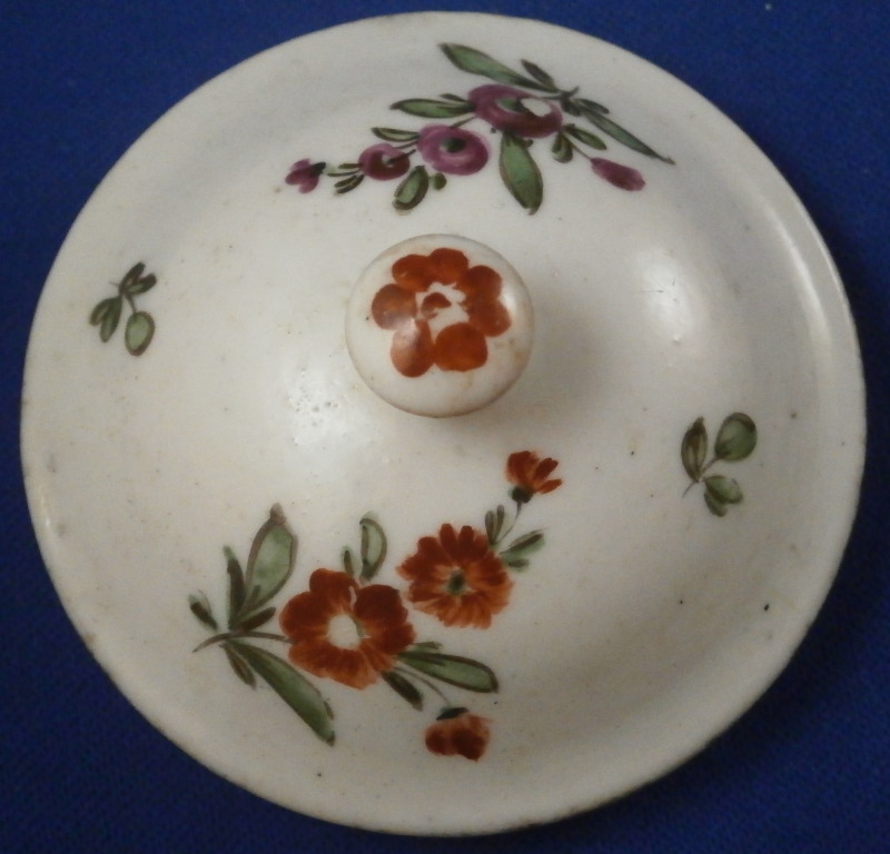 This is a pot de creme with its lid / hot chocolate cup / custard cup made by Cozzi around 1770. A very cute little cup that is hand painted with polychrome flowers - a larger arrangement to the one side with smaller flowers to the other and the lid. Typical handle shape and a little finial painted with an iron red design. This lid has a different shape than the first one. The cup and lid are made of soft paste porcelain in Venice . The piece is in great condition with no chips, etc. but there is a lot of staining as shown from the pictures. I think at least some of that is from when it was made. Still displays nicely since most is on the inside/underside but it is part of the piece. The cup with its lid is 2.875 inches tall and 2.375 inches in diameter. Both are marked with a red S or 5 underneath. Please email me for more information or other pictures.