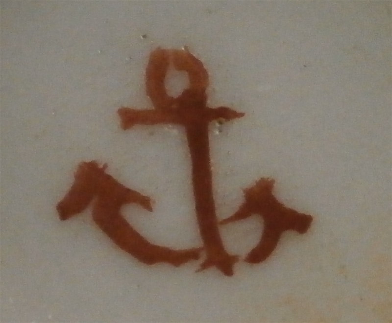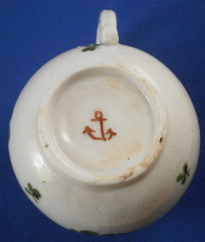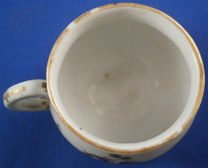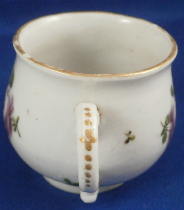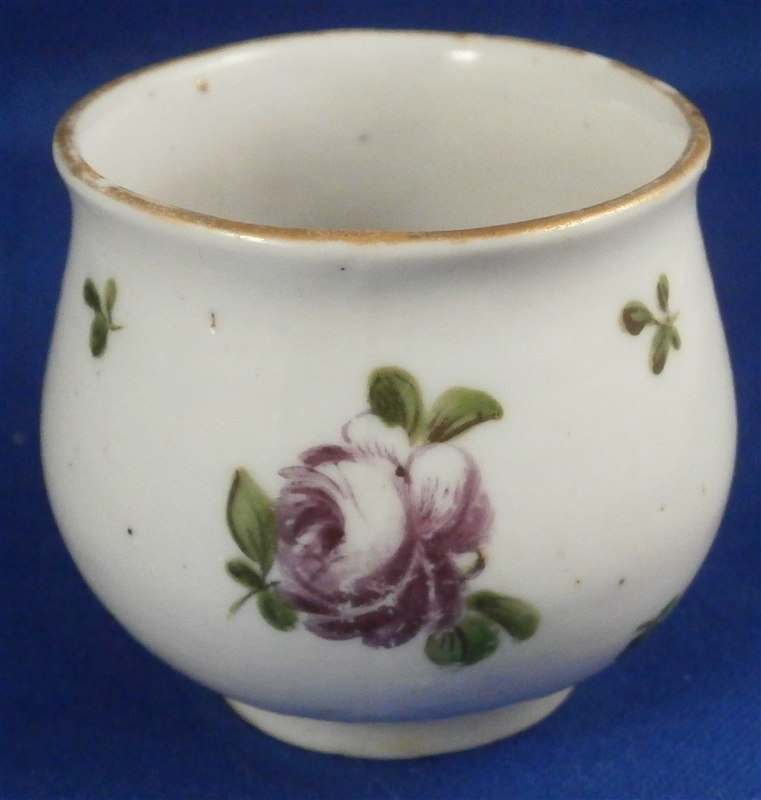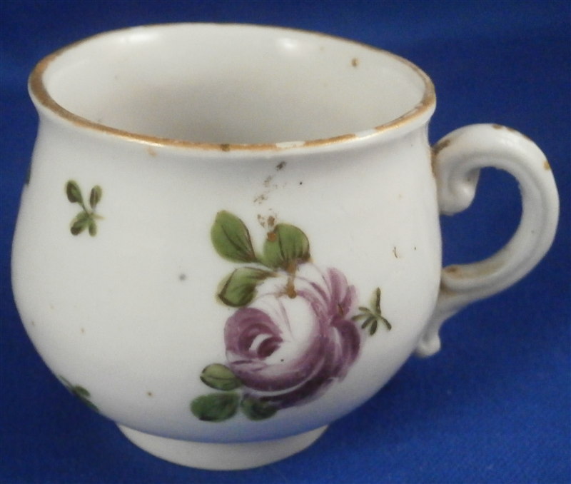 This is either a pot de creme without its lid or a cup without its saucer made by Cozzi around 1770. I do believe it is a pot de creme. Either way it is a cute little cup hand paitned with purple roses and green leaves all around, with a nicely shaped handle and a bit of gold trim to the handle and top edge. The cup is made of soft paste porcelain in Venice . The piece is in great condition with the usual firing flaws and a tiny bit of wear but no real damage. The cup is 1.875 inches tall and 2.125 inches in diameter. It is marked underneath with the red anchor mark as shown. Please email me for more information or other pictures.
