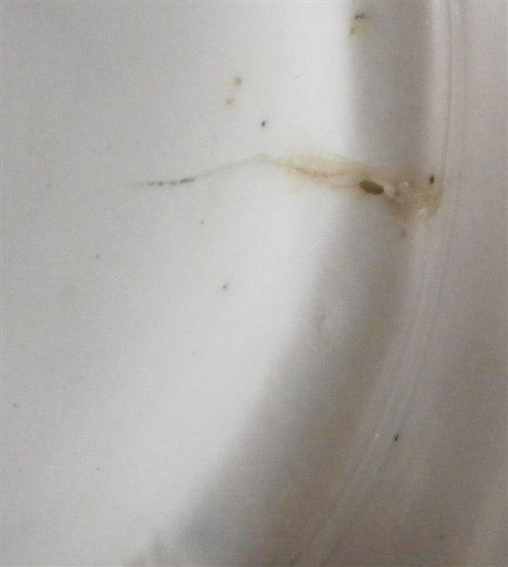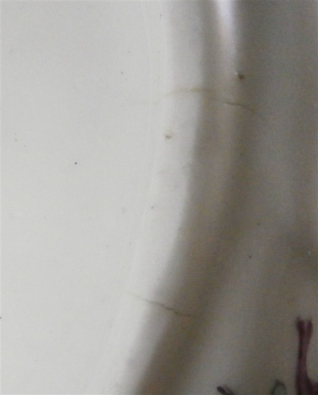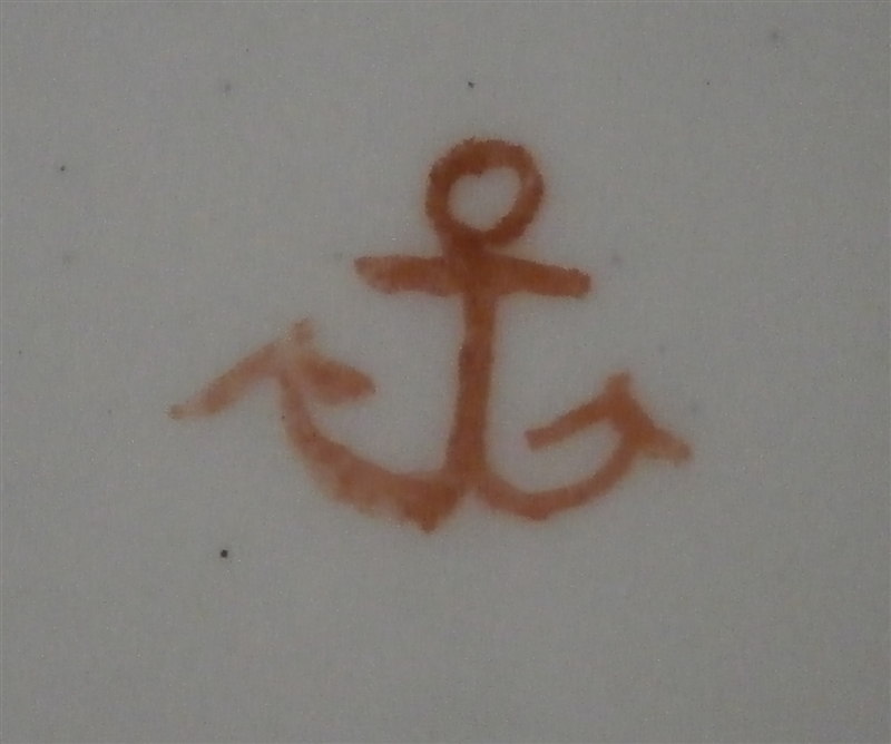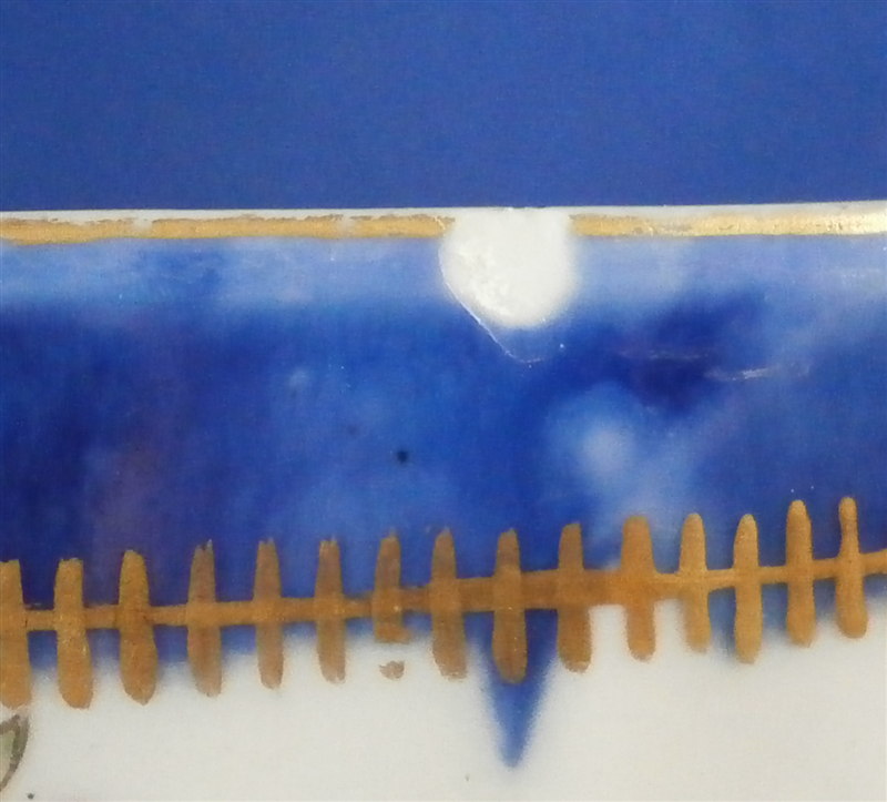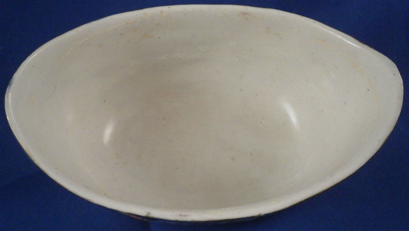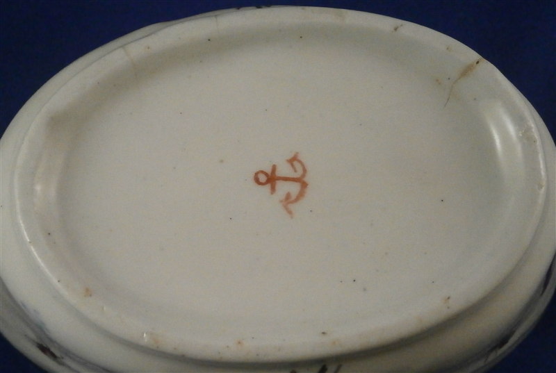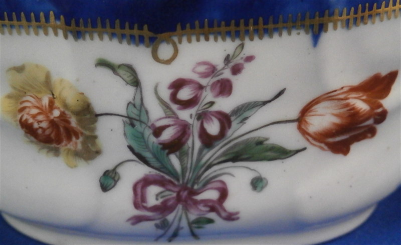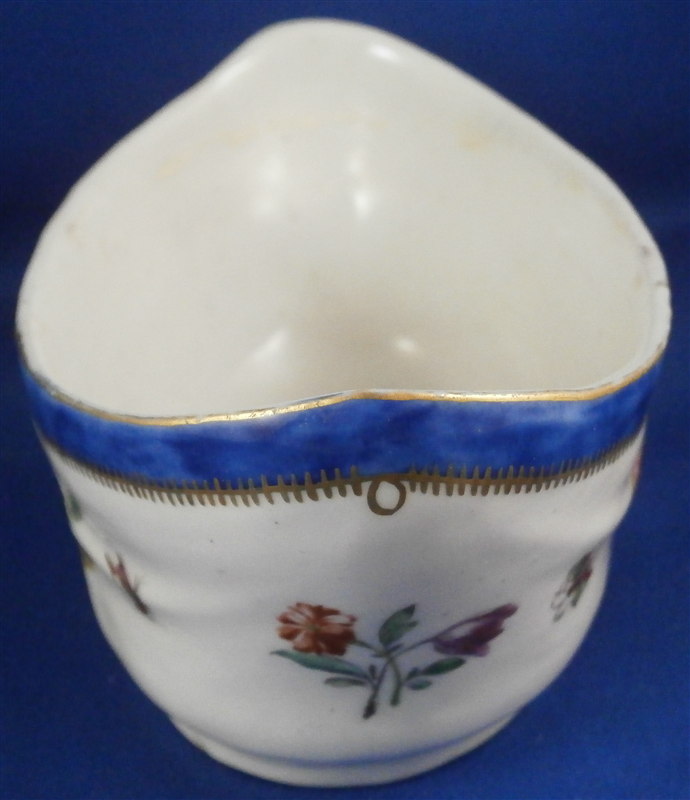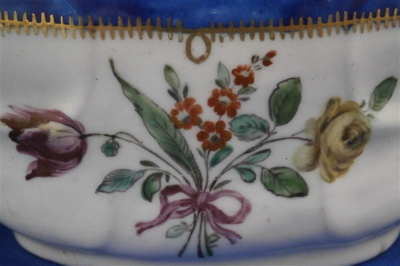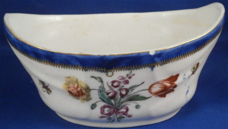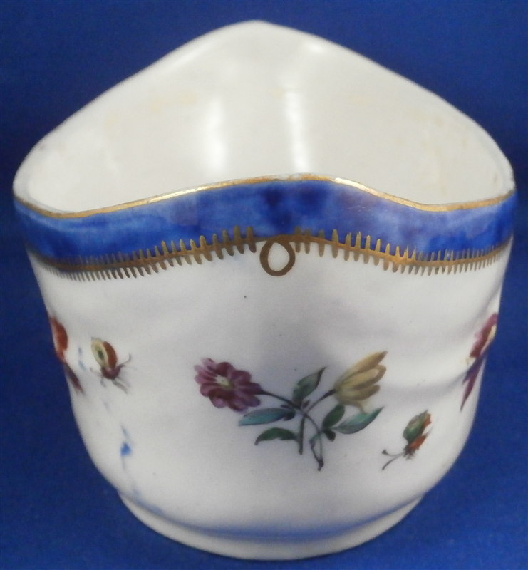 This is a superb sauce dish or sauciere made by Cozzi around 1770. The factory made soft-paste porcelain in Venice and was founded by Geminiano Cozzi in 1764. It closed in 1812. The piece is hand painted with a floral arangement on the front and the back as well as a smaller flower to either side and four fun bugs with a gold and cobalt blue trim along the top edge. A really nice look! The piece is in great condition with a small chip to te top edge and some firing cracks to the bottom edge as shown. The inside has some hard water deposits which could be cleaned up if need be with some vinegar. I guess someone used it as a planter in the past.The dish is 2.75 inches tall, 5.5 inches wide and and 3.375 inches deep. It is marked with their red anchor mark underneath as shown. Please email me for more information or other pictures.