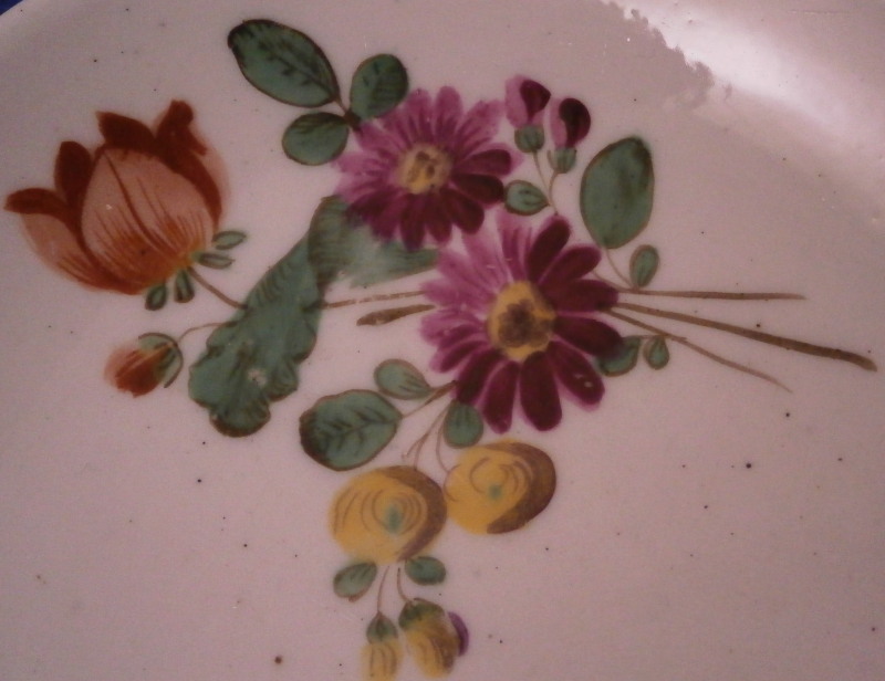 This is a nice saucer made by Cozzi in Venice in the 18th century. Nicely hand painted with a floral arrangement in the typical colors and style as well as a smaller single flower and some leaves. Not something you find often as Italian porcelain is quite hard to find. The piece is in great condition with some black firing specs from when it was made and a very ahrd to spot tight hairline to the edge as shown. Still rings like a bell! The saucer is 0.875 inches tall and 4.625 inches in diameter. It is unmarked but definitely Italian from this period and Cozzi fits the best. Please email me for more information or other pictures.