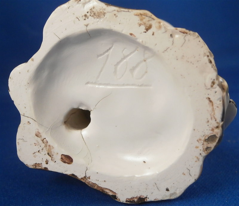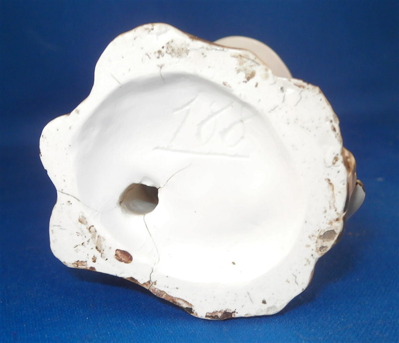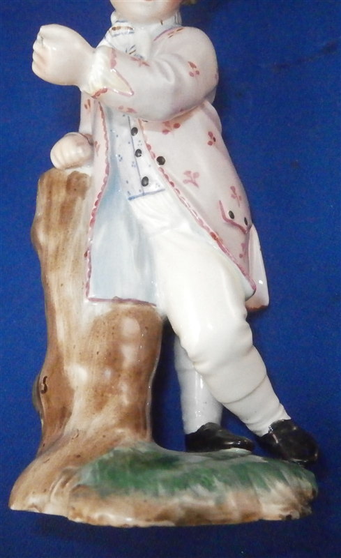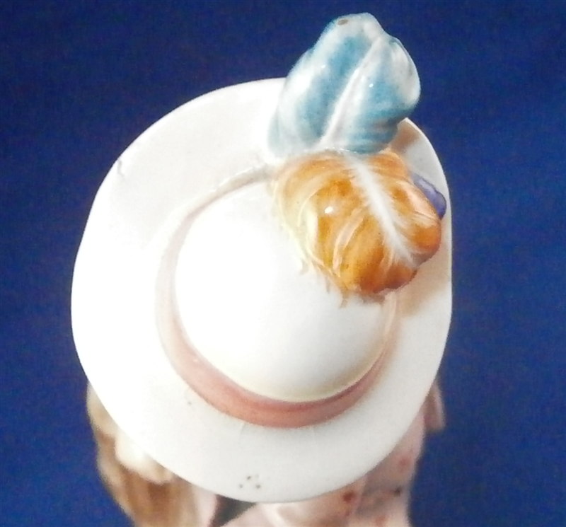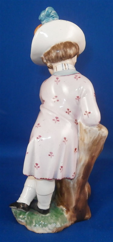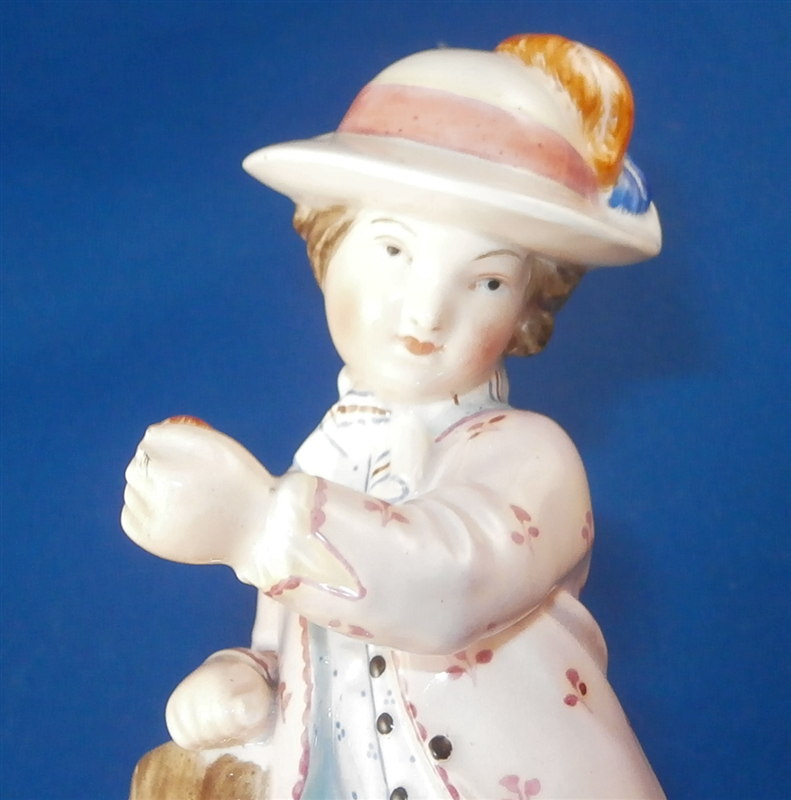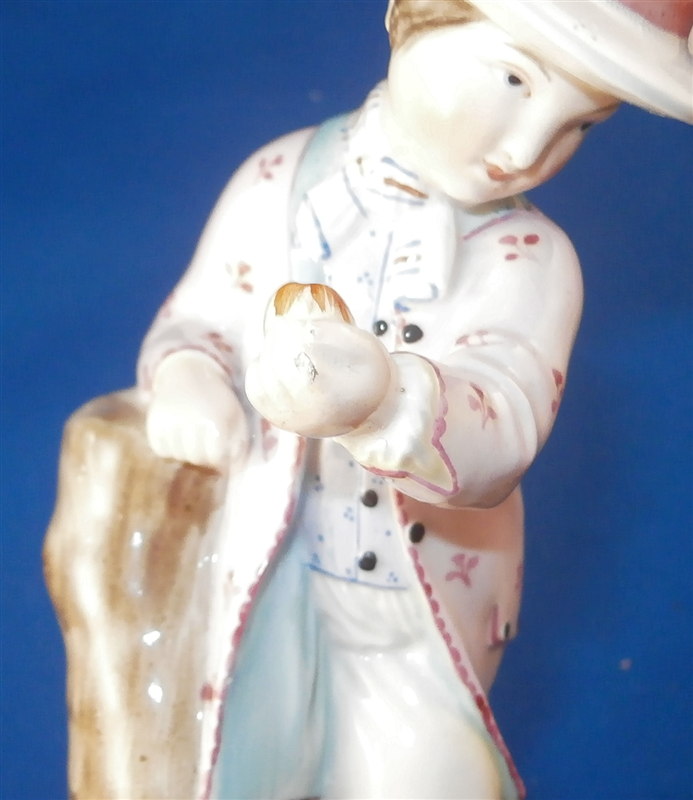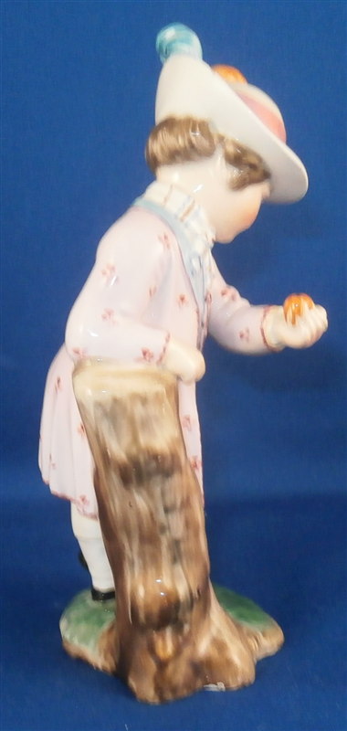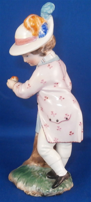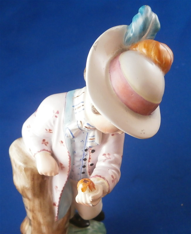 This is a great figurine made by Damm using the old Hoechst molds around the mid 19th century. Damm was actually not a porcelain but an fine earthenware maker. Thus these pieces look quite different than the old Hoechst ones and are much lighter in weight and also a bit bigger in size as earthenware did not shrink as much as porcelain during the firing process. Quite charming though and very collectable and rare.This is a figurine of a boy holding an apple (I think) in his lft hand while leaning on a tree stump. He is wearing some nice clothes as well as a hat with feathers on it. The figurine is painted very nicely and looks very much like the Hoechst pieces. He is 5.5 inches tall, 2.25 inches wide and 2.25 inches deep. Marked underneath with just the mold number 188 with a line under it which can be found in any good Damm book as being this figurine. The figurine is in top condition with a few minor glaze flakes - one on his finger, one on his hat and one on the base bottom edge so about as good as they come! Please email me for more information or other pictures.