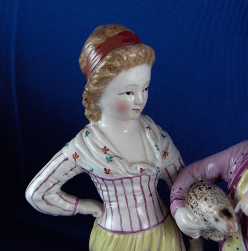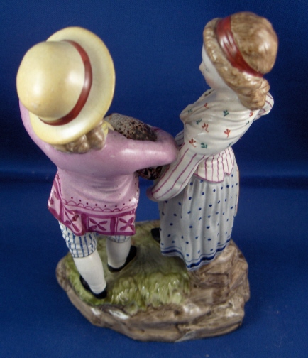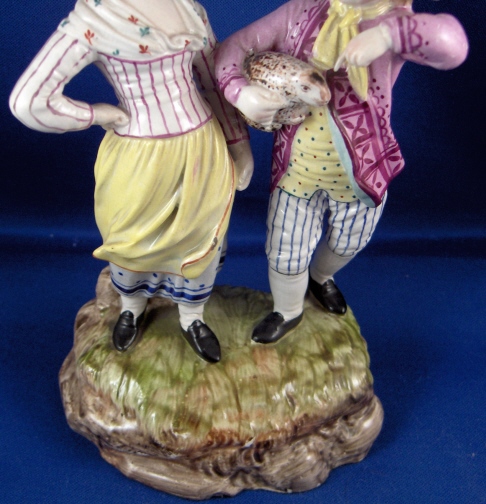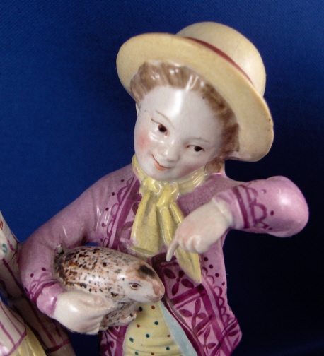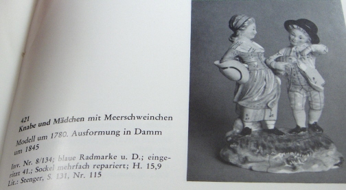 This is a rare figurine made by Damm using the old Hoechst molds around 1840-1850. Damm was actually not a porcelain but an earthenware maker. Thus these pieces look quite different than the old Hoechst ones and are much lighter in weight. They are also a bit bigger in size as earthenware did not shrink as much as porcelain during the firing process. Quite charming though and very collectable and rare.This is a pair holding a guinea pig. It is 6.25 inches tall, 4 inches wide and 3 inches deep. Marked underneath with the blue wheel mark and the letter D above it. Also incised 41 which is listed in the Damm book as a couple with a guinea pig. Perfect condition with some light crazing which is normal with these pieces. Please email me for more information or other pictures.