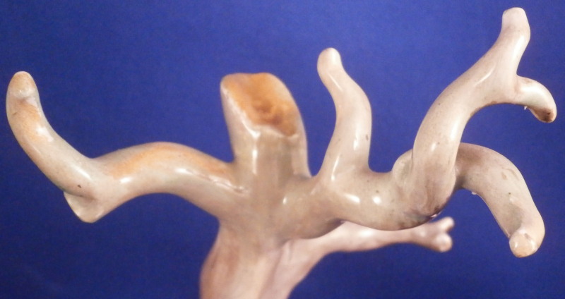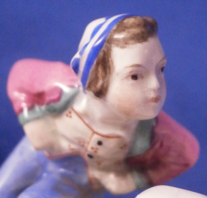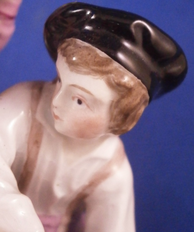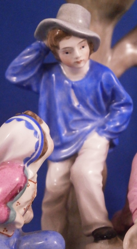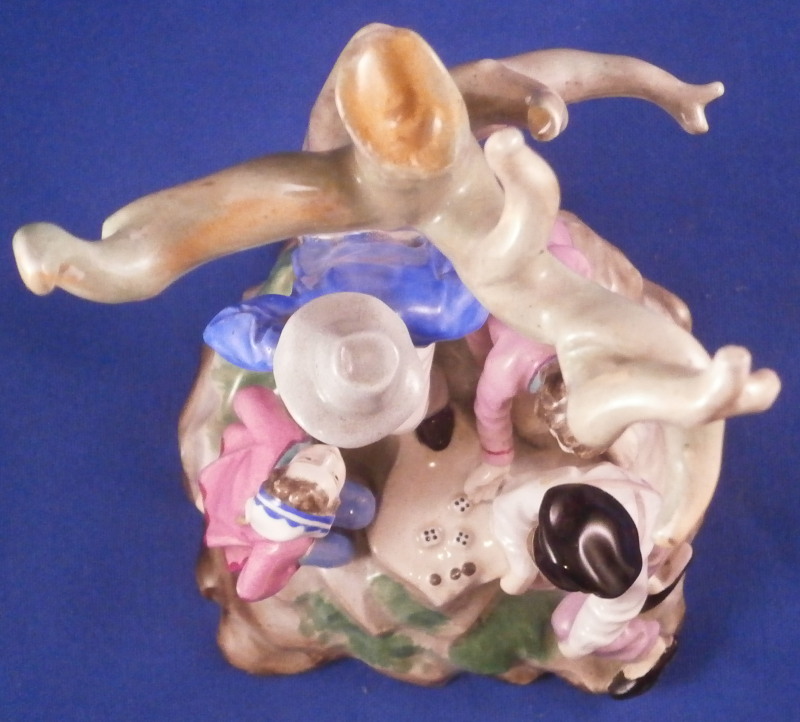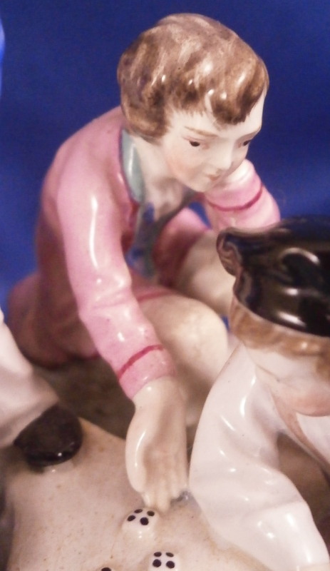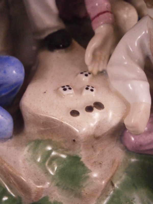 This is a rare figurine made by Damm around the mid 19th century. Rare because this isone of the very few figurines that they made on their own and not by using old Hoechst molds. So it is much more specialy than most of their pieces. Plus the fact that it is in superb condition even with that fragile tree in the back. Damm was not a porcelain but an fine earthenware maker. More like some of the faience from France from the 18th century. If using old porcelain molds the pieces would be bigger than their porcelain counter parts and lighter in terms of weight. Quite charming though and very collectable and rare. The piece here is called Vier Mainzer Buben (four boys from the town of Mainz ) and they are playing a game of dice on a rock in the center. Not an easy to find motif and if you are into playing dice this is a must have for you :) Four small figures are seated or standing around the rock in the center on a typical base for this maker with that awesome tree in the background. The figurine is painted very nicely and looks stunning! It is 5.75 inches tall, 3.625 inches wide and and 3.5 inches deep. Marked underneath with the mold number 345 as shown. The figurine is in as good a condition as one could hope for with some grazing to the glaze on the udnerside only as well as three firing cracks on the udnerside that do not affect the figure when on display. A rare and fun piece! Please email me for more information or other pictures.
