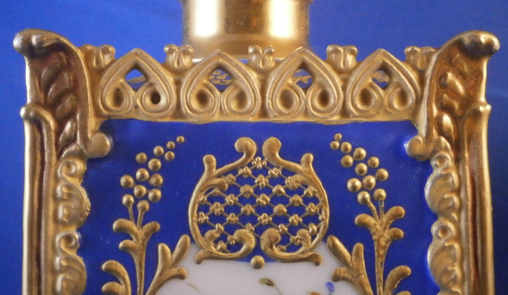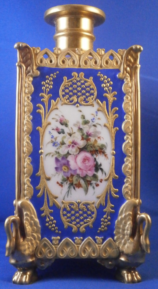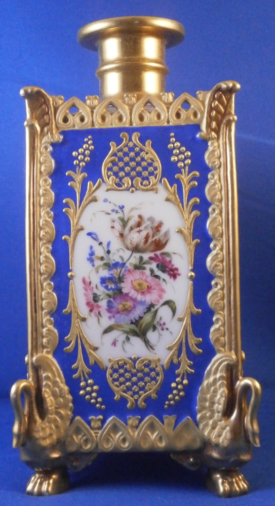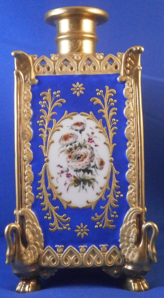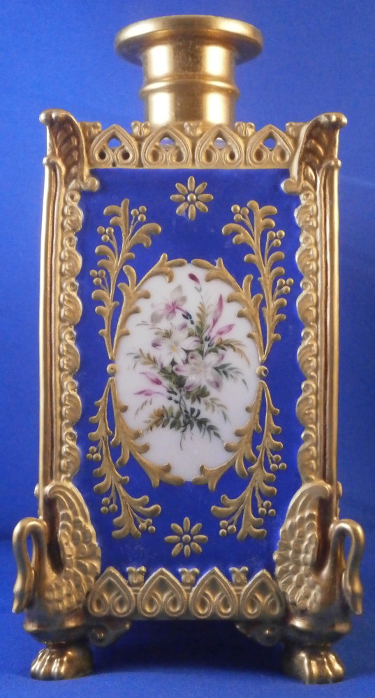 This is a perfume / dresser bottle made by Darte Freres in the early 19th century. As fancy a scent flask as I have come across in a long time plus it is marked by the maker and that rarely happens. So definitely a special piece! The piece is superbly modeled with four sides that have a blue ground color to them and each side has a top quality hand painted floral arrangement on white ground to it with lots of fancy gilding around the much of it raised. The corners have a nice trim to it that is fully gilded with a swan to each of the bottom corners. A reticulated arch trim to the top edge and more blue ground and raised gold trim to the top. The lid stopper is original and has the same blue color to it and a nice relief design that is gilded plus a raised round design in gold. It is a stunning looking piece with lots of detail so the pictures will do much better than any description. The piece is in superb condition with just a spot of minor gold wear to two top corners and the very tip of the lid. As nice as they come that is for sure! It is marked underneath with the red Darte Freres - Darte Palais Royal mark as shown. The bottle and stopper are 8.5 inches tall and 3.5 inches square. Please email me for more information or other pictures.