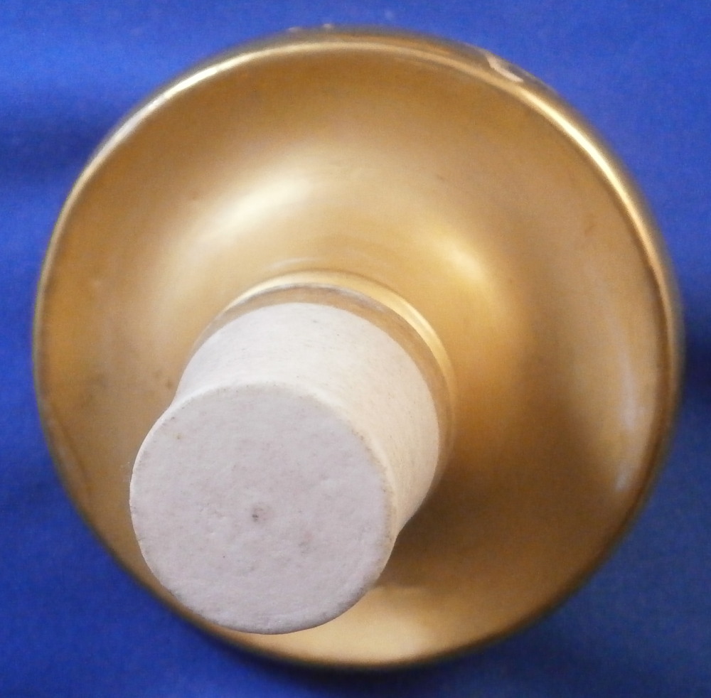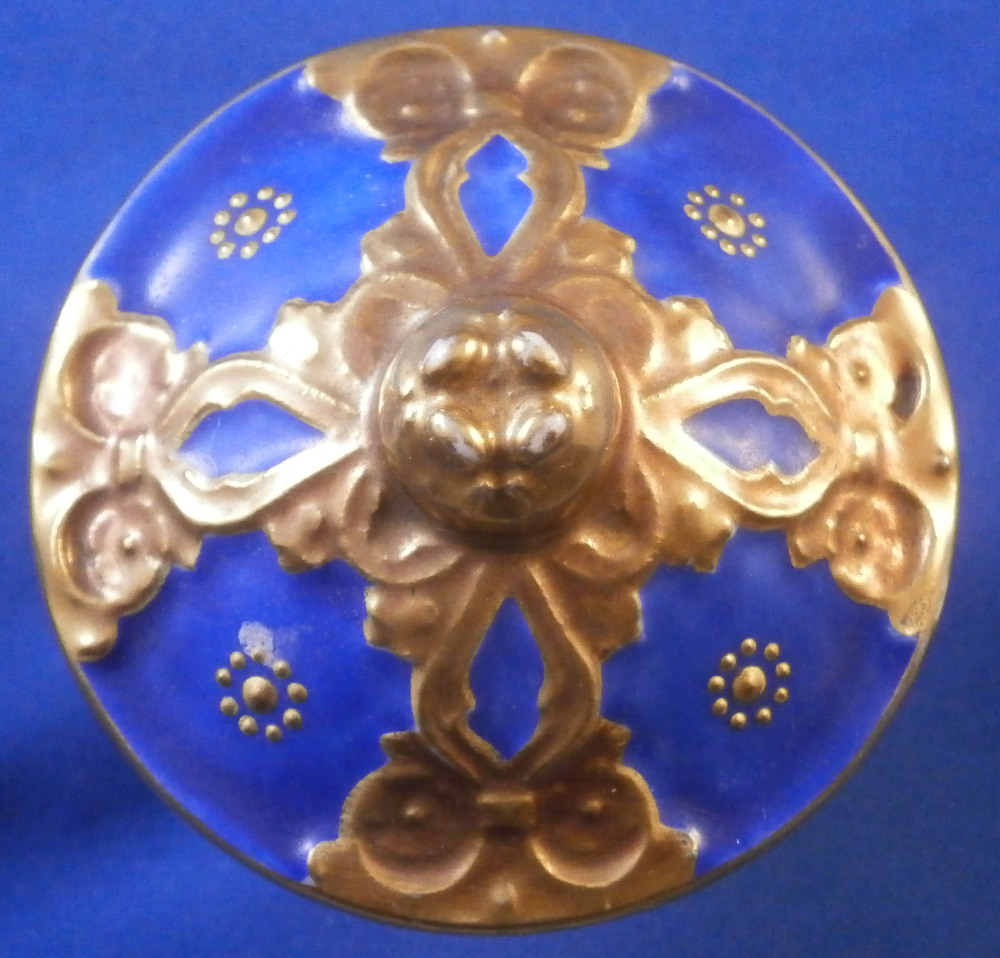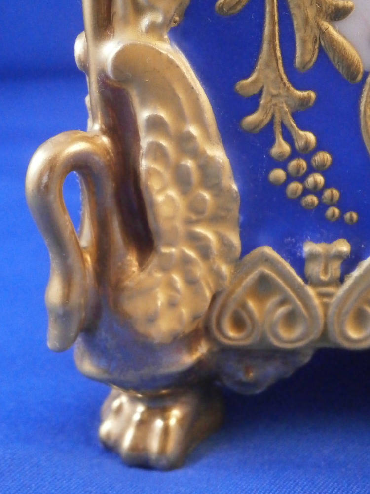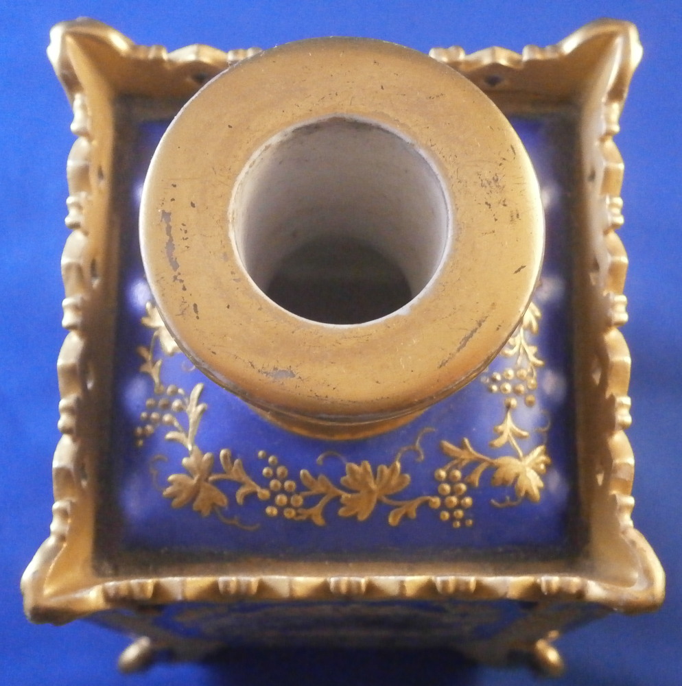 This is a perfume / dresser bottle made by Darte Freres in the early 19th century. As fancy a scent flask as I have come across in a long time plus it is marked by the maker and that rarely happens. So definitely a special piece! The piece is superbly modeled with four sides that have a blue ground color to them and each side has a top quality hand painted floral arrangement on white ground to it with lots of fancy gilding around the much of it raised. The corners have a nice trim to it that is fully gilded with a swan to each of the bottom corners. A reticulated arch trim to the top edge and more blue ground and raised gold trim to the top. The lid stopper is original and has the same blue color to it and a nice relief design that is gilded plus a raised round design in gold. It is a stunning looking piece with lots of detail so the pictures will do much better than any description. The piece is in superb condition with just a spot of minor gold wear to two top corners and the very tip of the lid. As nice as they come that is for sure! It is marked underneath with the red Darte Freres - Darte Palais Royal mark as shown. The bottle and stopper are 8.5 inches tall and 3.5 inches square. Please email me for more information or other pictures.