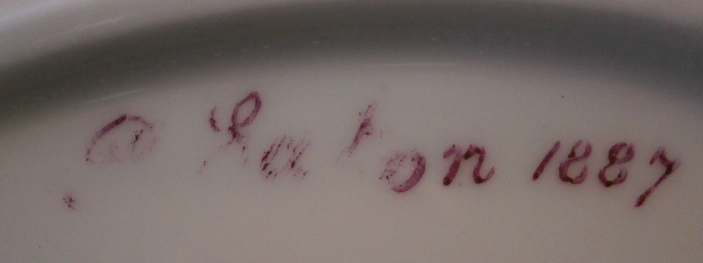 This is a really nice floral plate made by Davenport in England in 1887. According to the explanation of this mark I foudn they stated this impressed mark dates to around 1800 but that seemed wrong so it helps having it dated :) It is a superb plate that has a simple shape to it with a gold trim to the edge. The ebst part is that amazingly well painted orchid flower in the center including the leaves and blossoms. Some other leaves in the background to make it all look amazing. There are even some raised white highlights to the elaves to give it more depth. Hard to show in the pictures but the quality of the painting is top notch. Not sure of what type of orchid this is. The plate is in superb condition as nice as they come! The piece is marked with an impressed DAVENPORT mark as shown. The plate is 0.75 inches tall and 9 in diameter. Signed underneathR. Eaton 1887. I could not find anything about this artist but he was definitely talented. And amazingly I have a second plate with a different orchid if anyone would be interested in a pair. Please email me for more information or other pictures.