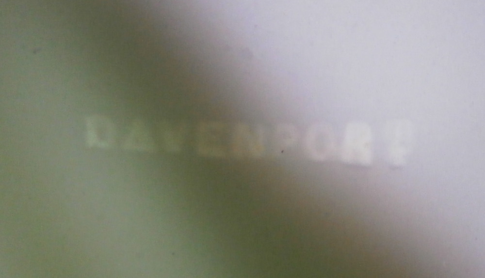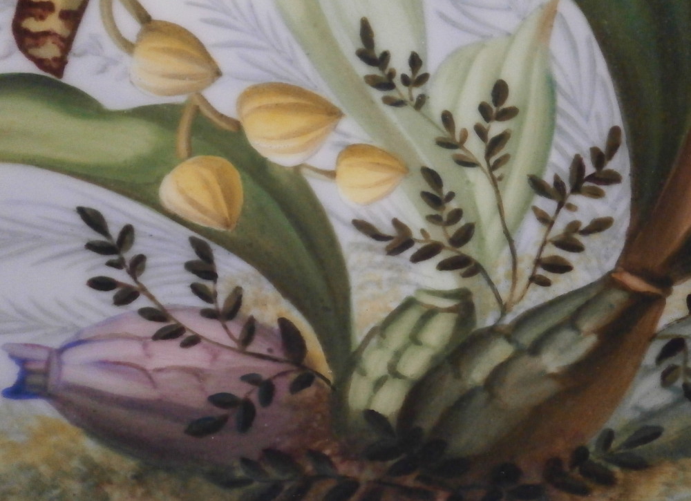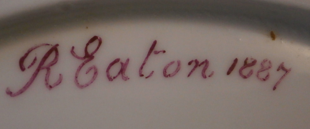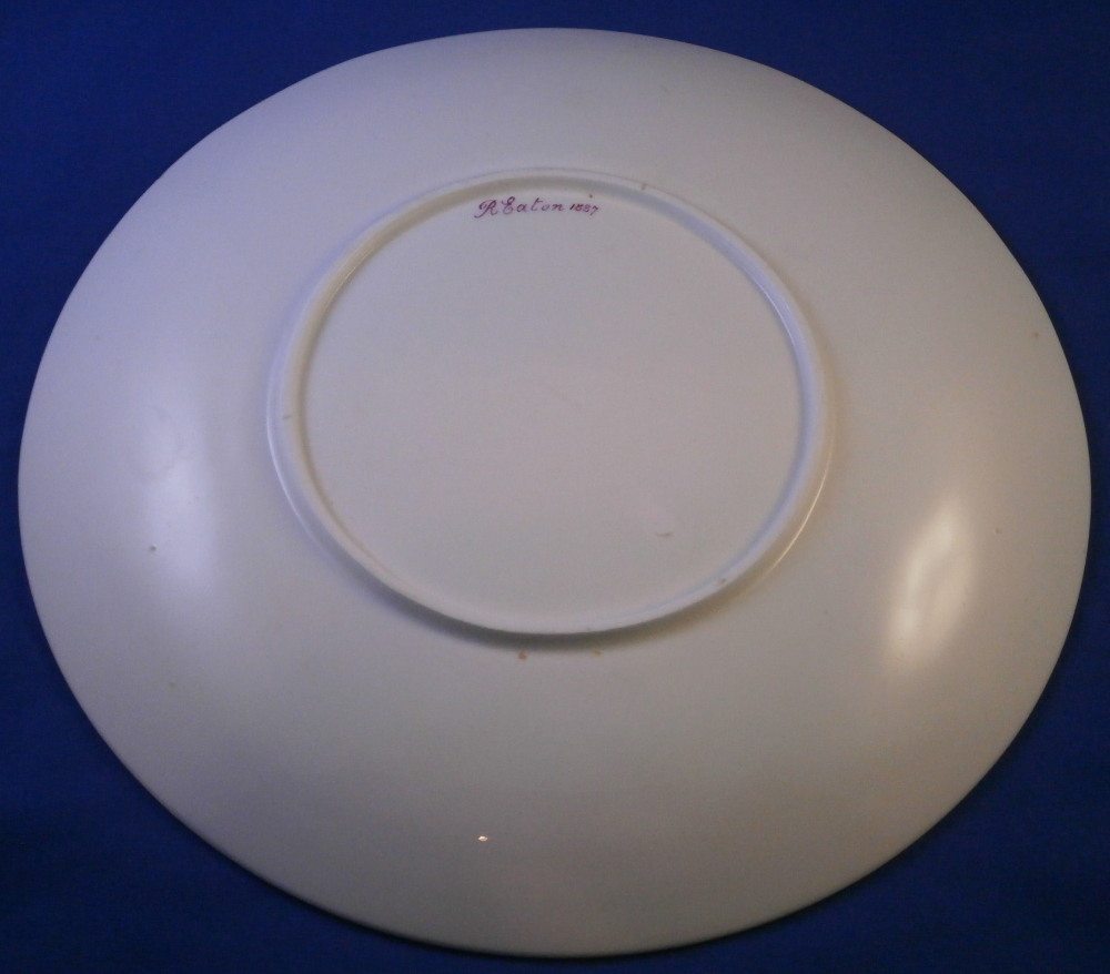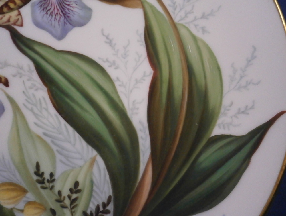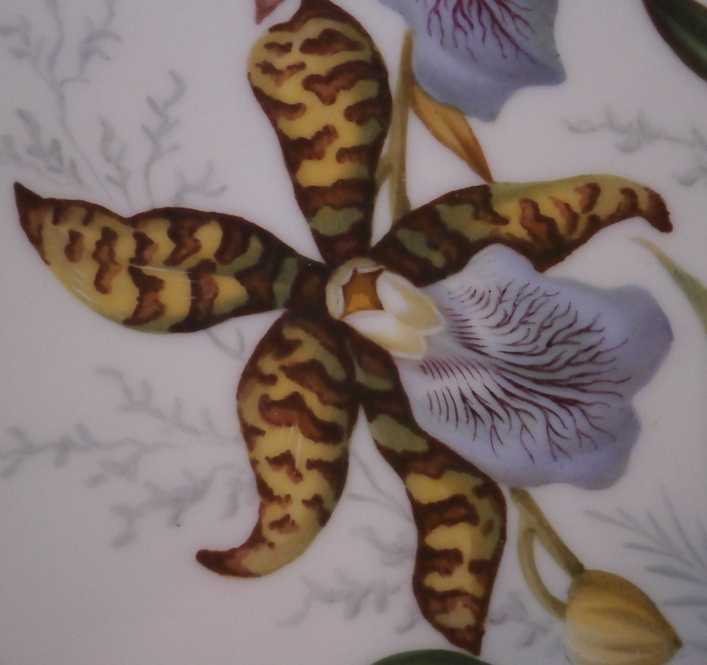 This is a really nice floral plate made by Davenport in England in 1887. According to the explanation of this mark I found they stated this impressed mark dates to around 1800 but that seemed wrong so it helps having it dated :) It is a superb plate that has a simple shape to it with a gold trim to the edge. The best part is that amazingly well painted orchid flower in the center including the leaves and blossoms. Some other leaves in the background to make it all look amazing. There are even some raised white highlights to the leaves to give it more depth. Hard to show in the pictures but the quality of the painting is top notch. Not sure of what type of orchid this is. The plate is in superb condition as nice as they come! Flaw to the udnerside from when it was made that was ground down. The piece is marked with an impressed DAVENPORT mark as shown. The plate is 0.875 inches tall and 9 in diameter. Signed underneath R. Eaton 1887. I could not find anything about this artist but he was definitely talented. And amazingly I have a second plate with a different orchid if anyone would be interested in a pair. Please email me for more information or other pictures.