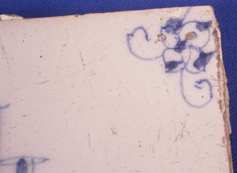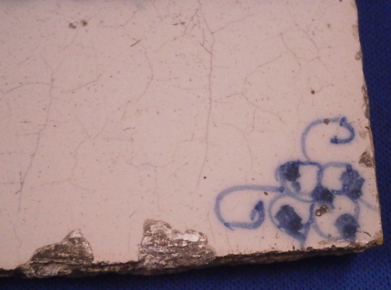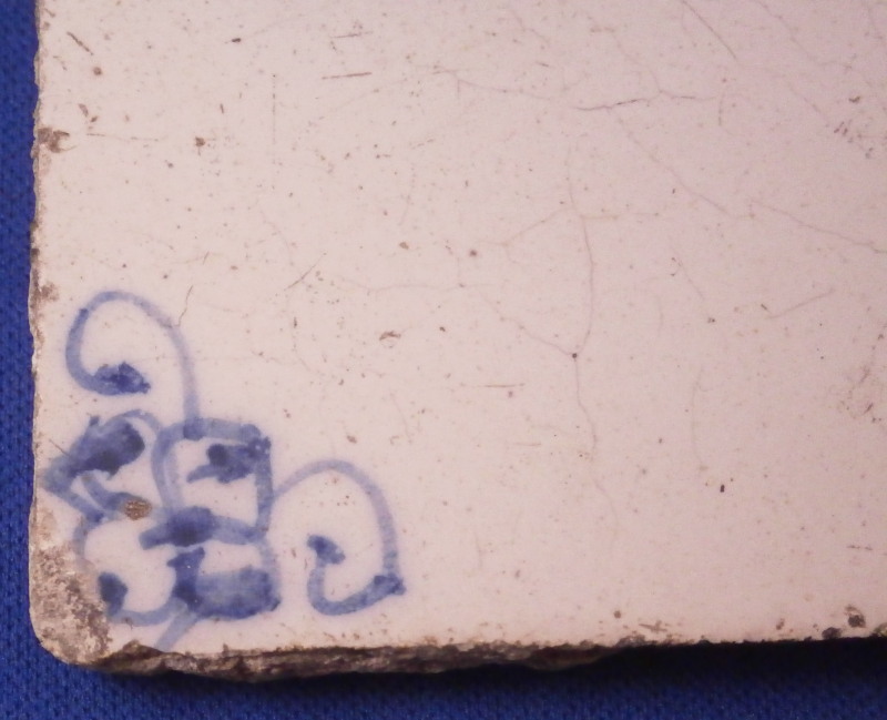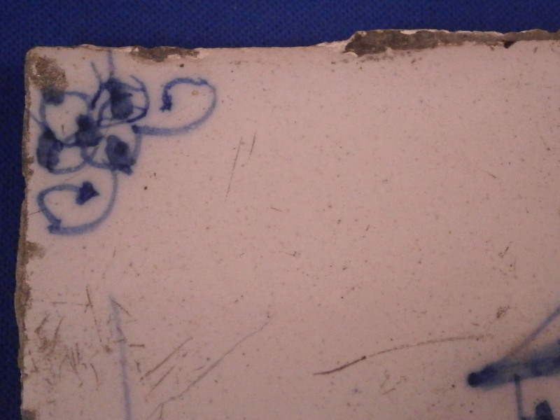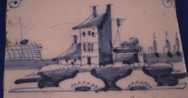 This is a fun blue and white earthenware tile made in the Delft area of the Netherlands in the 18th century. The tile is hand painted with a blue monochrome scene including a building with a view ot the sea with some ships in the distance. Typical design to each corner. The tile is about 5 inches square and 5/16 inches thick. It has definitely been used and still has some grout attached to it, it has some chips and crazing and some scratches but it does have a very nice hard to find scene on it that easily makes up for that. I really like this piece! Please email me for more information or other pictures.