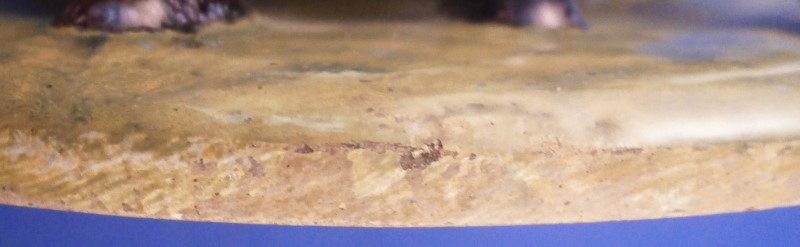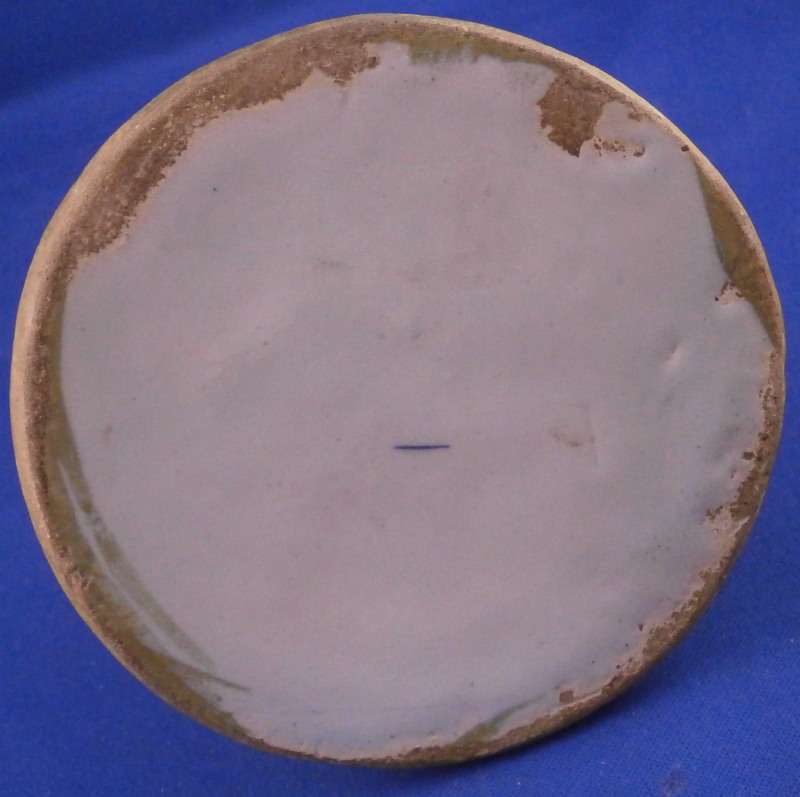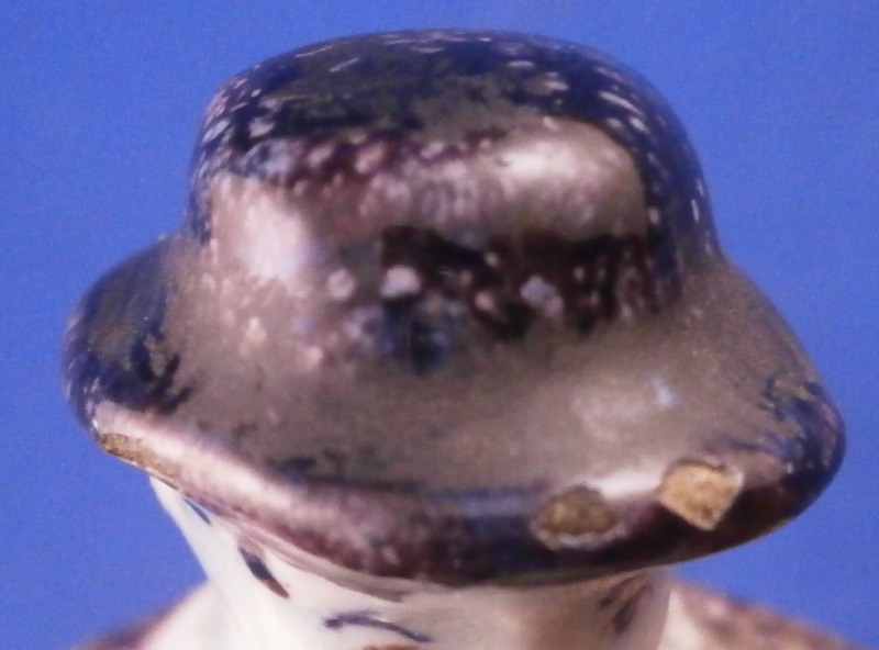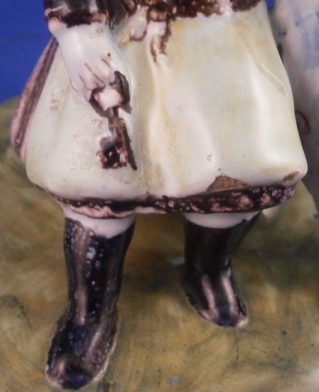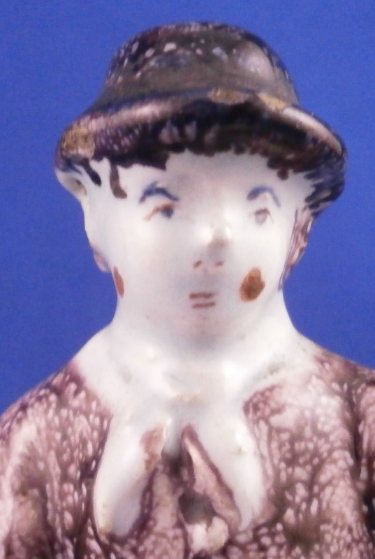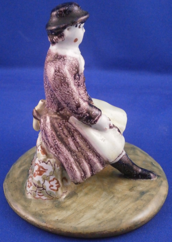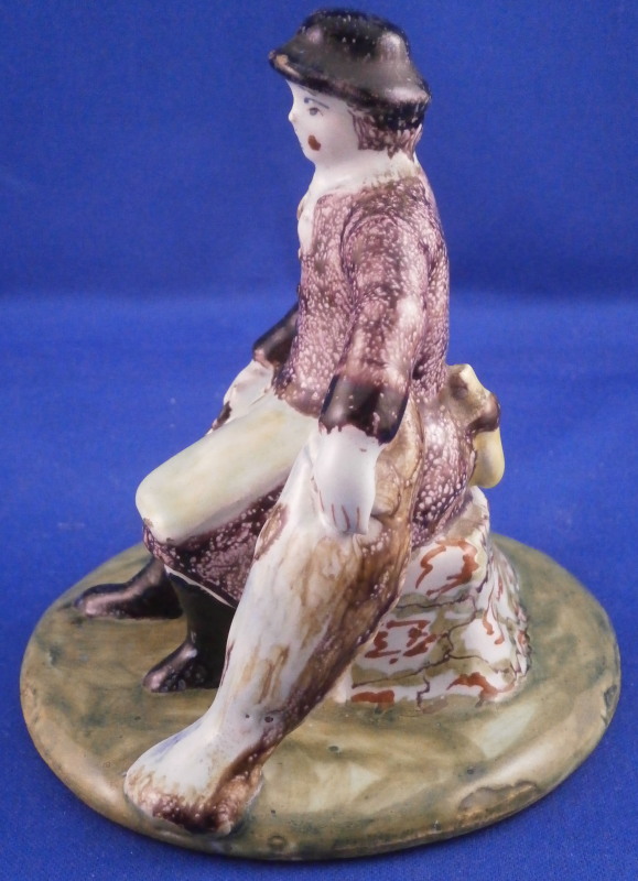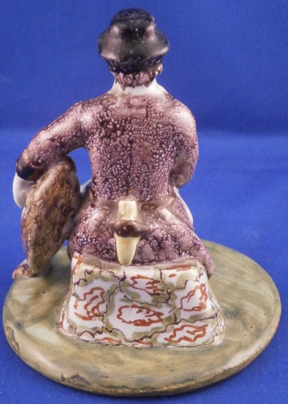 This is a polychrome Dutch Delft figurine of a fish seller made in the Netherlands in the 18th century around 1760. The piece is possibly the lid of a butter tub but could also have been sold separately as decoration. The figural piece has a flat base with the figure sitting on top of a colorful rock. It is holding a large fish in the left hand and what looks to be a key in the right hand. Typical colors fo these early pieces and it is in really nice condition. Just three small chips to the edge of the hat and two to the apron bottom edge. None take away from the piece at all! These polychrome hand painted Delftware / tin glazed earthenware pieces are not easy to find. The piece is marked with a blue line on the underside as shown. It is about 4.25 inches tall with a diameter of around 4 inches. Please email me for more information or other pictures.