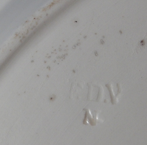 This is a rare plate made by DelVecchio around 1800. It is made of creamware and in the center there is a nice vase painted with an ancient greek type figural decoration on it. The rim has a black brown and white design on it. The plate is in great condition with a few bubbles that popped during the making and exposed the unglazed base underneath and an area of black tiny spots on the rim. All these are from the original making. A small area of stained crazing underneath and two tiny spots of paint flaking on the brown band on the rim and two spots where the glaze is missing underneath (also from the making). It is marked underneath with the impressed FDV over N mark. The plate is 1 inch tall and 9.375 inches in diameter. Please email me for more information or other pictures.