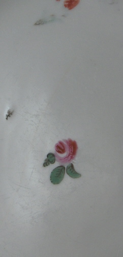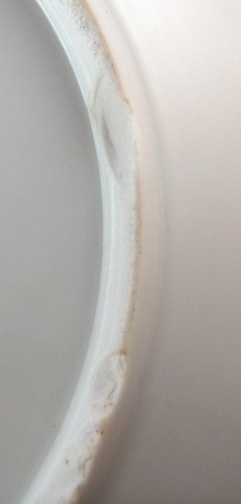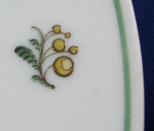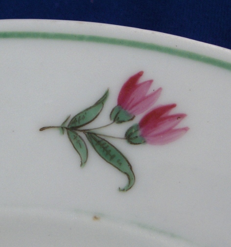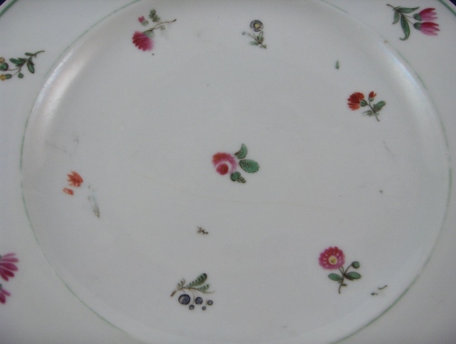 This is a rare porcelain plate made by Del Vecchio in the late 18th century. It is handpainted with a nice scattered flower design as well as a light green ring around the rim. Their wares are very ahrd to find and this is the first porcelain piece I own. It is quite simple yet very elegant and typical Italian in the style of the flowers, etc. The plate is in decent condition with a hairline in the center which is easier to spot from the udnerside and completely stable, a few chips to the footring and some wear from use as shown. It is marked underneath with an incised 16 and it has three stilt marks from the firing process. The plate is a little over 1.25 inches tall and 9.375 inches in diameter. Please email me for more information or other pictures.