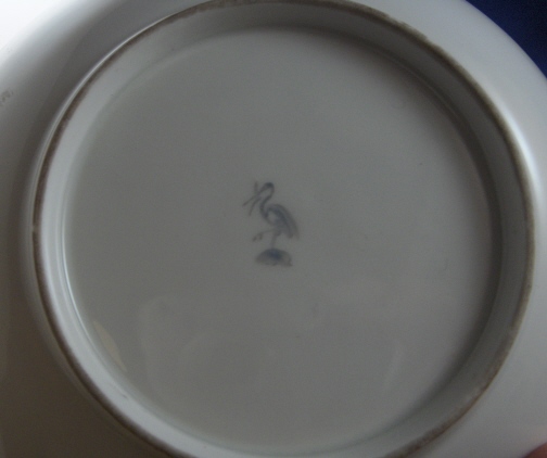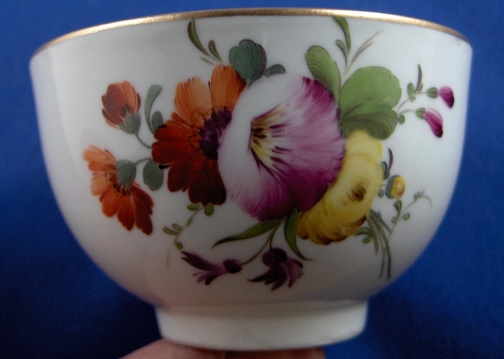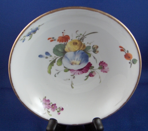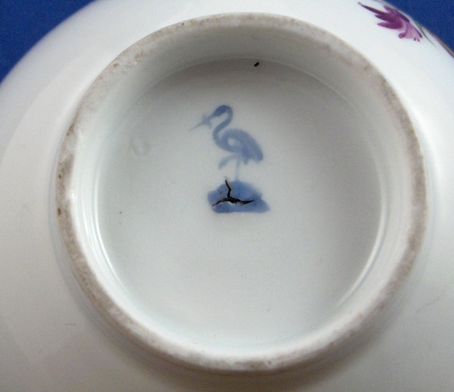 This is a cup (handleless)and saucer made by The Hague around 1780. It is handpainted with nice flowers and a gold trim. Both pieces are in good condition with the gold trim having some wear and a bit of touch up of the gold trim. There is a firing crack underneath the cup but it doesn't show through at all. Both pieces are marked with the above glaze blue stork mark and an incised number 2 or 3. The cup is 1.75 inches tall and 3 inches in diameter. The saucer is 1.25 inches tall and 5.125 inches in diameter. Please email me for more information or other pictures.