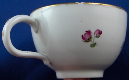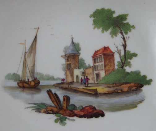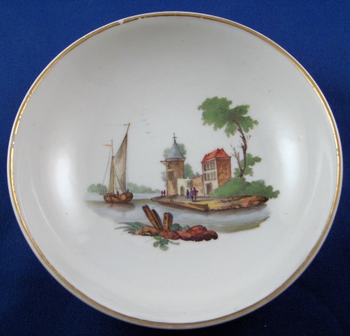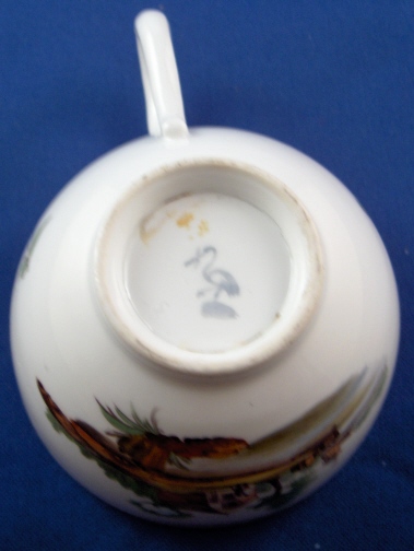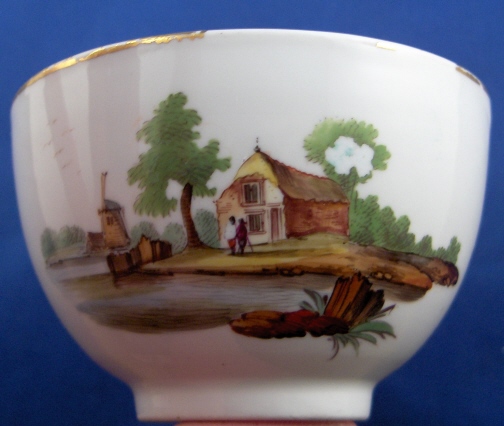 This is a cup and saucer made by The Hague around 1780. Both pieces are handpainted with a superb scene as well as a gold trim to the edge. The set is in great condition with some wear to the gold trim mainly to the cup rim and the cup has two areas in the trees in the scene where the pain has flaked off a bit and on one figure. No chips, hairlines, etc. Both pieces are marked with the above glaze blue stork mark. The cup is just under 2 inches tall and 3.125 inches in diameter. The saucer is 1.25 inches tall and 5.125 inches in diameter. Please email me for more information or other pictures.