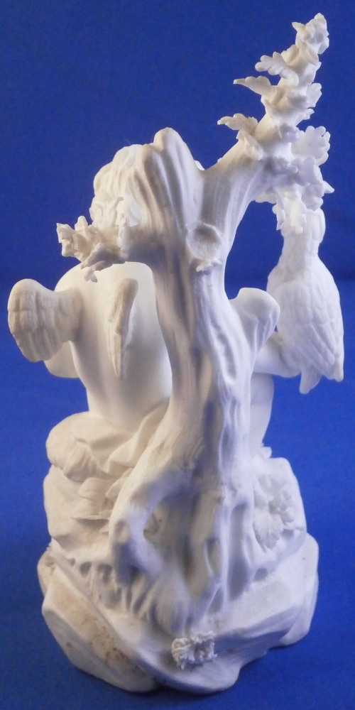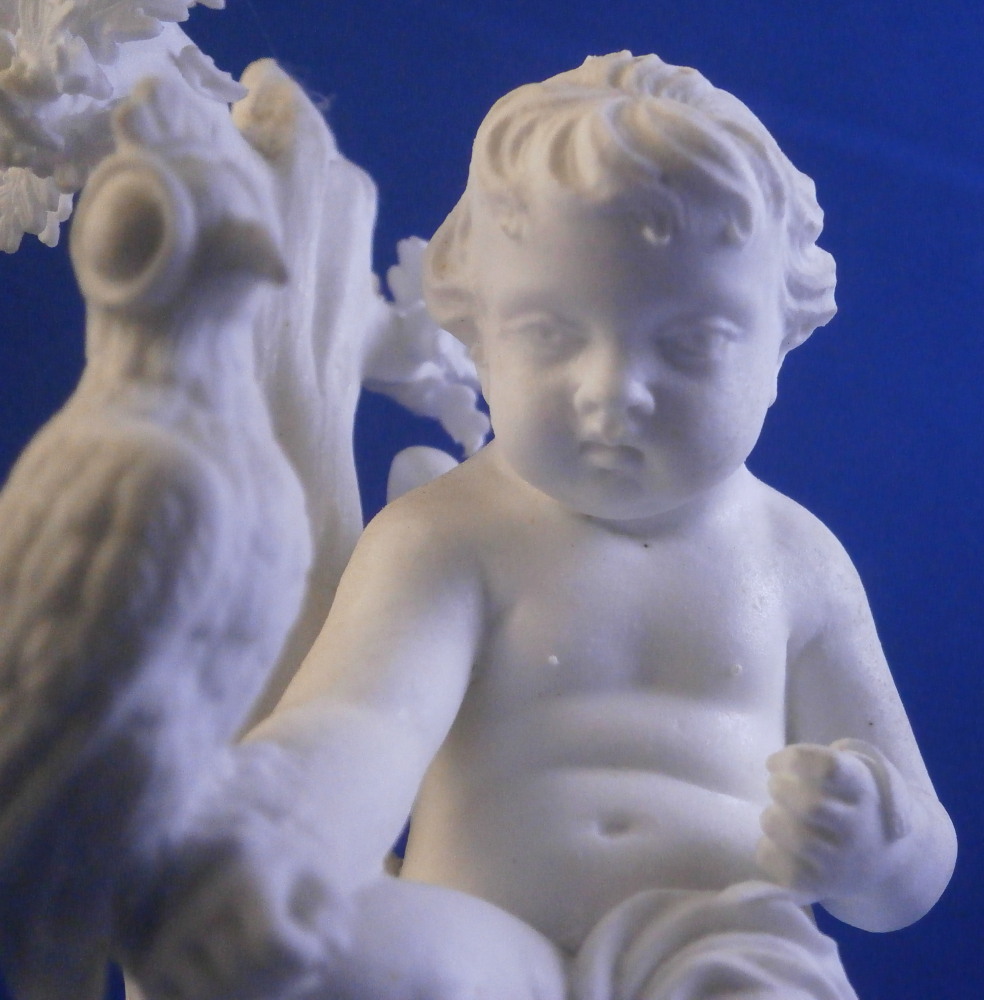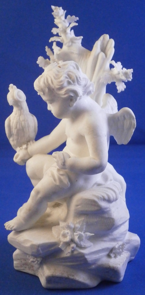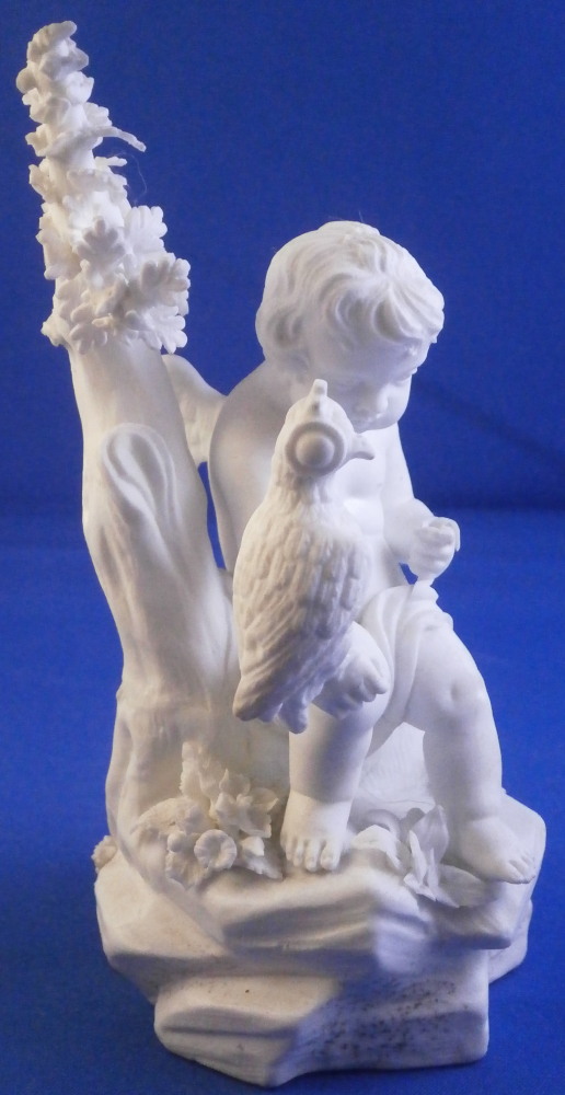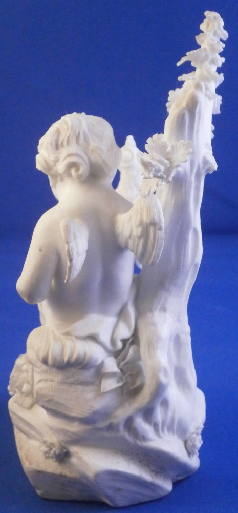 This is a rare and fun biscuit porcelain figurine made by Derby in the 18th century. Unglazed porcelain like this was meant to imitate marble which it does very well and white pieces like this were much more expensive than painted ones. The figure is of cupid / amor / eros with a falcon and a tree. Modeled by Nicholas Gauron.The cherub is sitting on a typical rock base with a small cloth covering his mid section and has the bird sitting on his right hand. There are some flowers and grasses on the base with a tree in the back. The figure displays superbly but has a few minor issues. There used to be a line going from his left hand to the bird which is gone (to be expected since it is rather thin), chips to four leaves of the flowers on the base and some chipping to the leaves of the tree though it is in better condition than msot one sees. There is a spot in the back of it where there might have been another branch but I am not sure. Some kiln dust along the bottom of the base as shown from when it was made. All in all a really superb piece! The figurine is marked underneath as shown with the model No. 213 as shown. The piece is about 5.125 inches tall, 2.25 inches wide and 2.5 inches deep. Please email me for more information or other pictures.