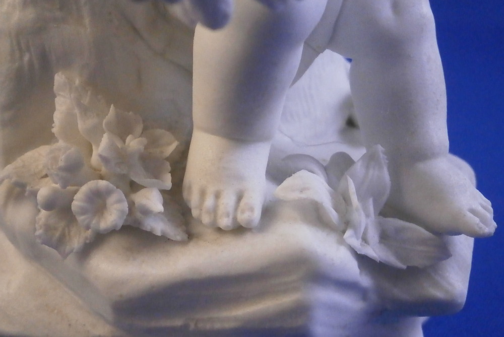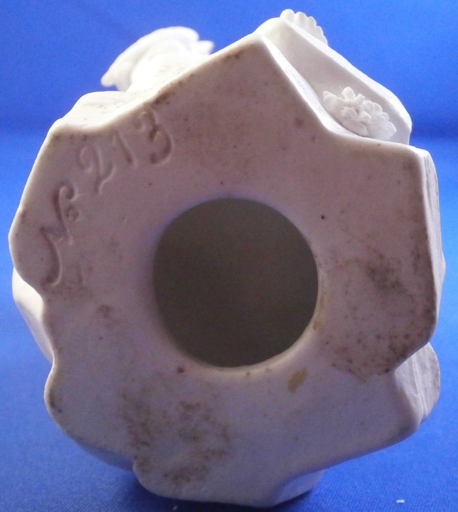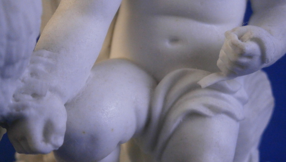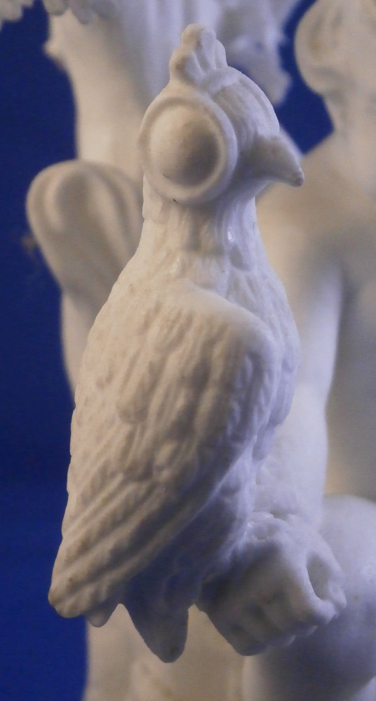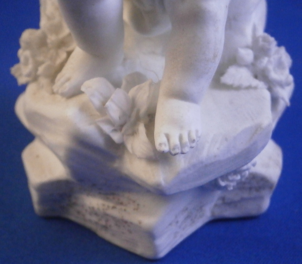 This is a rare and fun biscuit porcelain figurine made by Derby in the 18th century. Unglazed porcelain like this was meant to imitate marble which it does very well and white pieces like this were much more expensive than painted ones. The figure is of cupid / amor / eros with a falcon and a tree. Modeled by Nicholas Gauron.The cherub is sitting on a typical rock base with a small cloth covering his mid section and has the bird sitting on his right hand. There are some flowers and grasses on the base with a tree in the back. The figure displays superbly but has a few minor issues. There used to be a line going from his left hand to the bird which is gone (to be expected since it is rather thin), chips to four leaves of the flowers on the base and some chipping to the leaves of the tree though it is in better condition than msot one sees. There is a spot in the back of it where there might have been another branch but I am not sure. Some kiln dust along the bottom of the base as shown from when it was made. All in all a really superb piece! The figurine is marked underneath as shown with the model No. 213 as shown. The piece is about 5.125 inches tall, 2.25 inches wide and 2.5 inches deep. Please email me for more information or other pictures.