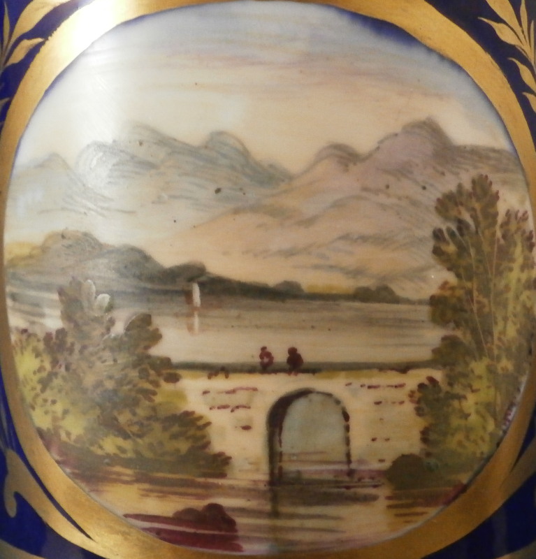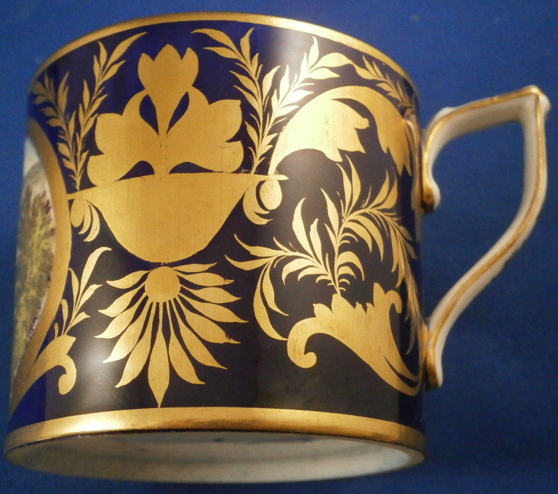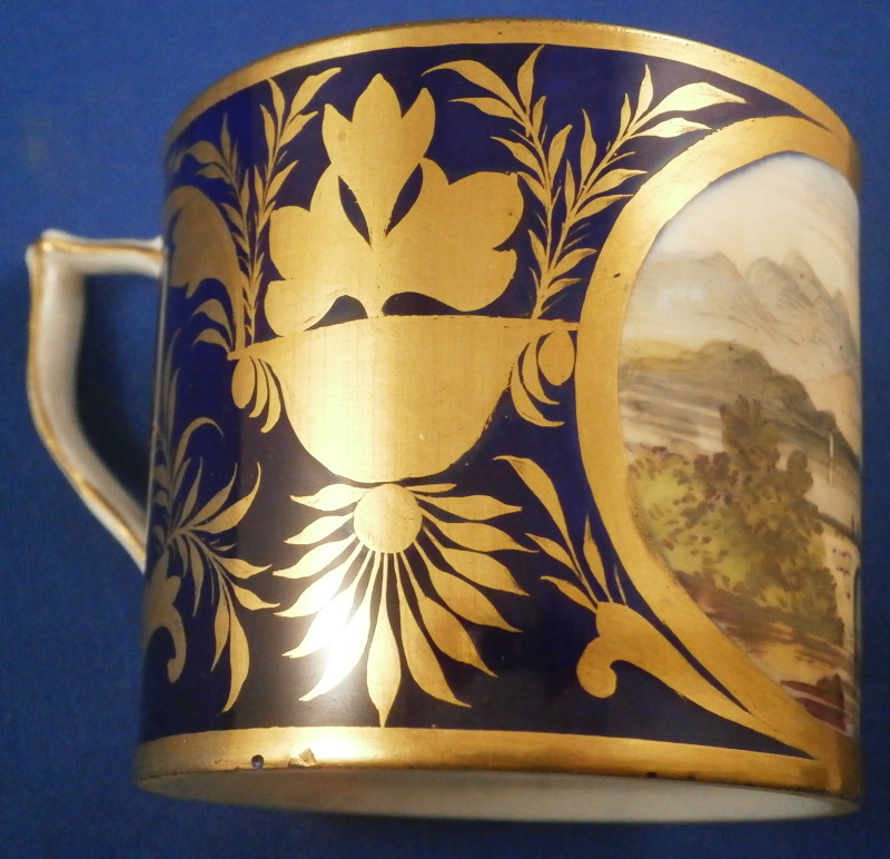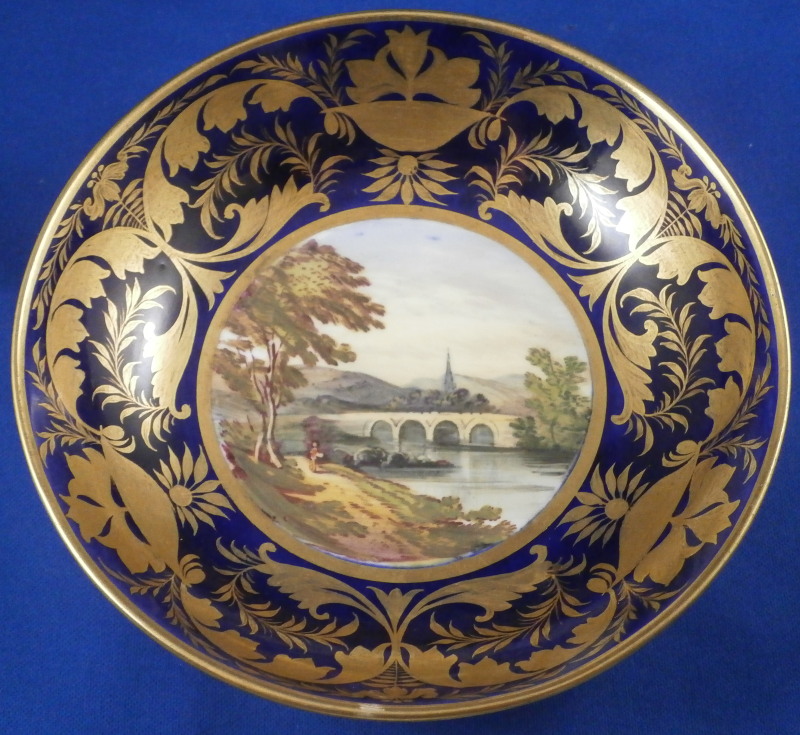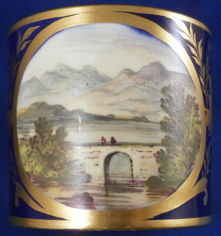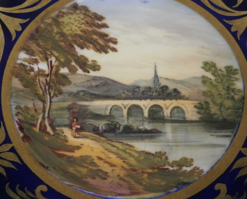 This is a really nice cup and saucer made by Derby in the late 18th century. Both pieces have a deep blue ground color with some nice fancy gilding over that and a hand painted scene with a view that is named underneath each piece. Nice handle shape on the cup! The set is in terrific condition for its age with some minor wear to the gold trim which is in much better conditon than almost any I ahve seen before. There is the tiniest of munchers to the foot edge of the cup about 1mm by 1mm which is gilded over and likely from when it was made. A minor foot ring chip to the saucer as shown. The set displays perfectly! Both pieces are marked with the puce crown D mark as well as In Derbyshire on the saucer and Callander Bridge on the cup. The saucer is 1.375 inches tall and 5.5 inches in diameter. The cup is 2.25 inches tall and 2.625 inches in diameter. Please email me for more information or other pictures.