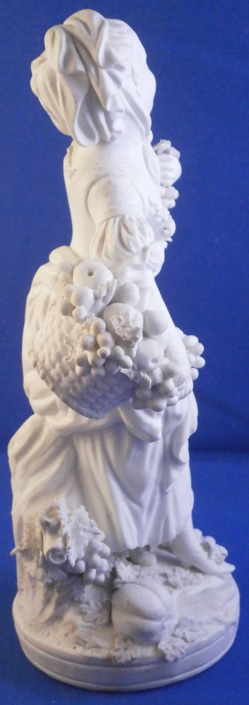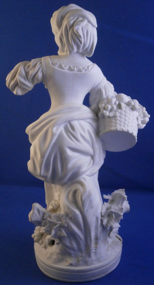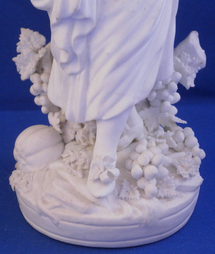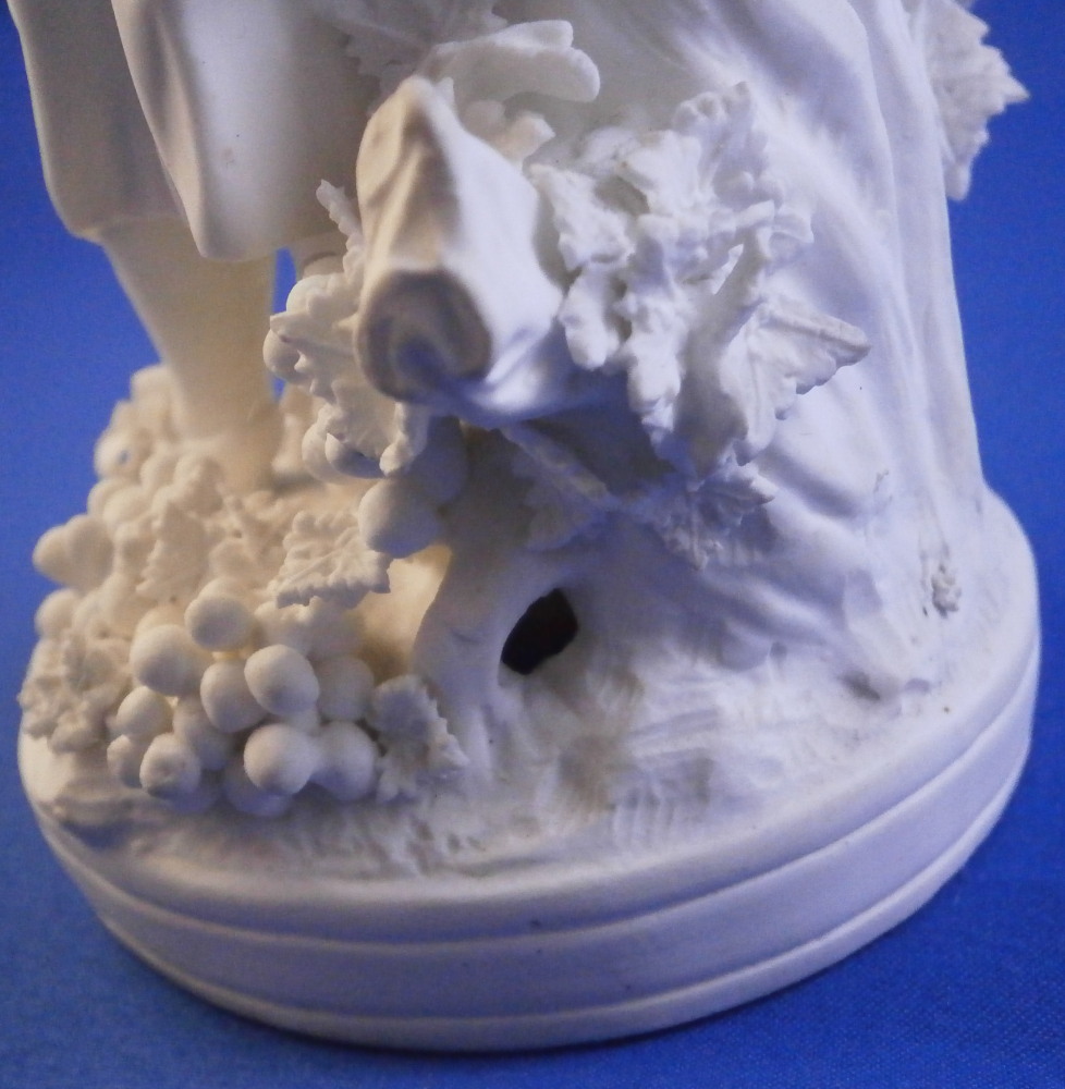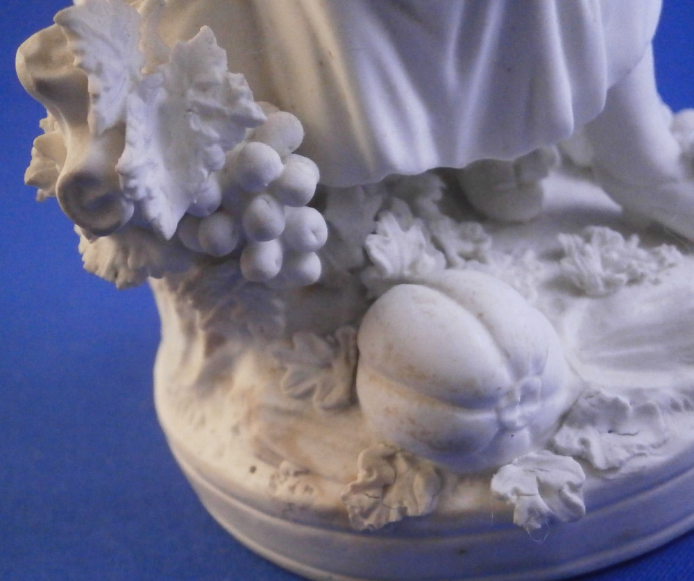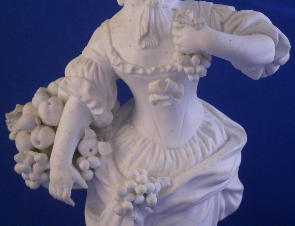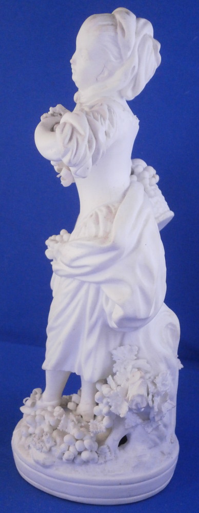 This is a rare and superb biscuit porcelain figurine made by Derby in the 18th century. Unglazed porcelain like this was meant to imitate marble which is does very well and white pieces like this were much more expensive than painted ones. The figure is of a lady wearing a nice outfit holding a basket under her right arm, a bunch of grapes in her left hand while standing on a base with grapes and a pumpkin on it and a tree stump behind her with two short branches growing out of it. It's a really well modeled figure with ton of detail as are many that are made of biscuit porcelain. A really nice looking piece that is in great condition. Even the bows on her shoes and on her dress are in great shape except for one loop having been damaged on her dress and two on the front shoe. A few leaves are damaged on the piece which is to be expected and the braided handle of the basket is gone. None of this is obvious at all and the figurine displays perfectly! The figure is in amazing condition compared to most one sees of this type. The figurine is marked underneath as shown with the No. 123, an incised triangle, incised maker's mark plus the letters sml as shown. The figurine is about 6.75 inches tall, 3.625 inches wide and 2.5 inches deep - so fairly large for an unglazed piece! Please email me for more information or other pictures.