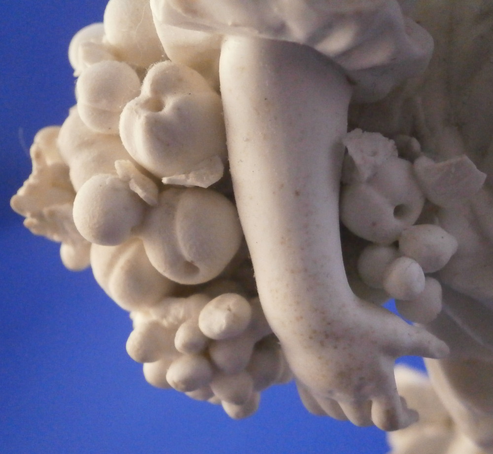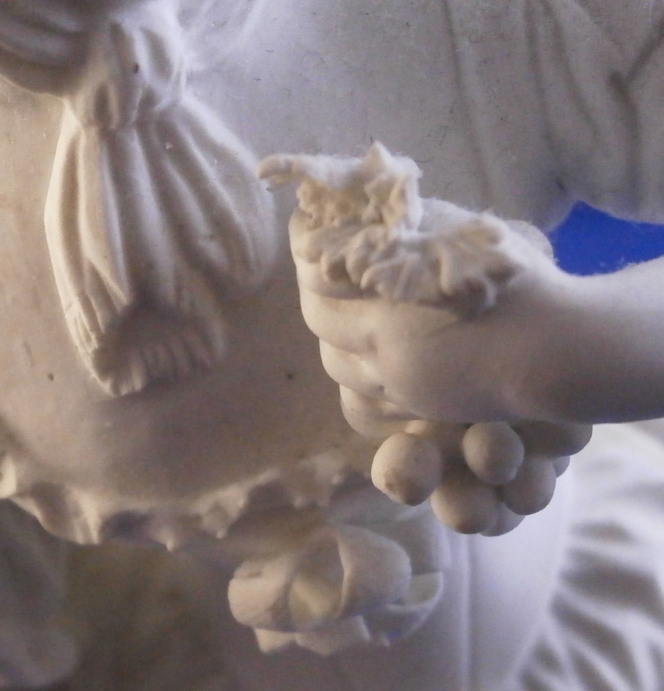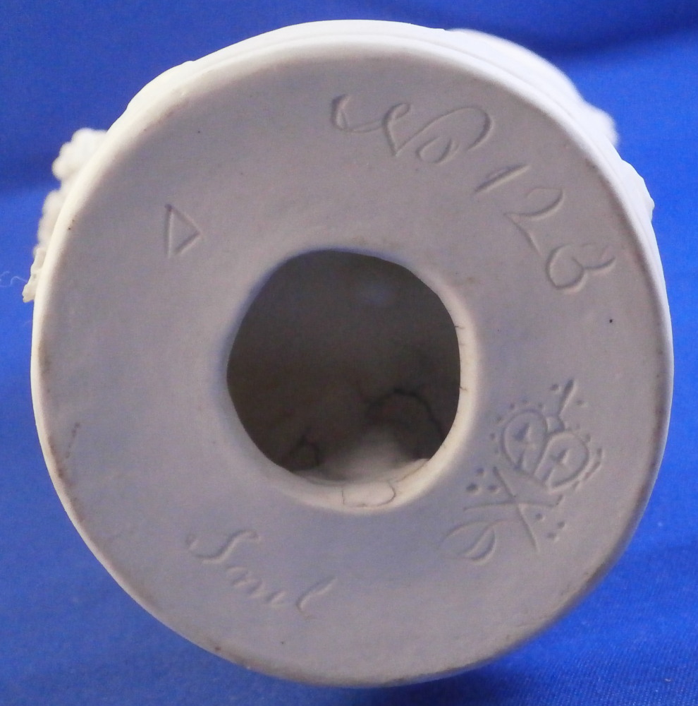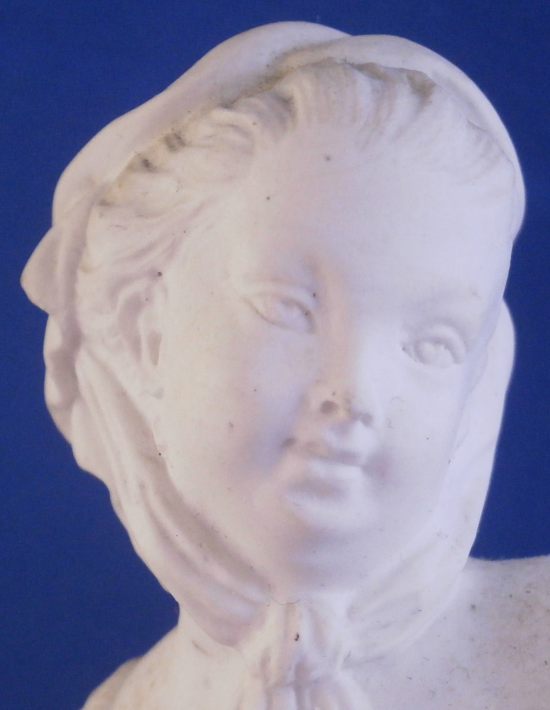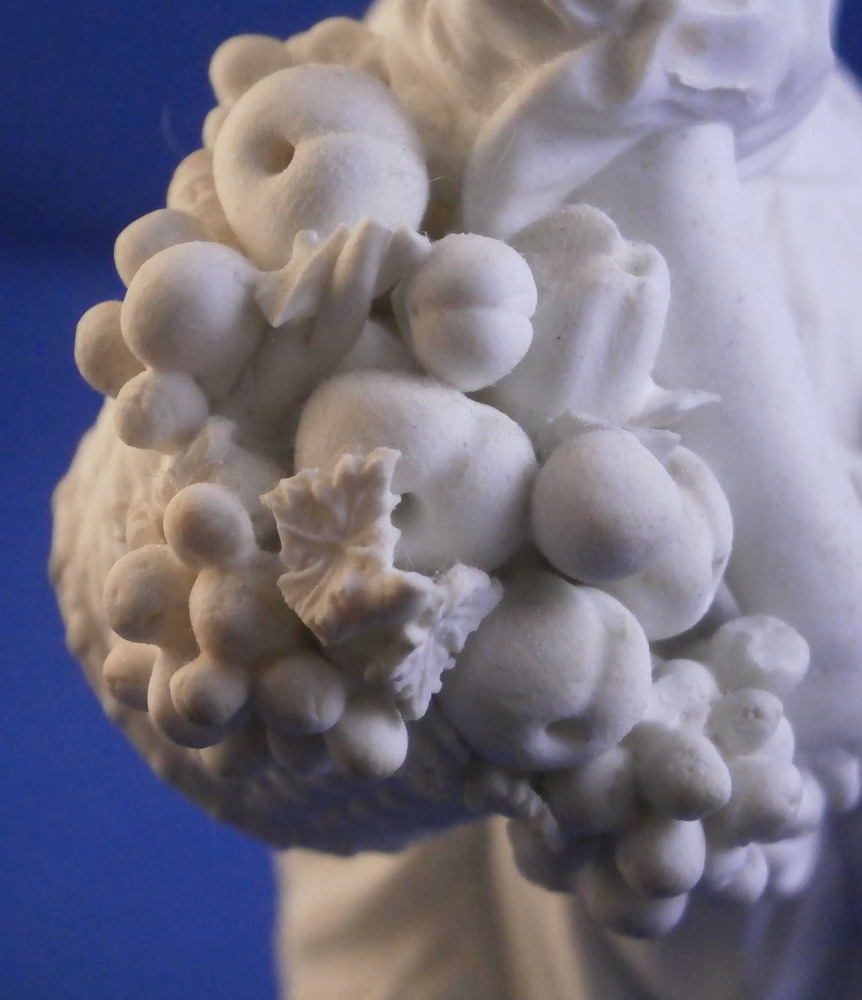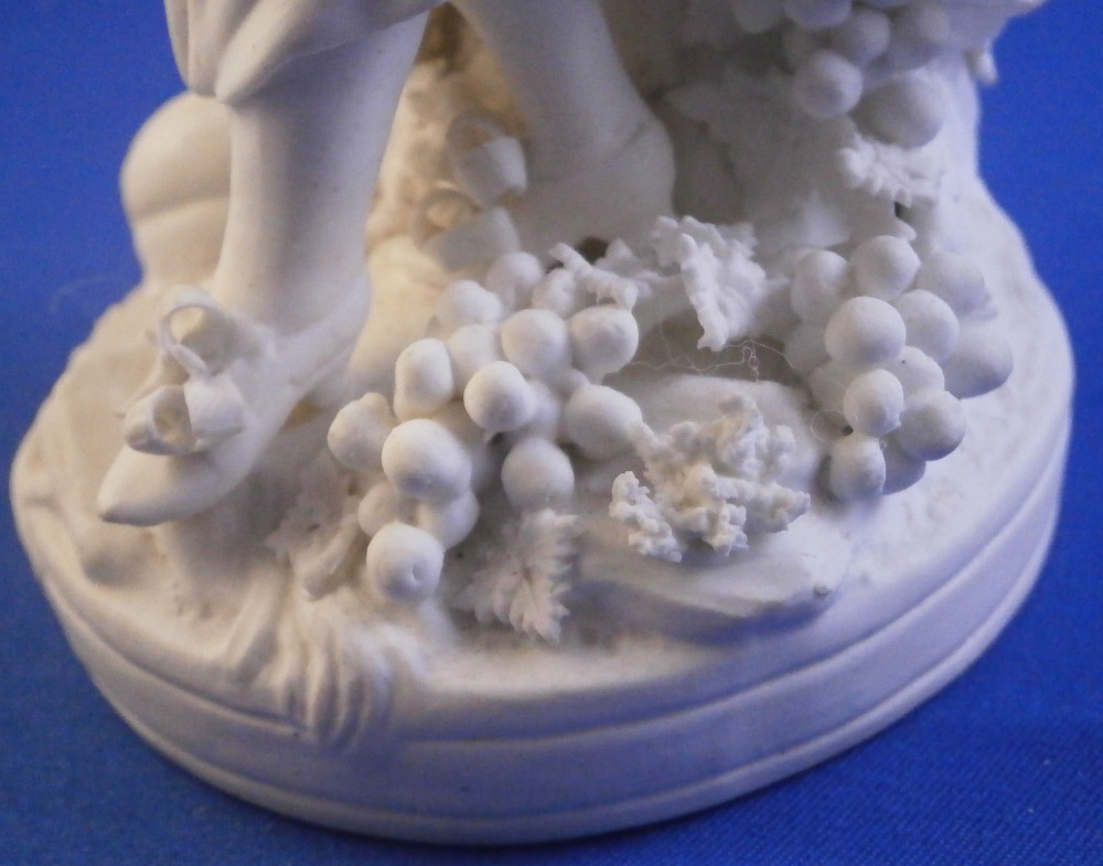 This is a rare and superb biscuit porcelain figurine made by Derby in the 18th century. Unglazed porcelain like this was meant to imitate marble which is does very well and white pieces like this were much more expensive than painted ones. The figure is of a lady wearing a nice outfit holding a basket under her right arm, a bunch of grapes in her left hand while standing on a base with grapes and a pumpkin on it and a tree stump behind her with two short branches growing out of it. It's a really well modeled figure with ton of detail as are many that are made of biscuit porcelain. A really nice looking piece that is in great condition. Even the bows on her shoes and on her dress are in great shape except for one loop having been damaged on her dress and two on the front shoe. A few leaves are damaged on the piece which is to be expected and the braided handle of the basket is gone. None of this is obvious at all and the figurine displays perfectly! The figure is in amazing condition compared to most one sees of this type. The figurine is marked underneath as shown with the No. 123, an incised triangle, incised maker's mark plus the letters sml as shown. The figurine is about 6.75 inches tall, 3.625 inches wide and 2.5 inches deep - so fairly large for an unglazed piece! Please email me for more information or other pictures.