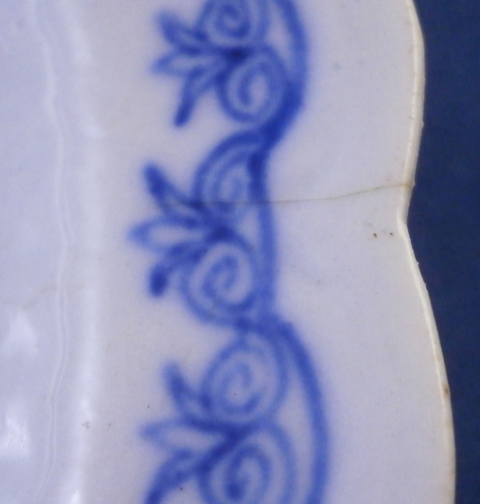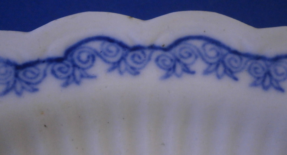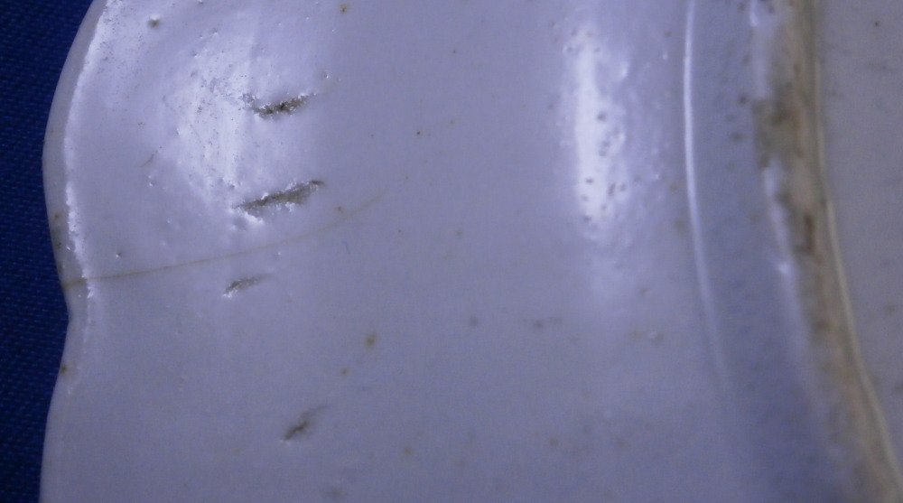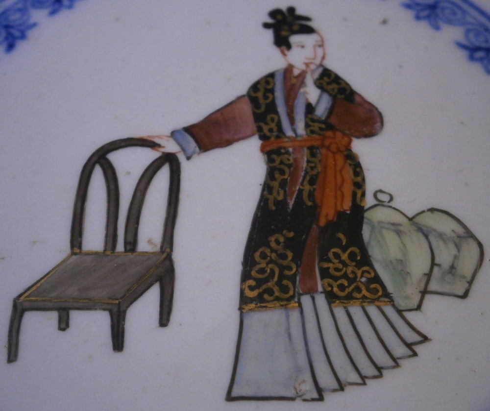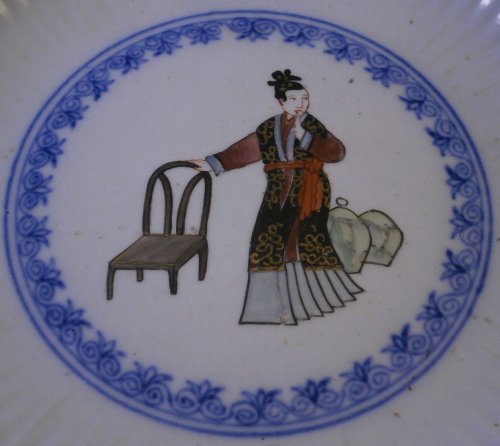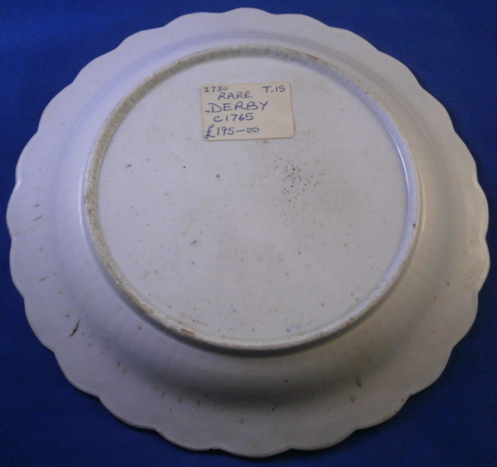 This is a really nice and early plate made by Derby around 1760. A small plate with a ncie shape to it that is decorated with a bit of a relief design to the paste along the edge below which there is hand painted blue trim all around followed by a ribbed design to the paste around the edge of the well and an amazing hand painted polychrome Chinoiserie scene in the center surrounded by a matching blue trim. The scene is of an Asian lady holding onto a chair with some pots in the background. She is dressed in a traditoal outfit. An unusual and rare design for this maker. A really fun plate that is quite different from all others I have come across over the years so it was a must have! The plate is in great condition with a small hairline to the edge shown from both above and below (about 0.625 inches long and stable!) There are some small manufacturing spots on top which stem from both flaws in the paste and a bit of kiln dust. The underside has a lot more manufacturing flaws to it as shown. A rare plate and it displays superbly. Not one you will find again anytime soon! The plate is not marked which is not uncommon on their early wares. It is 0.875 inches tall and 6.75 inches in diameter so on the smaller side. Please email me for more information or other pictures.