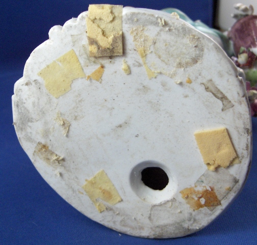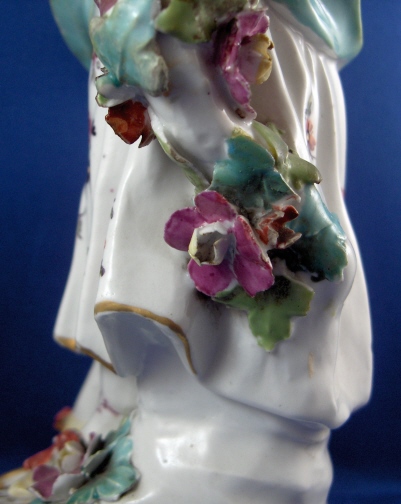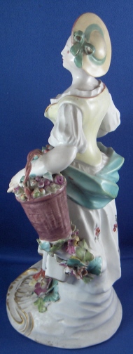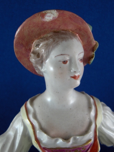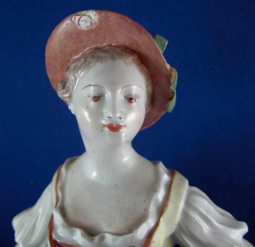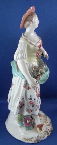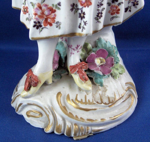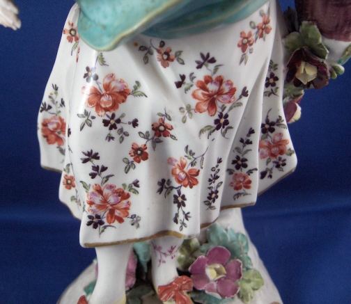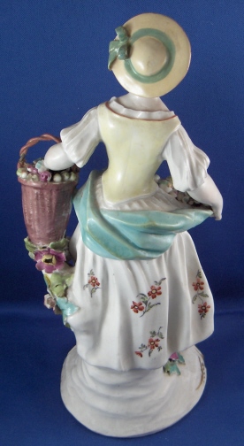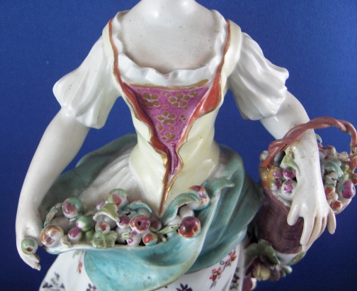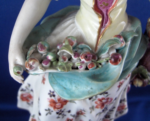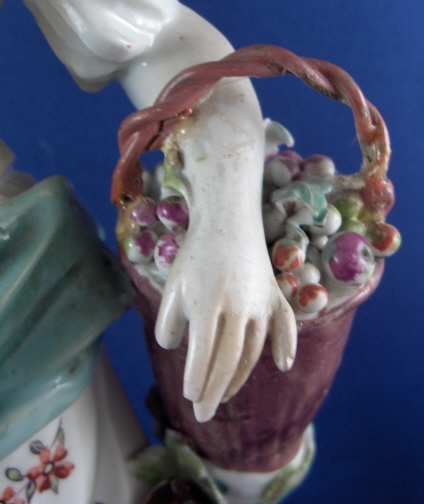 This is a figurine of a lady made by Derby in about 1756-60. The lady is very well modeled and quite beautifully painted especially her dress! She has what look to be apples in her apron and a basket of fruit on her left arm. Like I said the dress is painted with beautiful and high quality flowers and there are lots of molded flowers on the base and by the basket. The figurine is in amazing condition considering her age! The basket handle is a well done replacement, one loop of the bow on her right foot is restored, there is a shallow chip to her hat, the bow on top of her hat is restored, her pinky on her left hand is restored and there are one or two minor chips to the leaves and flowers but all in all these are all minor things. A firing crack in her left leg was overpainted during the making with puce flowers. She is unmarked underneath but that's common as well but does have three light patchmarks. The figurine is 9.5 inches tall, 4.5 inches wide and 3.75 inches deep. Please email me for more information or other pictures.