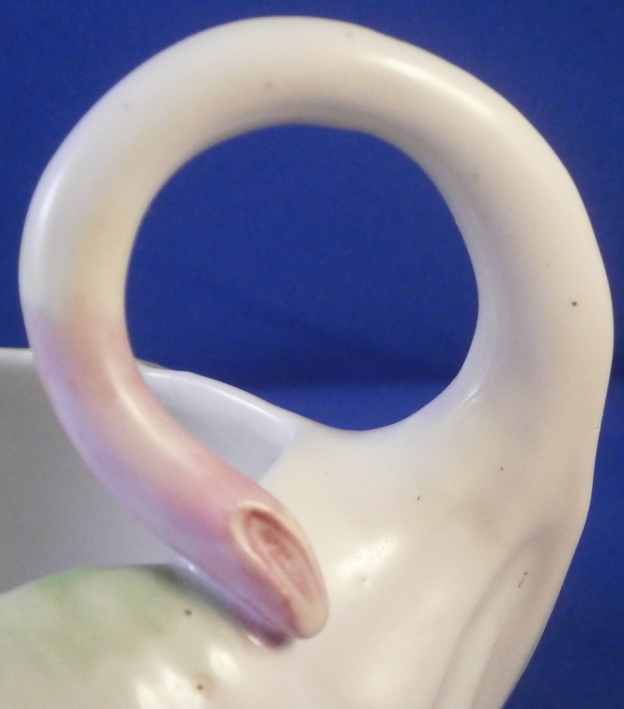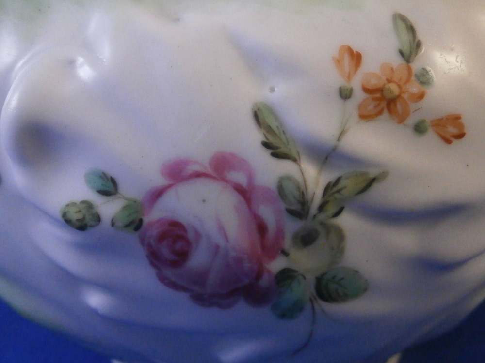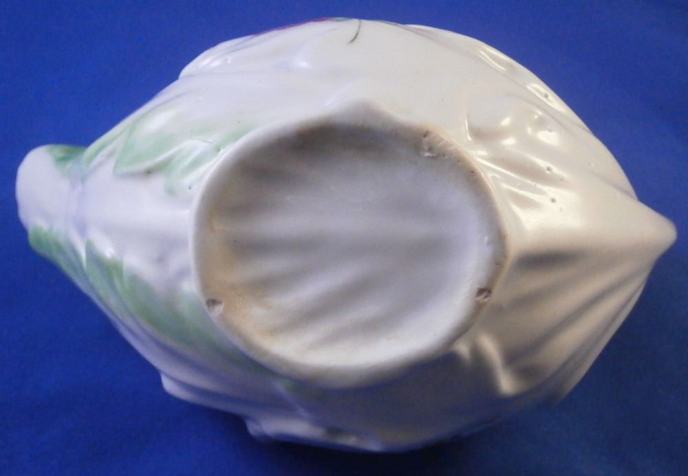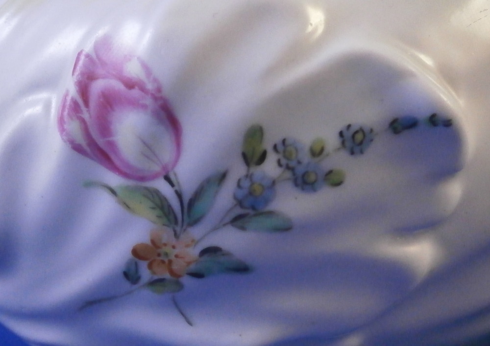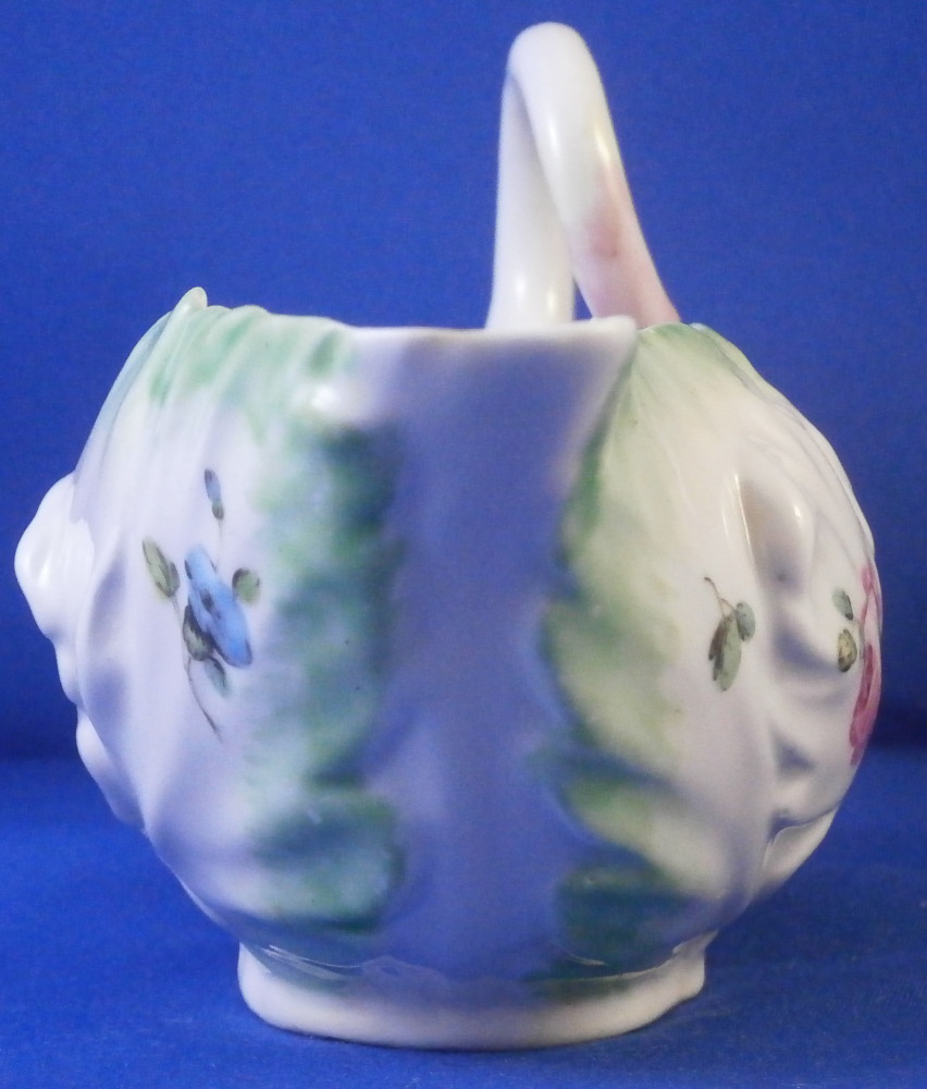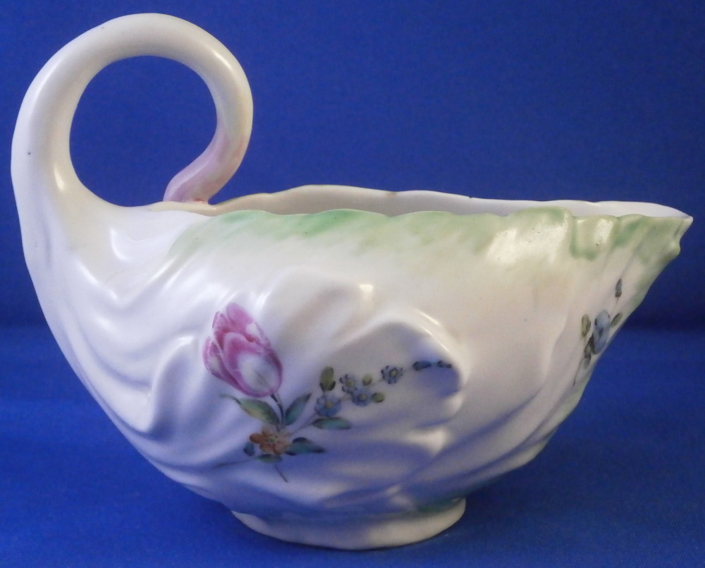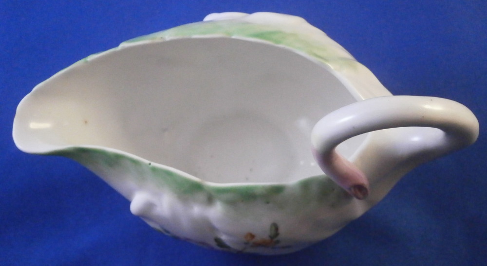 This is a superb little cream or sauce boat type dish made by Derby in the 18th century. A really cute model one does not see often at all! It has a really nice shape to it with a relief leaf design to the outside with the end forming a curled up stem handle. Painted with green trim to the top edge, a pink end to the handle and a superb hand painted floral arrangement to each side plus a single flower and leaf to finish off this example. The sauceboat is in great condition with a little bit of wear to the decoration and the handle has been expertly and invisibly restored. Not sure what was wrong with it. The piece displays perfectly! It is unmarked which is normal. The dish is about 3.75 inches tall including the handle, 5 inches from handle to spout and 2.875 inches wide. Please email me for more information or other pictures.