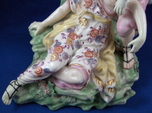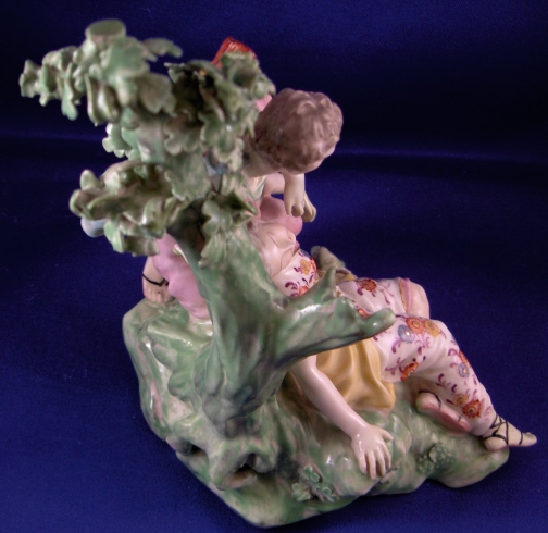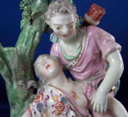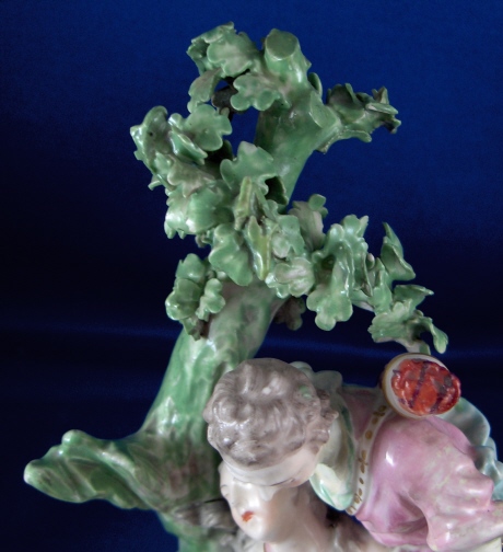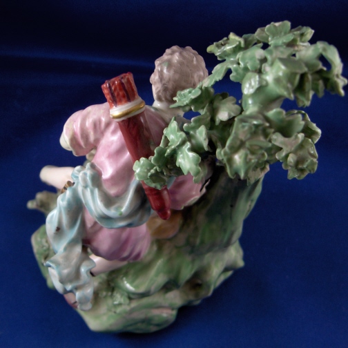 This is a rather large figurine of a hunter and a lady made by Derby in the 18th century. It is 7.25 inches tall, 4.5 inches wide and 6.5 inches deep. Quite a heavy piece! The figure is in good condition with some damage to the top of the tree that is not bad. Also some good restorations to his left arm, her left hand and some of her right fingers, her foot sticking out and his neck. They are well done but the restoration areas have turned greenish and thus one can tell. Never seen that before. I don't think the restorations are too extensive but it is hard to tell. It is a superb figurine when on display. The piece is only marked with the typical Derby number type mark - N75. It has the patch marks as well as the typical hole for a Derby piece so no doubt it is genuine. Please email me for more information or other pictures.