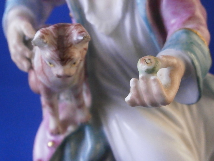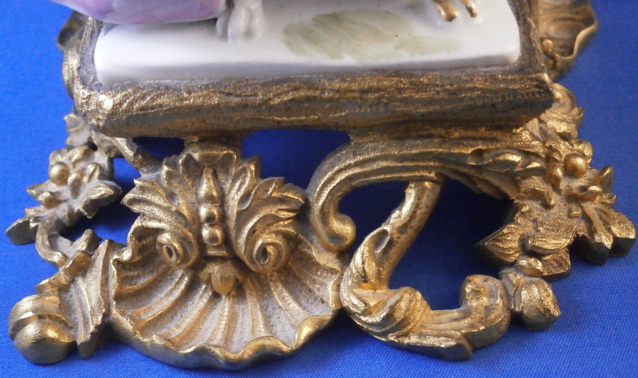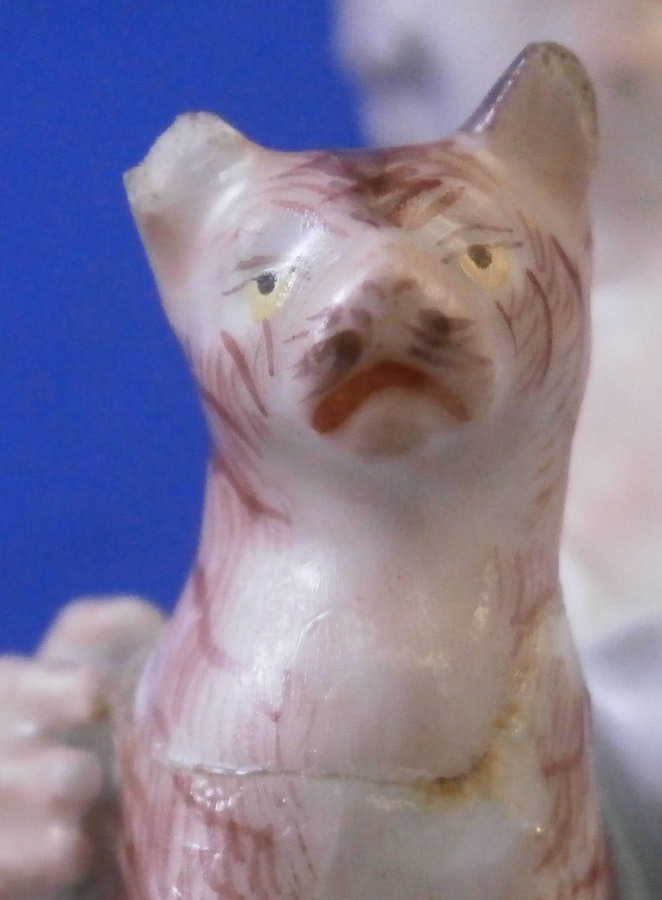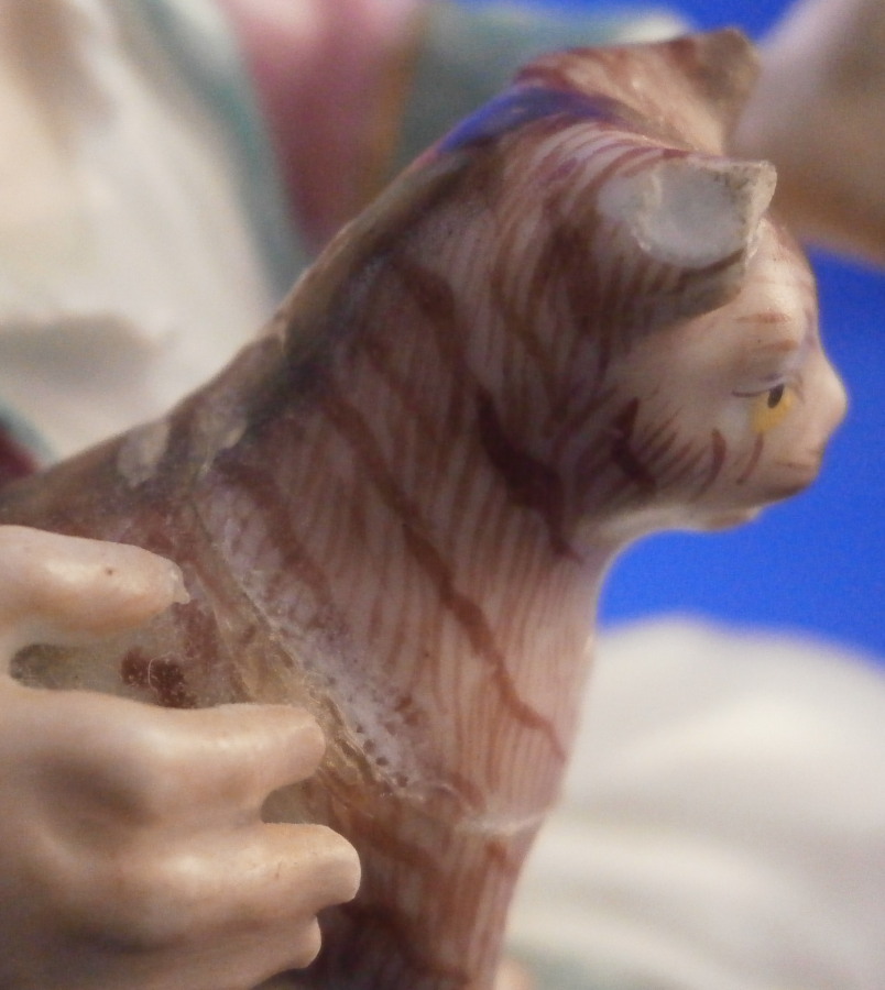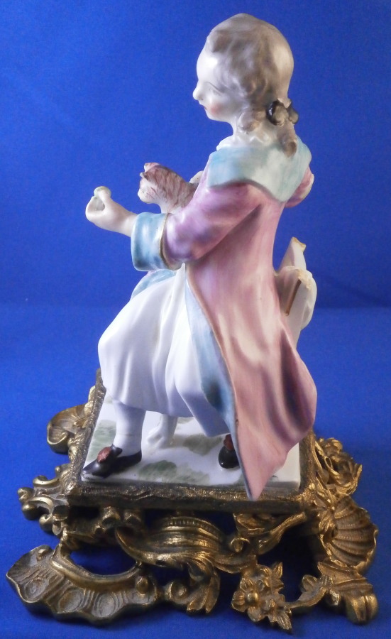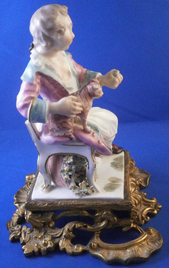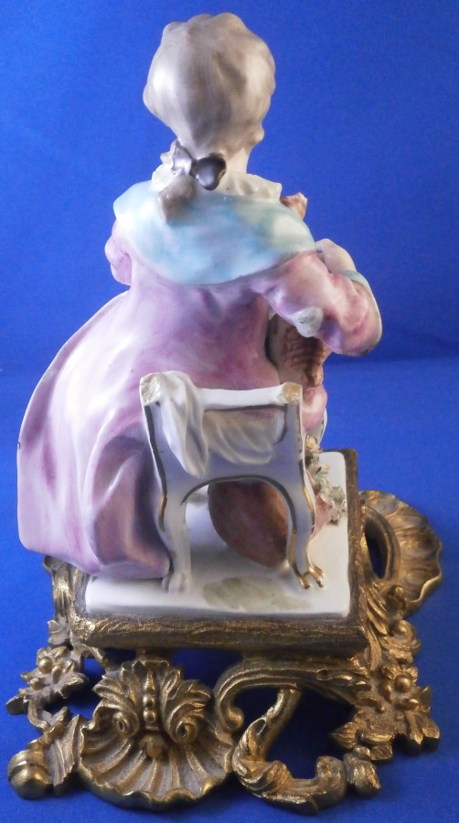 This is a figurine of a lady made by Derby in the 18th century around 1780. She is nicely modelled sitting in a chair with a cat in her lab and some sort of treat or toy in her left hand. A basket filled with flowers under the chair. Simple, flat square base which was spuced up by attaching it to an amazing ormolu bronze base with scrolls and flowers. It's a really nice base! The figure displays perfectly the cat has had a break to its neck fixed and she has a chip to her right ear, the lady has a crack in her right foot, a chip to her pinky finger on her left hand, the chair back is missing its top and some very minor damage to the flowers. The piece is unmarked underneath but is a known Derby model with the number 71. The figurine including the ormolu base is 6.625 inches tall, 4.625 inches wide and 5 inches deep. Quite heavy because of teh metal base. Please email me for more information or other pictures.