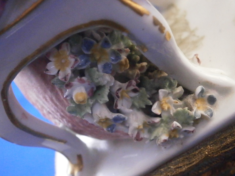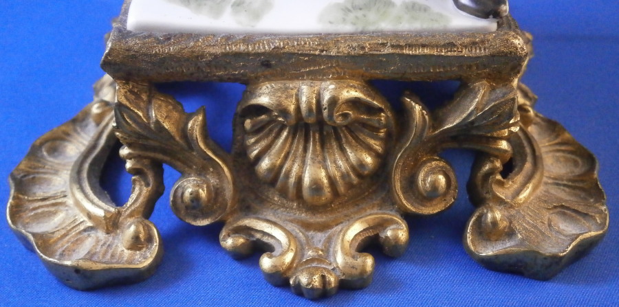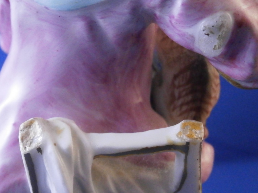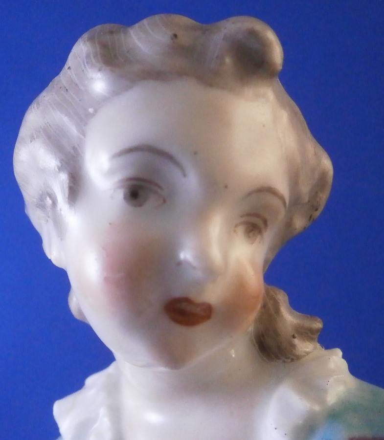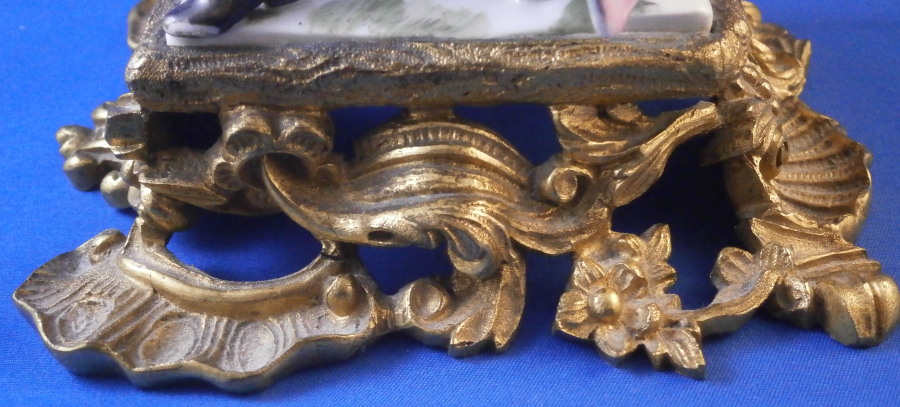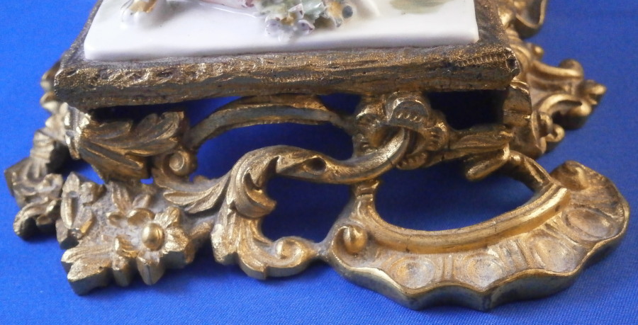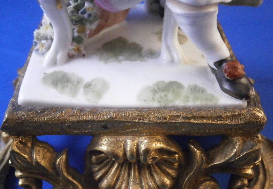 This is a figurine of a lady made by Derby in the 18th century around 1780. She is nicely modelled sitting in a chair with a cat in her lab and some sort of treat or toy in her left hand. A basket filled with flowers under the chair. Simple, flat square base which was spuced up by attaching it to an amazing ormolu bronze base with scrolls and flowers. It's a really nice base! The figure displays perfectly the cat has had a break to its neck fixed and she has a chip to her right ear, the lady has a crack in her right foot, a chip to her pinky finger on her left hand, the chair back is missing its top and some very minor damage to the flowers. The piece is unmarked underneath but is a known Derby model with the number 71. The figurine including the ormolu base is 6.625 inches tall, 4.625 inches wide and 5 inches deep. Quite heavy because of teh metal base. Please email me for more information or other pictures.