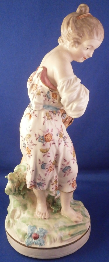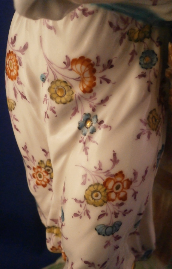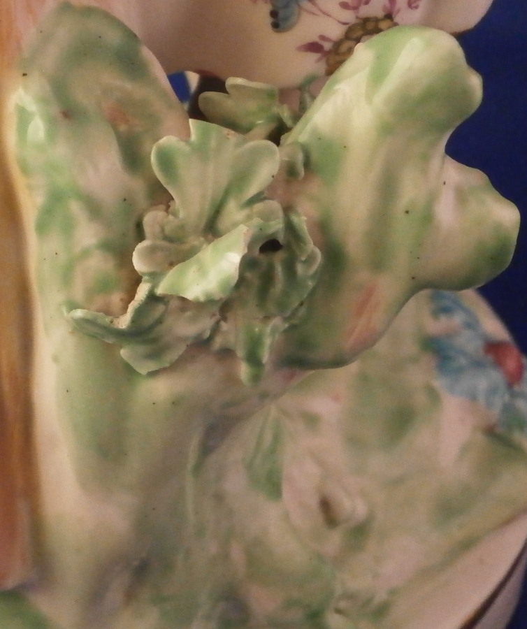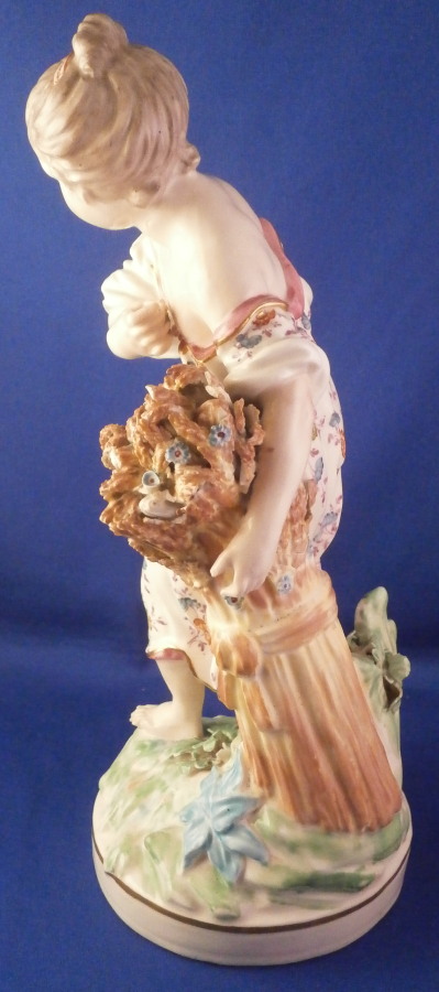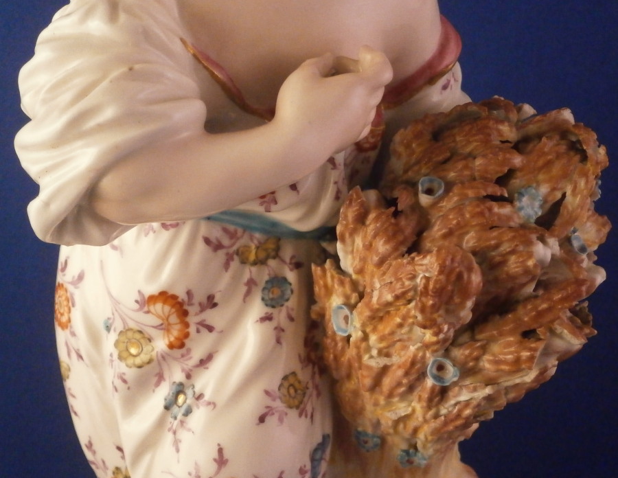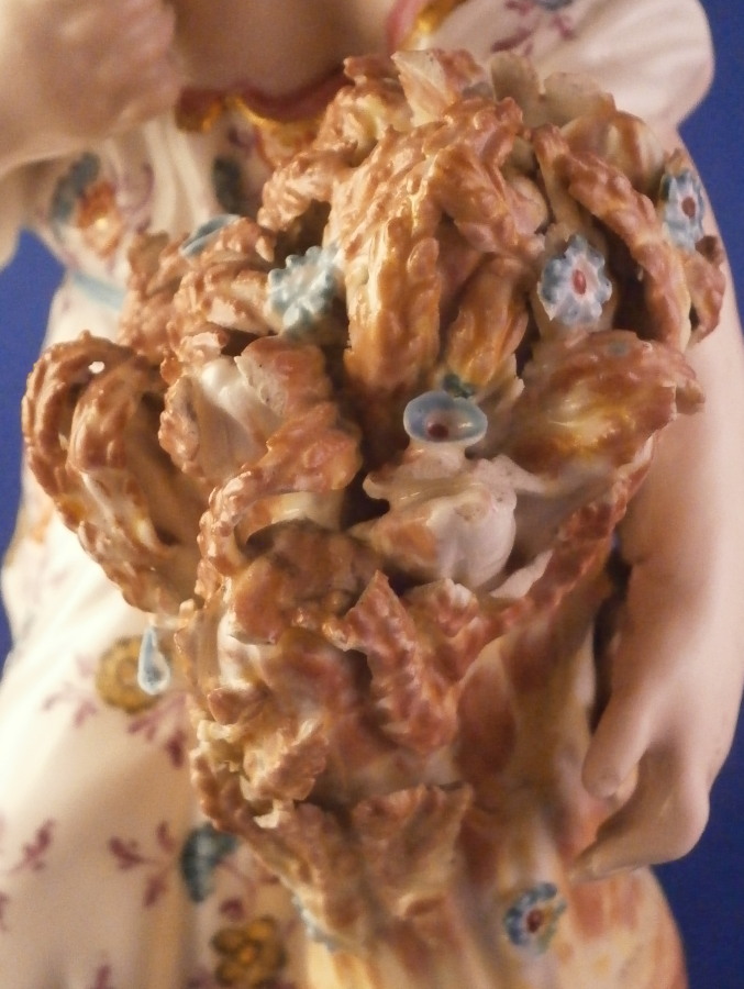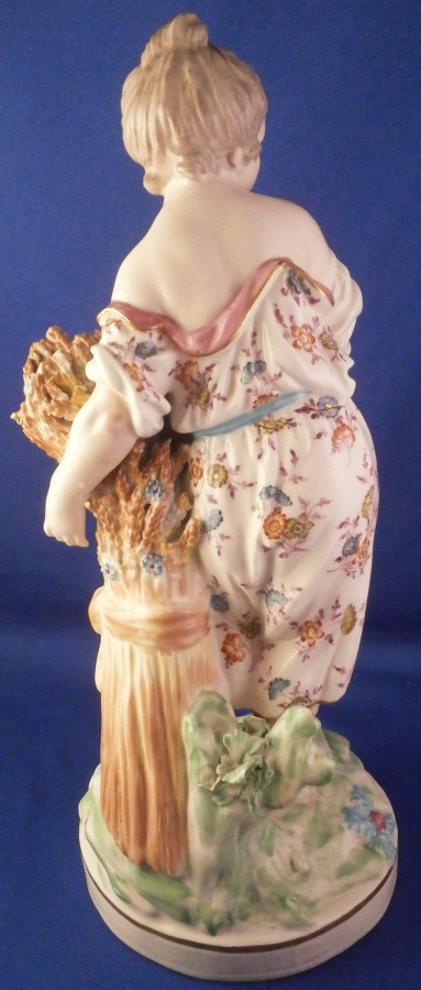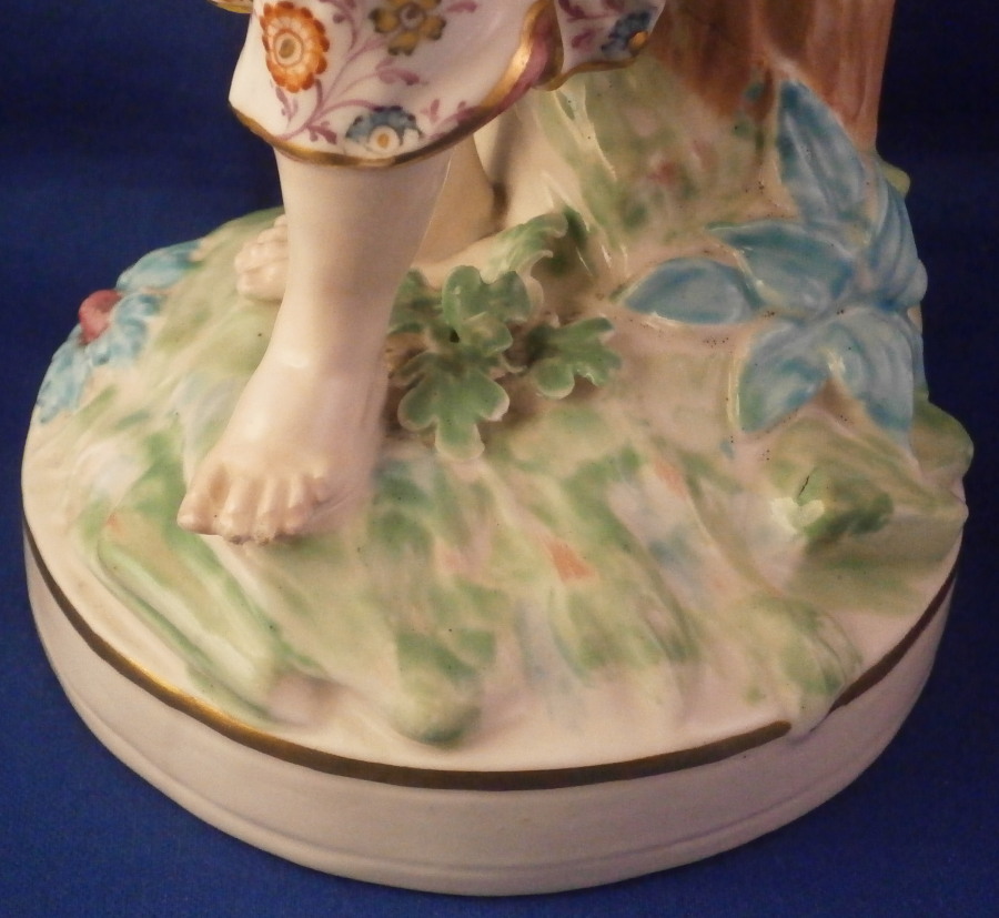 This is a figurine of a lady next to a sheath of wheat made by Derby in the late 18th century or very early 19th century. Emblematic of one of the four seasons figurines - summer in this case. The lady is very well modeled and quite beautifully painted especially the flowers on her dress! She is wearing a nice dress while standing barefoot on a round base that has some greenery to it and a gold trim around the edge. The wheat is next to her and there is a small tree trunk to the back with a few leaves on it. The figure displays superbly but there is a bit of damage to the wheat and a leaf in the back as well. Nothing that takes away from the piece at all! She is unmarked underneath except for some incised letters but that's common for this maker during this period and it does ahve the characteristic three light patchmarks. The figurine is 10.25 inches tall with a base diameter of 4 inches wide so a very nice size for a figurine! Please email me for more information or other pictures.