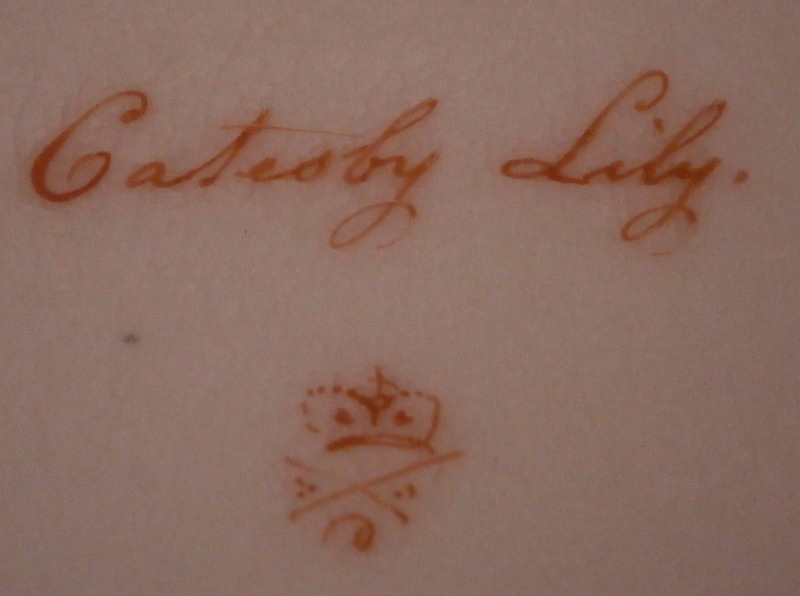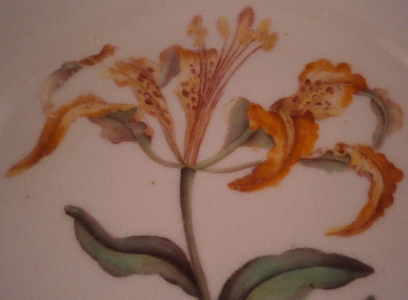 This is a really nice plate made by Derby in the early 19th century. It is hand painted with a superb flower in the center which according to the title in the back is a Catesby Lily which I find interesting sicne it is a native to the Southern US and not the UK. It's Latin name is Lilium catesbaei but it is more commonly known as Catesby's lily / pine lily / leopard lily / tiger lily (which I know it by) and Southern red lily and it is a native of the coastal regions of the Southeast from Florida to Louisiana and up to Virginia .A very nicely hand painted flower on a simple plate with a bit of gilding to the edge of the rim. It looks stunning! The plate is in great condition without any chips or repairs but it does ahve heavy fine crazing to the thick glaze which is pretty common to their wares from this period and a bit of wear to the flower and gilding. A small flaw in the foot ring which is glazed over and from when it was made. Still looks superb on display! It is marked with the red crown and crossed lines over the letter D as well as with the name of the flower in red as shown. There is also a 27 or 47 as a painter's mark - not sure which one it is. The plate is 1.25 inches tall and 8.875 inches in diameter. Please email me for more information or other pictures.
