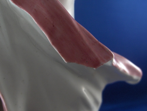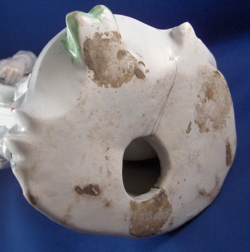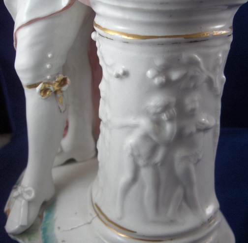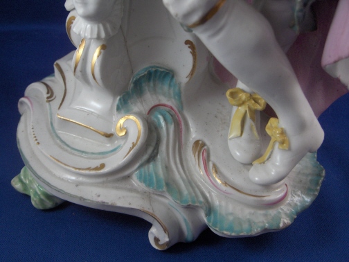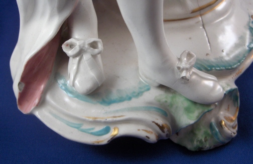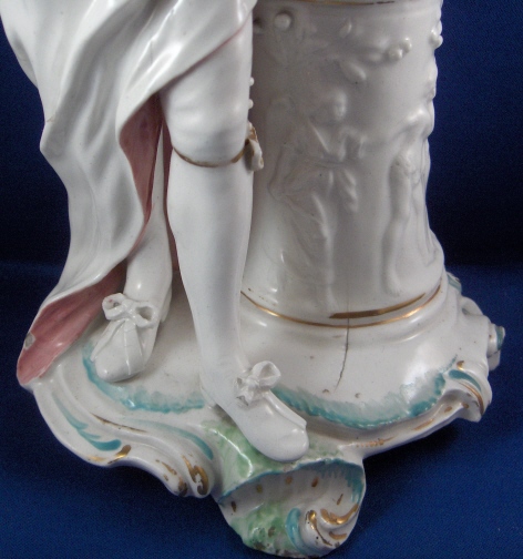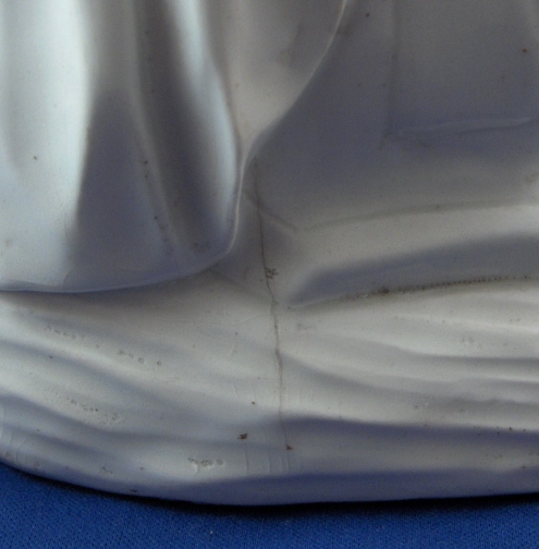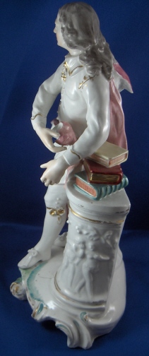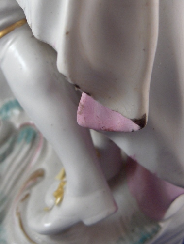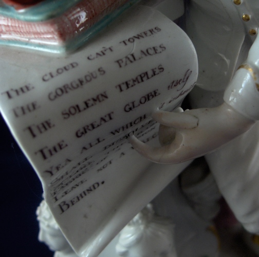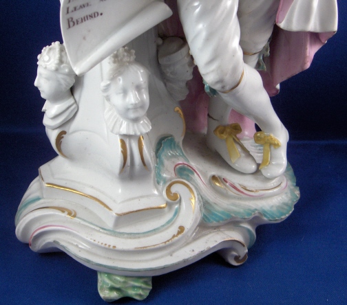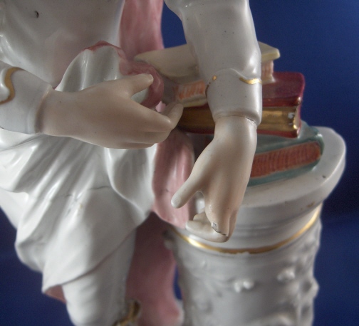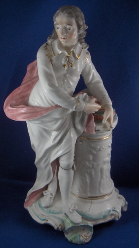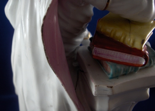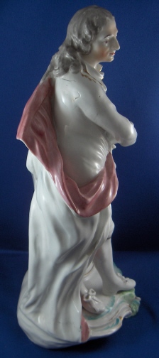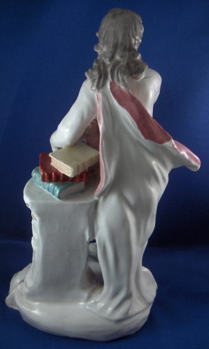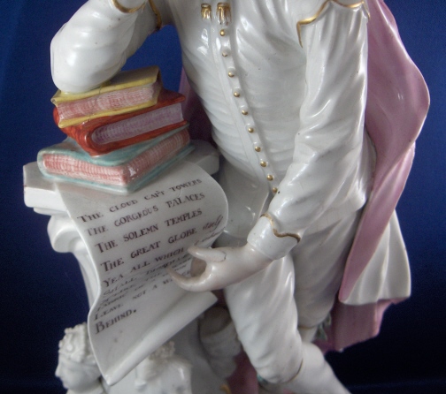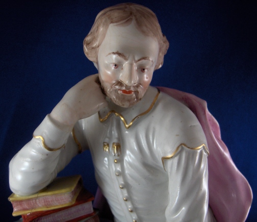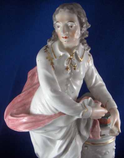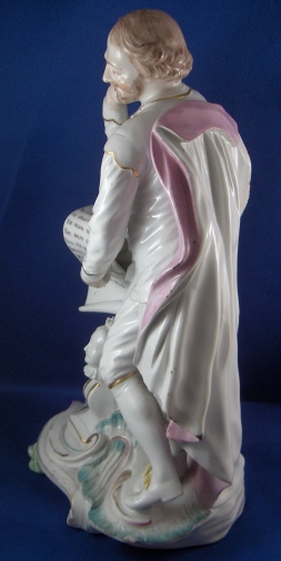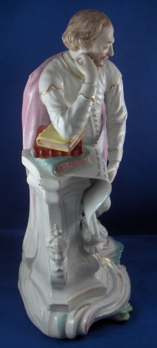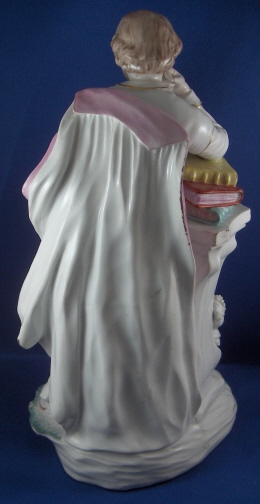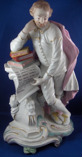 This is a pair of figurines made by Derby around 1765. One is William Shakespear and the other is John Milton. Two of the best and most famous English poets that ever lived. They are very well modelled and the colors are modestly applied which makes them very elegant and not overbearing. The earlier bases are much nicer than the little bit later, rectangular simple ones. The figurines are in superb condition with few flaws. Shakespeare has some wear to the gold trim, the thumb on his left hand has a crack in it but it was never off, one yellow shoelace is missing, and there is a firing crack underneath that extends into hairlines above the base, a hairline in the yellow book, a little roughness to his cloak rim that are minor and some crazing and minor factory flaws normal to the period. Really in superb shape for his age! Milton has the same wear to the gilding, a loop and lace missing on his left shoe, his left hand was off and is reglued but the break is very smooth, his index finger is missing on that hand, one teeny chip to the base, one small chip to the bottom cloak, one chip to the back edge of the cloak and some firing crack and factory flaws normal to these large and early pieces. Shakespeare is 12 inches tall and 6.375 inches wide while Milton is 12.75 inches tall and 6.5 inches wide. Neither is marked but they have the typical patch marks and are certainly from Derby and this period. The are very close to being a pair and come from the same time period but there are enough differences to say that they might not have started out togther originally. Might have been matched up already at the time of purchase though! Just an impressive pair of figurines from a long time ago! Please email me for more information or other pictures.