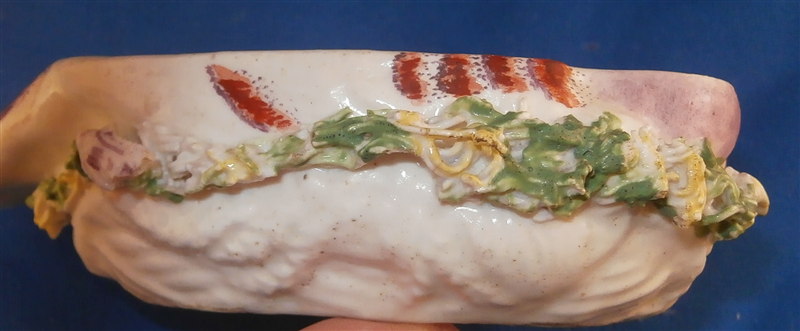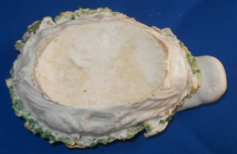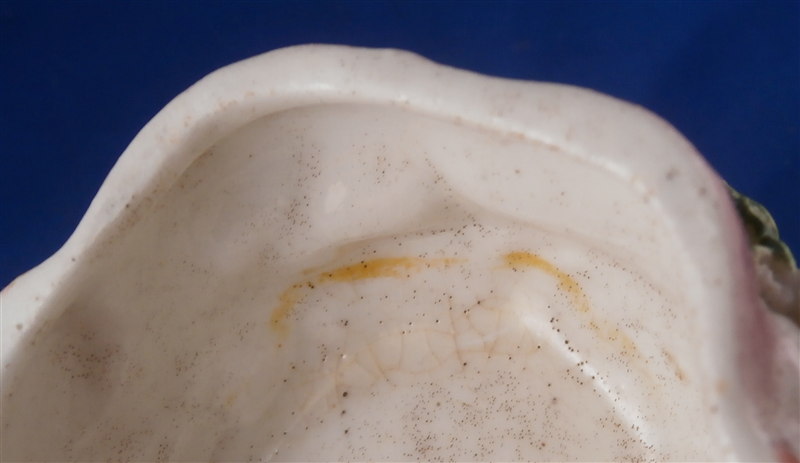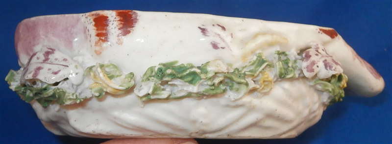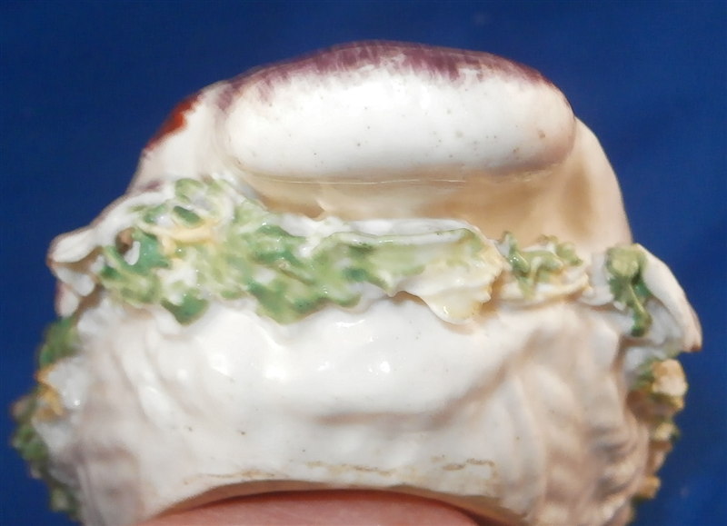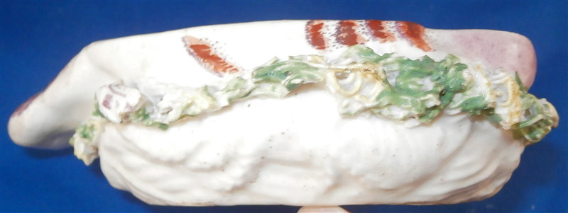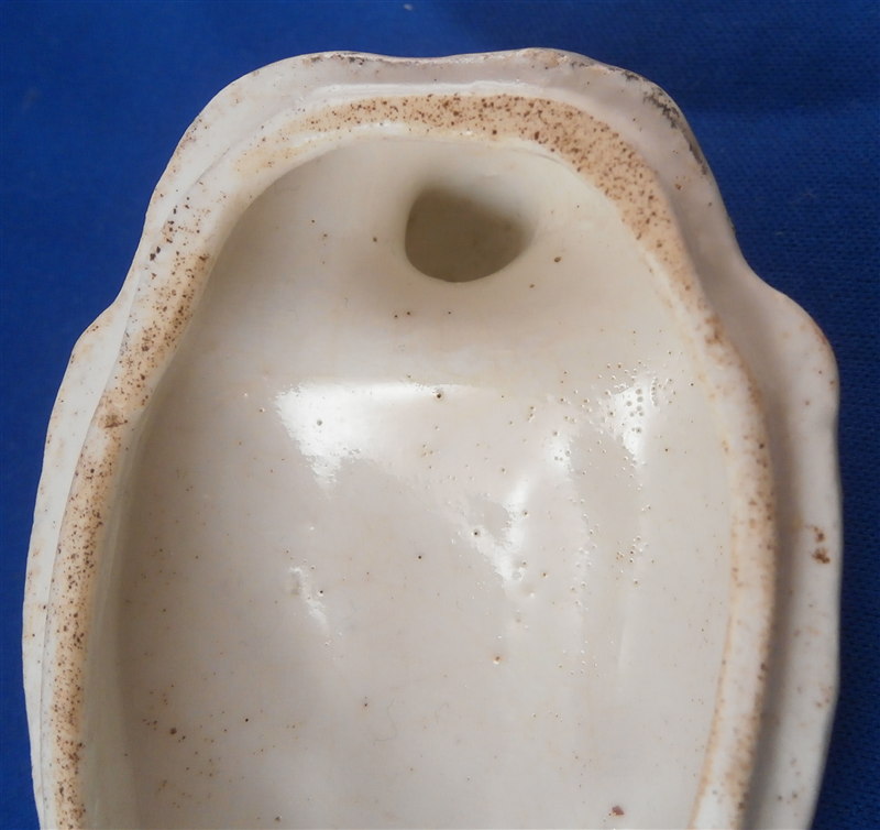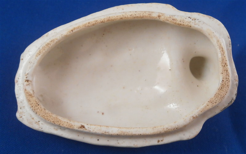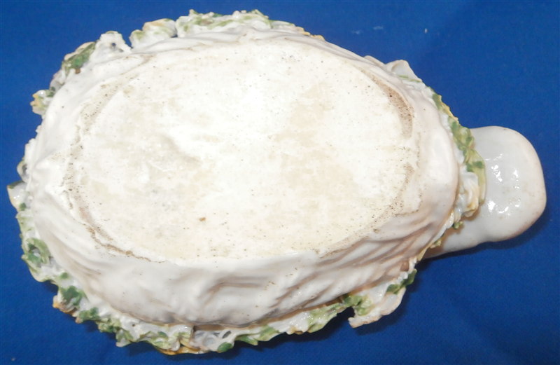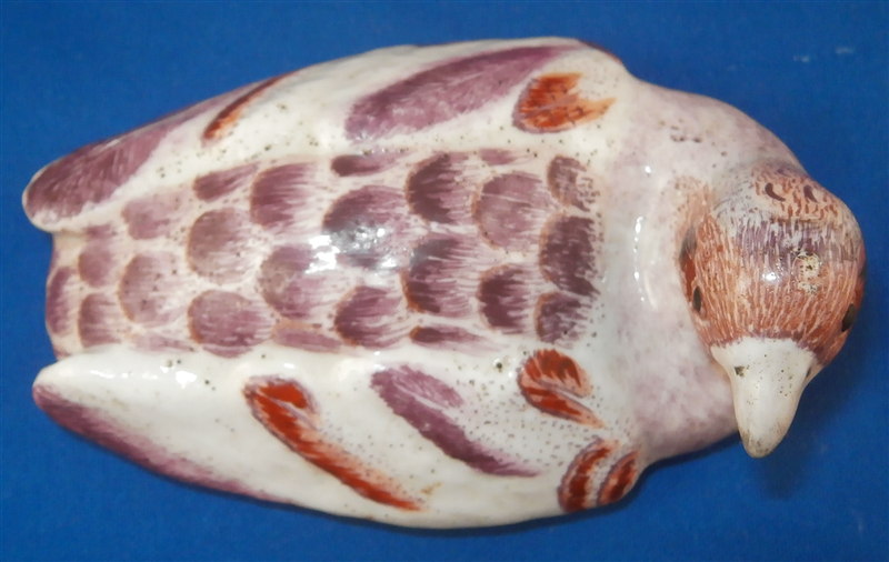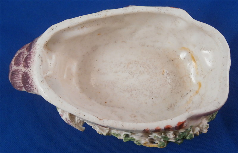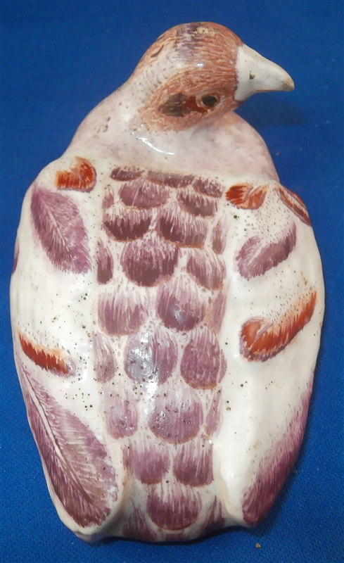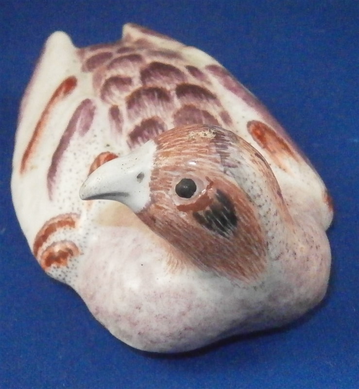 This is a superb and rare piece made by Derby in the early 1750s. Usually these are referred to as sauce tureens but I cannot find a piece of this size anywhere being half the size of what one usually finds (and even those bigger ones are very rare!). It is in the form of a partridge bird sitting on its nest. Nicely painted with fun colors and lots of detail. The piece matches one that was dates 1750-54 in terms of shape and colors/decoration though as I said this one here is much smaller and more fun :) The box and lid are in amazing condition considering the age! A bit of wear and some damage to the applied leaves/grass around the sides of the piece but even that is minor. Lots of tiny black firing spots common to these early pieces. All in all a thrilling piece and I was more than happy to have found it! The piece is unmarked underneath but that's pretty much the norm on these early pieces by them! The entire box is 2.75 inches tall, 3 inches wide and 4.75 inches deep. Please email me for more information or other pictures.
