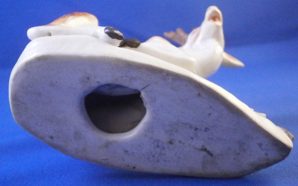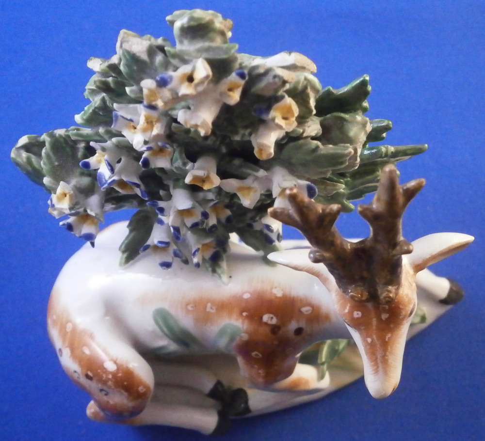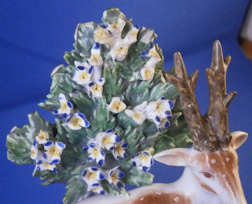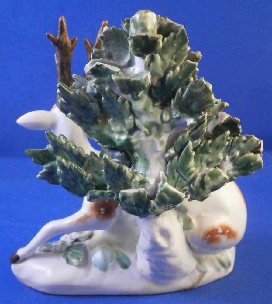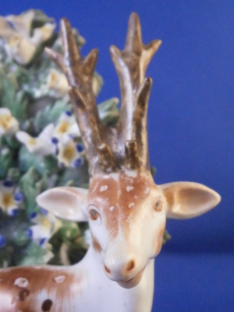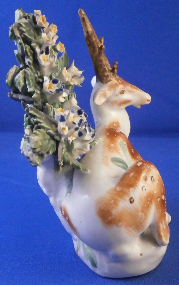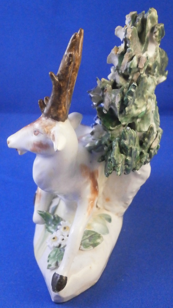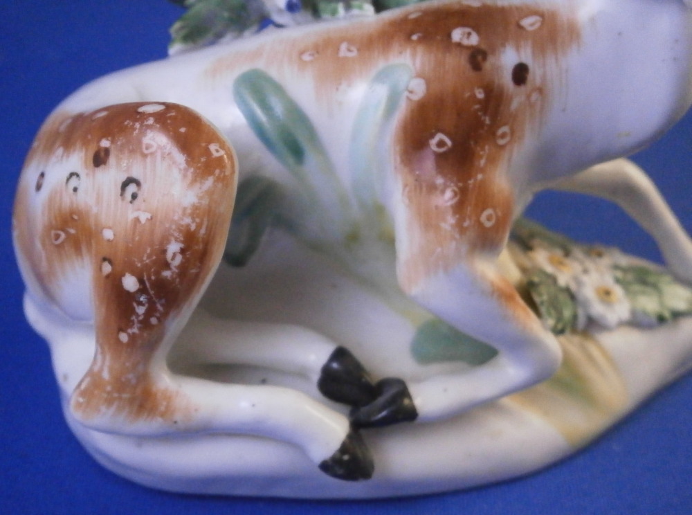This is a really fun figurine of a deer / stag made by Derby in the 18th century. The little guy is very well modeled with one leg stretched out while the other is tucked under. A bocage to the back to give it a little more substance. The figure is nicely modeled and perfectly hand painted to make it a very nice piece to look at! The figurine is in displays very nicely with damage to the bocage though not horrible, a small restored section to the lower part of the bocage behind the deer's head and the antler's and left ear have been restored though very well and the piece really does display nicely! The piece is unmarked which is very common for this maker during this time. It was definitely amde by them. The figurine is 4 inches tall, 3.625 inches wide and 2.375 inches deep. Please email me for more information or other pictures.