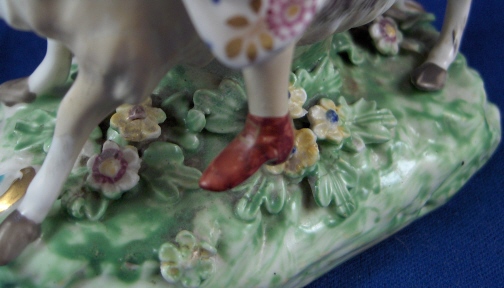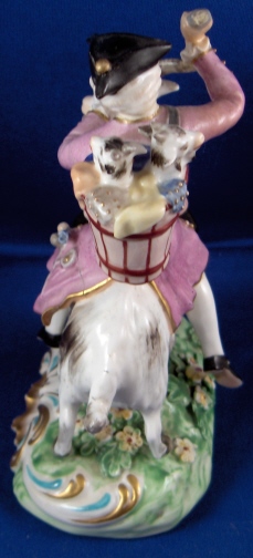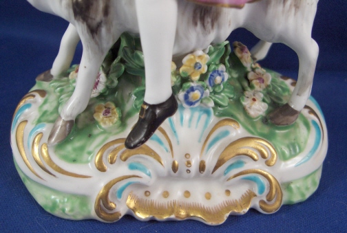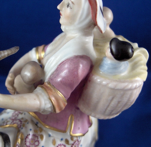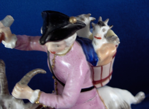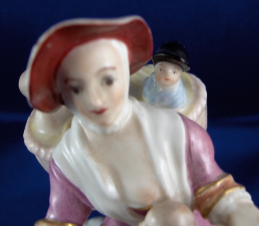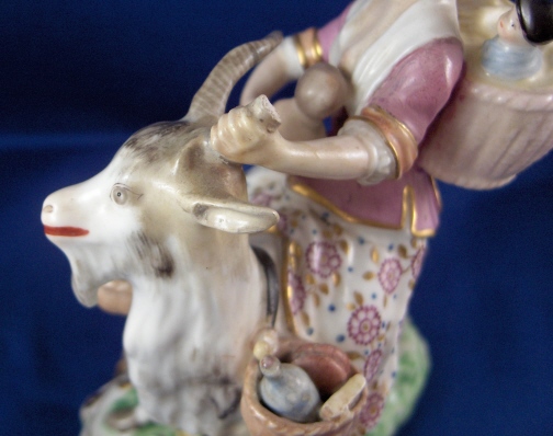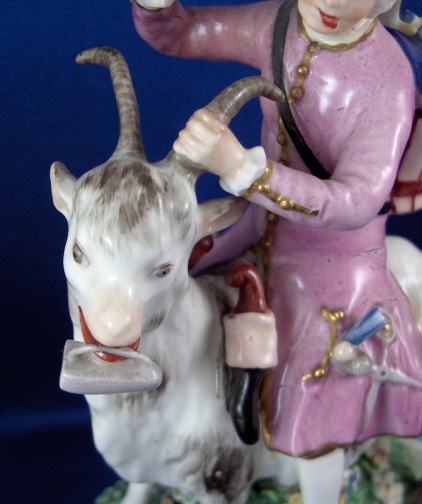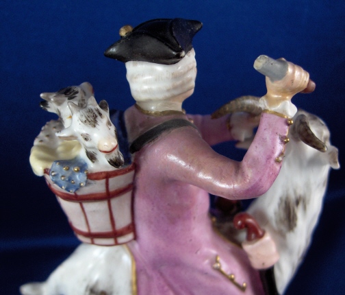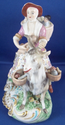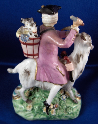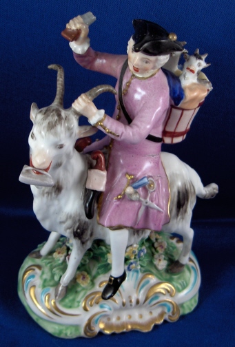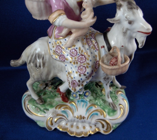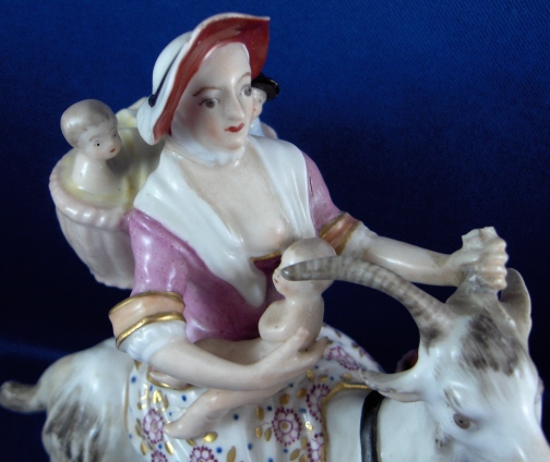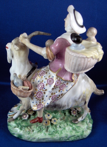 This is a pair of figurines made by Derby around 1775. They are of a Welsh Tailor sitting on a goat as well as his wife sitting on another goat. He has all his tailoring equipment attached and is wearing a basket with baby goats on his back while she has two small baskets attached to the side of the goat with food in it and is wearing a basket on her back with two babies in it while a third baby is in her lap next to her exposed breast.