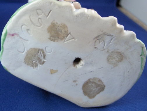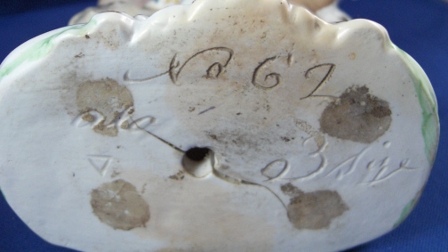 The pair displays superbly but has some damage/restoration. He is missing the tip of his scissors in his right hand which were previously restored, the left horn of the goat is restored, his right arm was off and so was his head I believe. The restoration work is very well done. She has had the left ear of the goat restored, the left horn is missing the tip, her left arm was off, the tail was restored, her left leg is restored, the left basket is missing its handle and an item is missing the top in it plus I believe that a little baby goat that was nursing in the back is gone as well. The restoration is well done as well but the white parts have yellowed and the restorer was a little ambitious and the spray hit the areas around the restoration as well which was not necessary! But like I said they display superbly and are so much fun! The figurines are the smaller version being about 5.5 inches tall, 4 inches long and 2.5 inches wide. They are marked with the incised No 62 as well as a size remark, a triangle and some other mark. Unusually well marked really! Please email me for more information or other pictures.