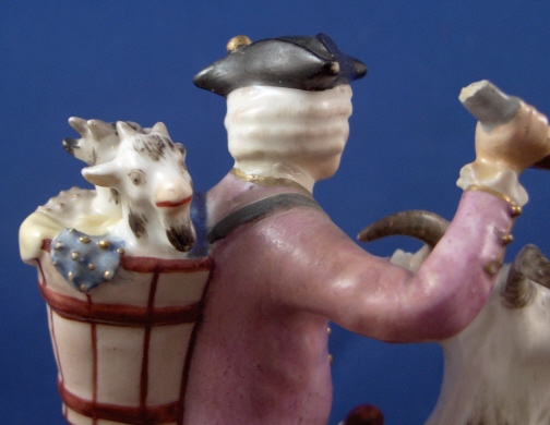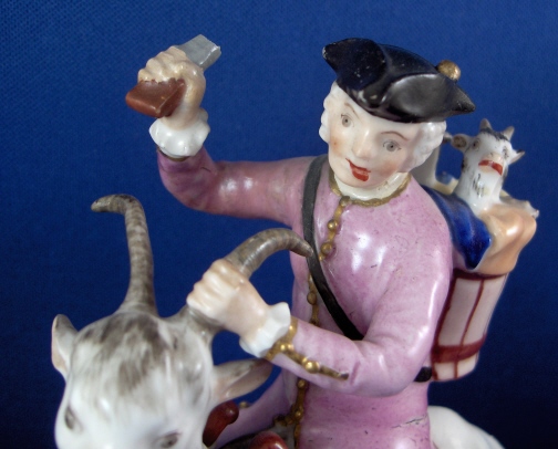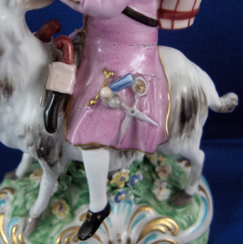 The figurines are based on a Meissen original where the story goes as follows: Count Heinrich Brühl was minister and favorite to Augustus III. He was appointed administrator of the Meissen factory from 1733 to 1763. By tradition Brühl was a man famed for his fashion sense. His tailor was thus an important part of his entourage. However, when the tailor's ambitions made him ask for an invitation to dine at court, the Count found the suggestion beyond the pale and well above the tailor's station. To put him in his place, the Count requested Kändler to make a figure of the tailor which he could place on his table and thus fulfill his empty promises. Kändler's undoubted satiric wit and sense of the ridiculous is here preserved.