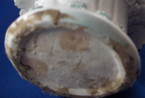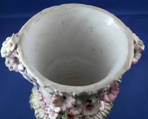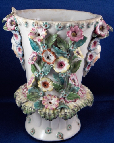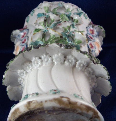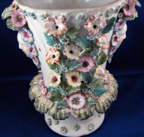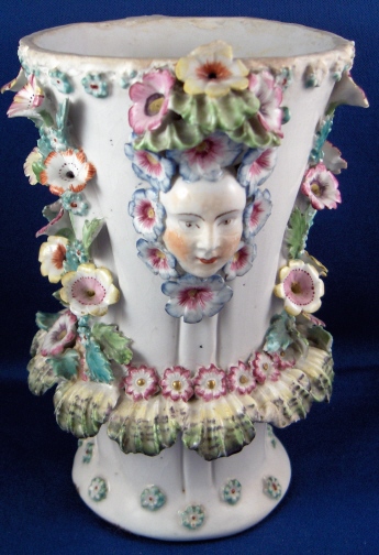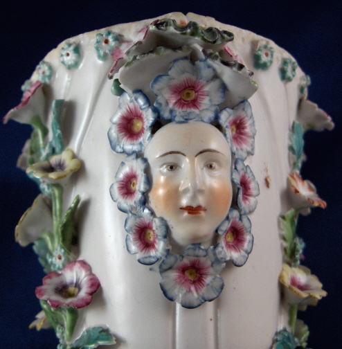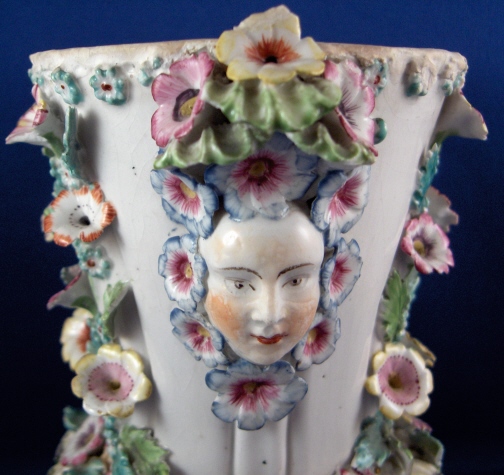 This is a vase made by Bow around 1760. It is superbly modeled with face handles and lots of applied flowers and leaves. Very nicely painted! The vase displays nicely the way it is but there used to be a reticulated rim on the top and it would have had a lid with a bird finial. Still usable and a great learning piece and you don't really miss the rim. It was ground down and evened out a bit. Besides that there are only three chips to flowers / leaves and three chips to the ring around the bottom made of shells? A bit of crazing to the glaze but nothing bad and a brown flaw from the making on one side in the white area. The piece is unmarked underneath but that's the norm. There are three pad marks often found on these as well as Derby pieces. The vase is 5.875 inches tall and 3.75 inches in diameter at the top without the applied decorations. Please email me for more information or other pictures.