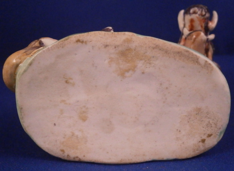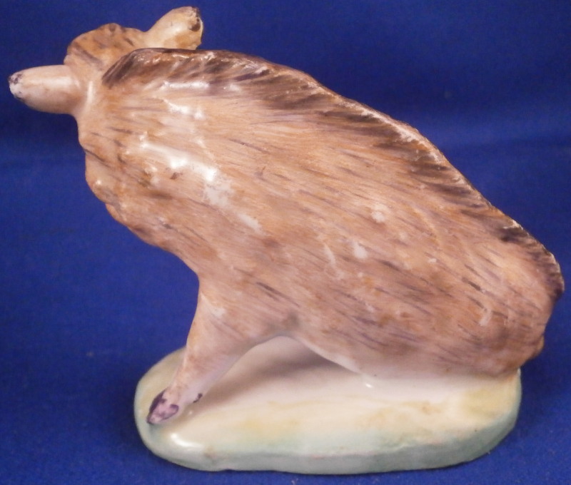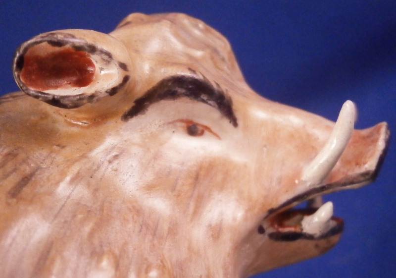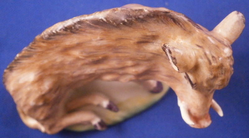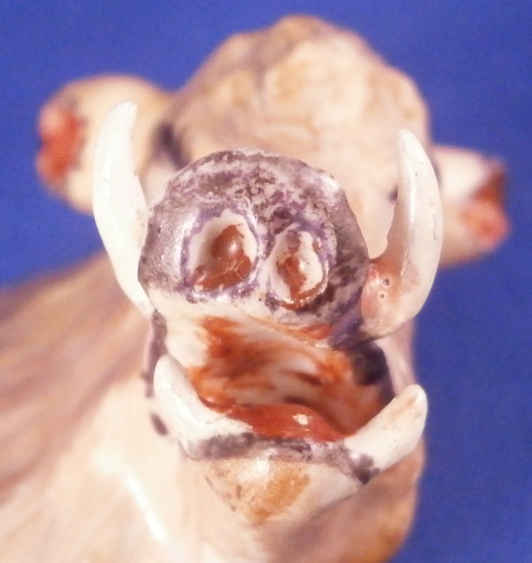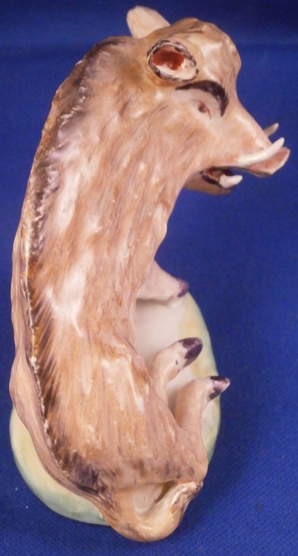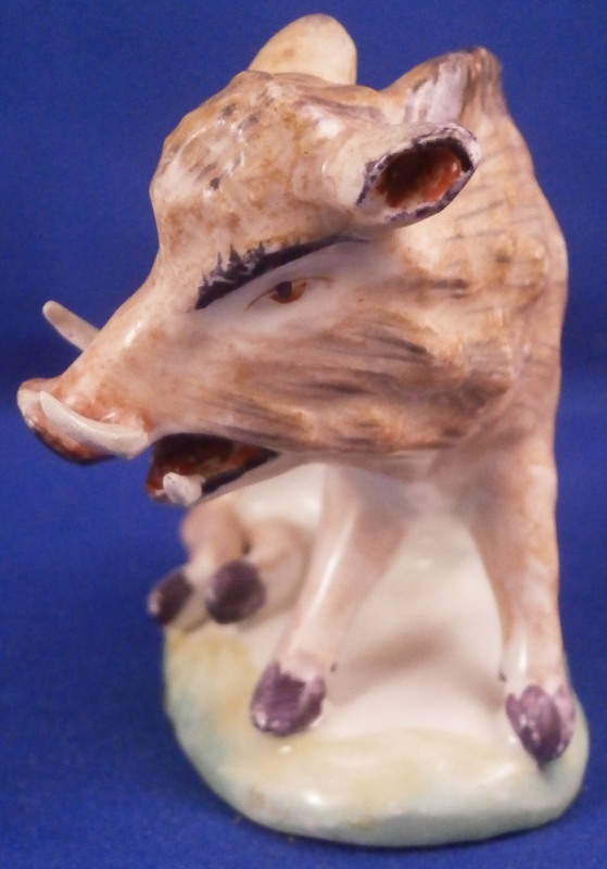 This is a really fun figurine of a wild boar made by Derby in the 18th century. The little guy is very well modeled and hand painted perfectly. A really nice version of a very hard to find figurine. He is just getting up from a little rest it seems. One cute little piece! The figure displays very nicely but has a few issues as is the norm on this model. The tusks have been restored as has the right ear and the tail. It was done very well and looks great even from close up. He is unmarked but does have the patch mark from firing on the udnerside of the base. The figurine is 2.5 inches tall, 1.5 inches deep and 3.125 inches long. Please email me for more information or other pictures.