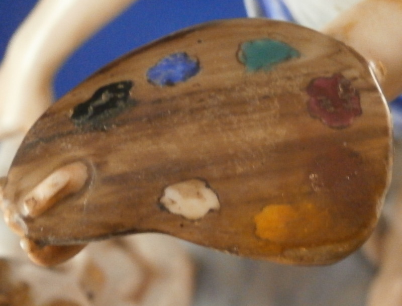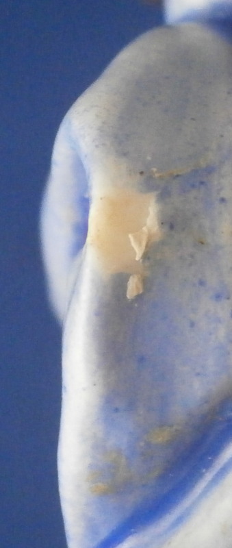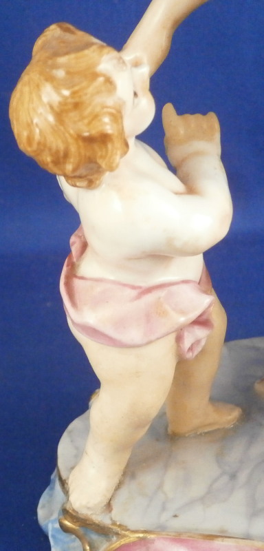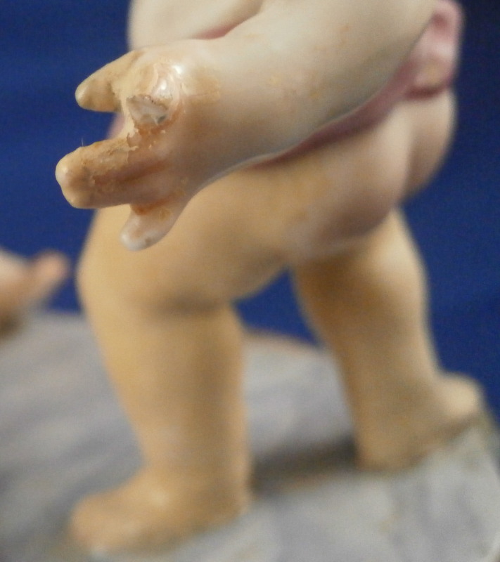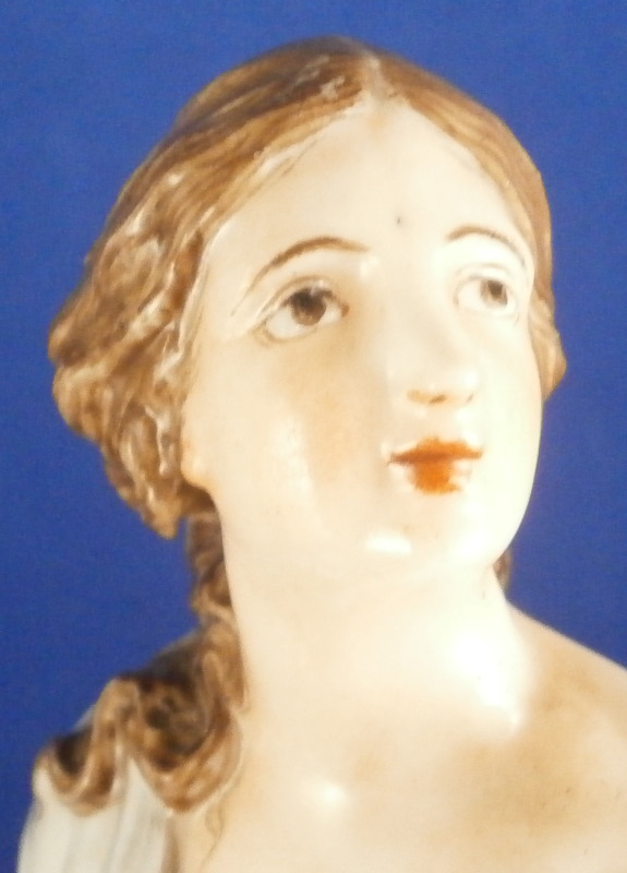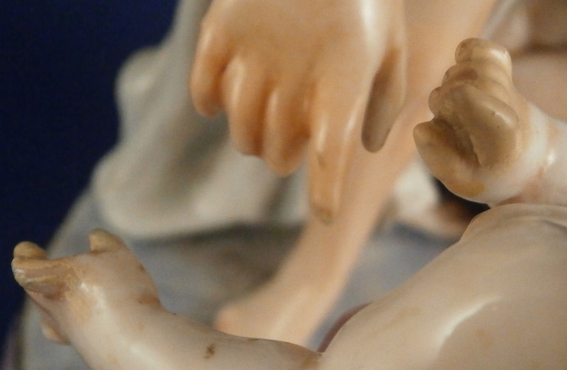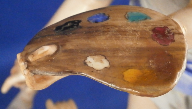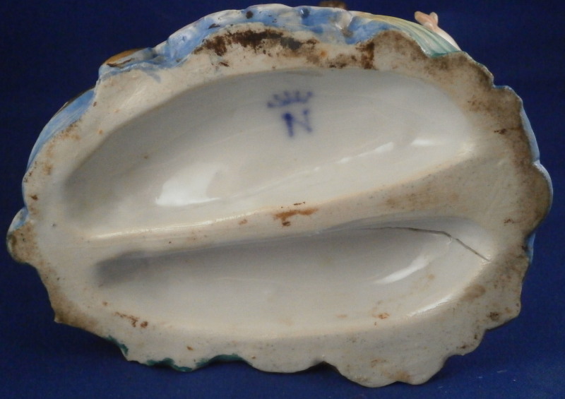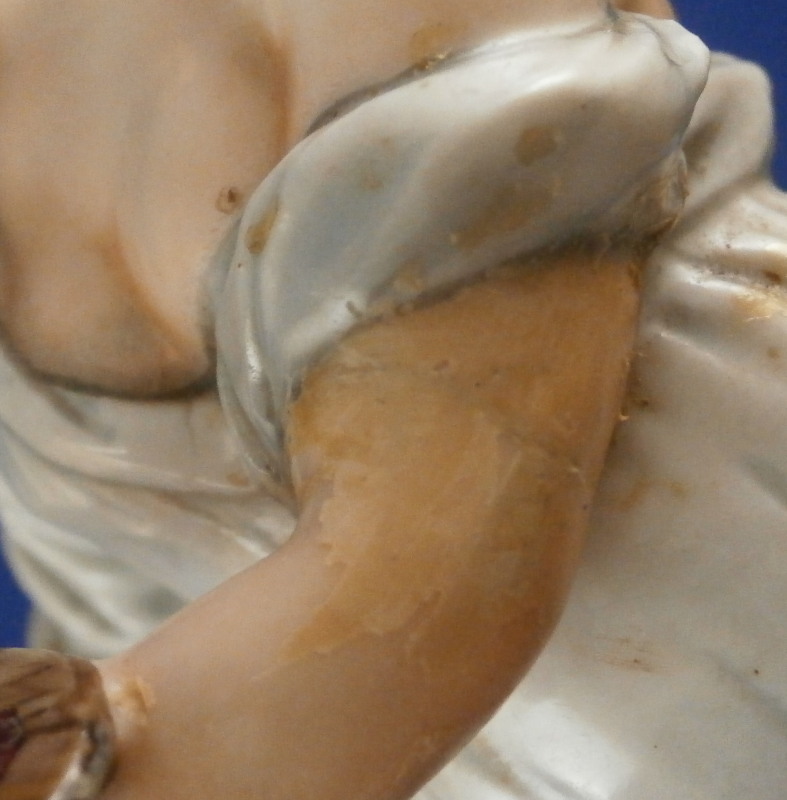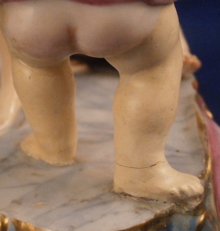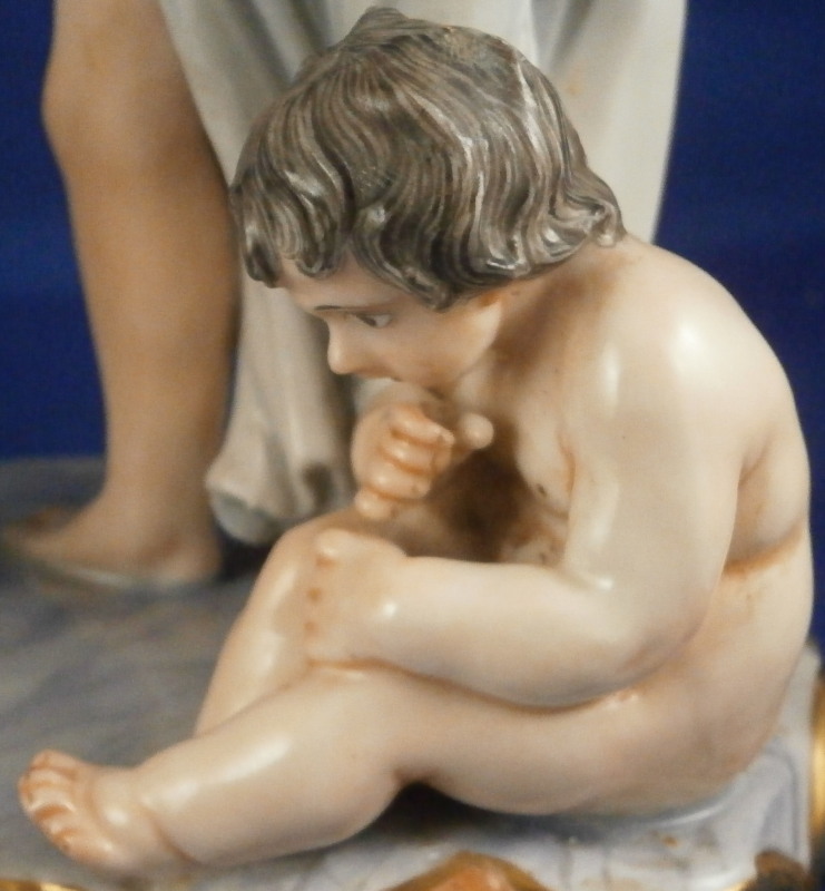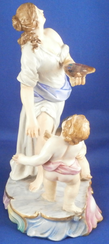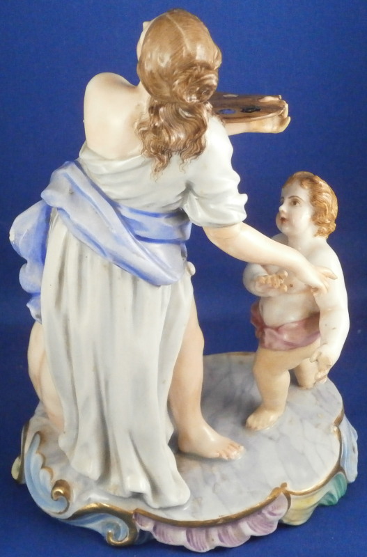 This is an superb figurine made by Doccia in the late 18th or early 19th century. It is of a lady in the center of the colorful base wearing blue robes while holding a paint palette in her left hand with a putto sitting on the base in front of her and another standing next to her. Probably representing the art . The base is superb with the top looking like faux marble and the sides having the typical colorful scrolls one expects from Doccia of this period. The piece is amazingly well modeled and painted! These pieces are always so cheery. The figure is in good display condition but has issues - her right arm was broken above the elbow, the corner of the painter's palette is repaired, the standing putto was broken off the base and has its legs painted over completely to hide whatever damage there might be and he has damage to both his index fingers plus a minor to the blue sachel of her robes as shown. A firing crack to the udnerside of the base only. In good shape for the age and a hard find to say the least. The piece is marked underneath with an under glaze blue N under a crown. The figure is 7.875 inches tall, 5.5 inches wide and 4 inches deep. Please email me for more information or other pictures.