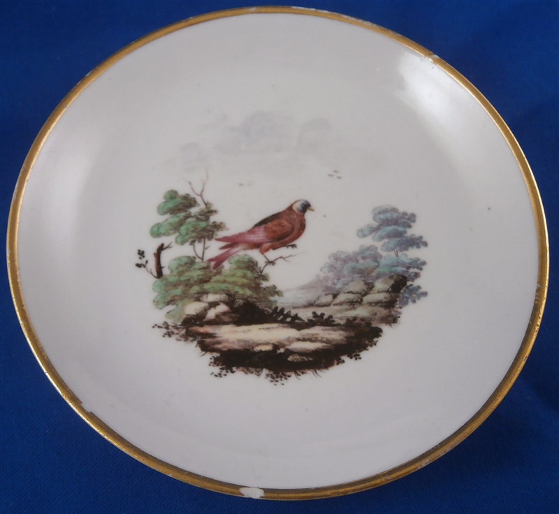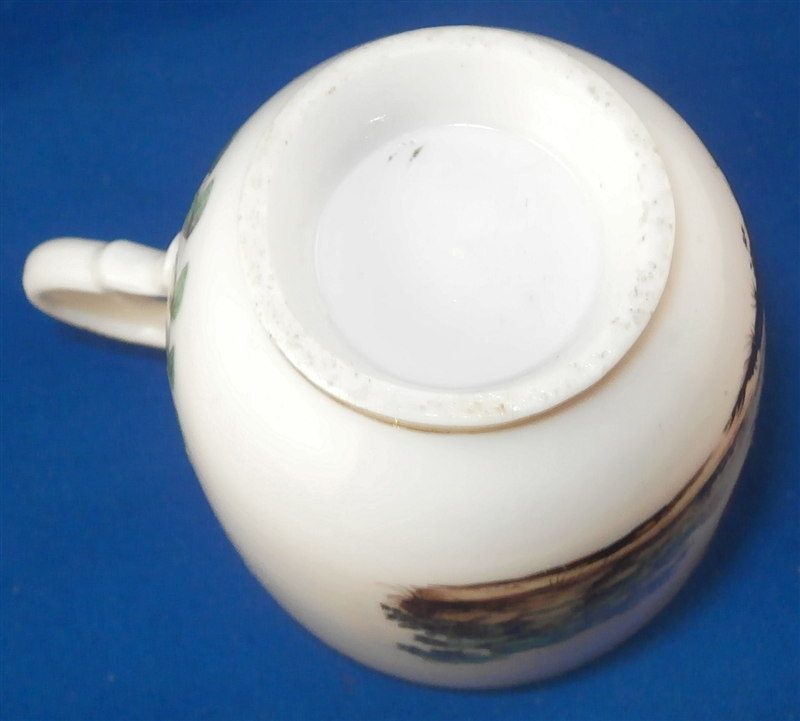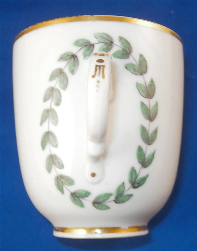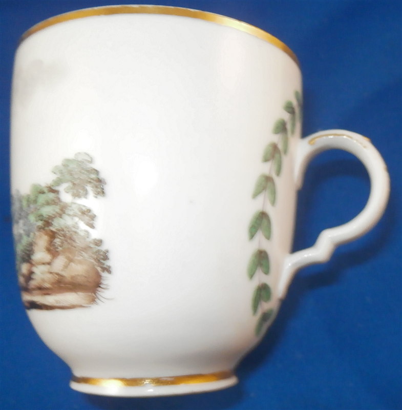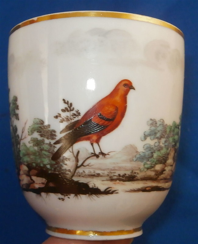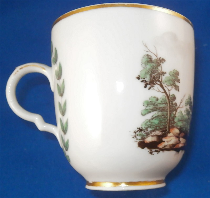 This is great cup and saucer made by Doccia around 1775. Both pieces are handpainted with a superb landscape scene with a large bird in it as well as a gold trim and the typical handle shape that is quite nice! The cup has a leaf garland around the handle which is a nice touch! The set is in great condition with a small shallow chip to the edge of the saucer that a little gilding would pretty much completely hide it. The cup and saucer are not marked except for an incised mark on the cup I cannot make out but the colors, handle shape and paste are typical and unquestionably Doccia. The cup is 2.75 inches tall and 2.5 inches in diameter. The saucer is 1 inch tall and has a diameter of 5 inches. Please email me for more information or other pictures.