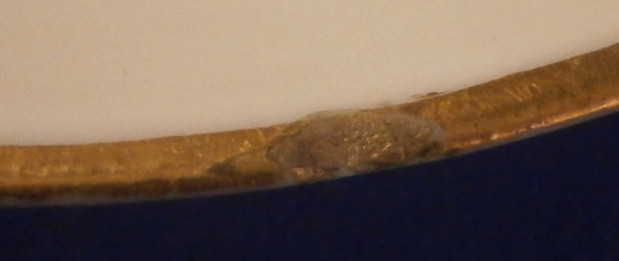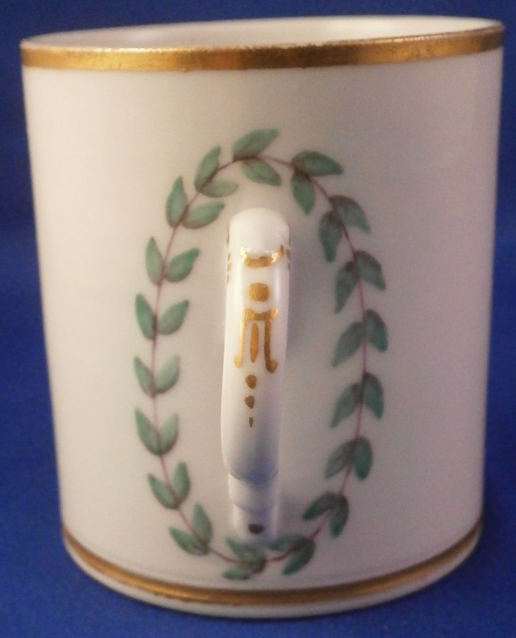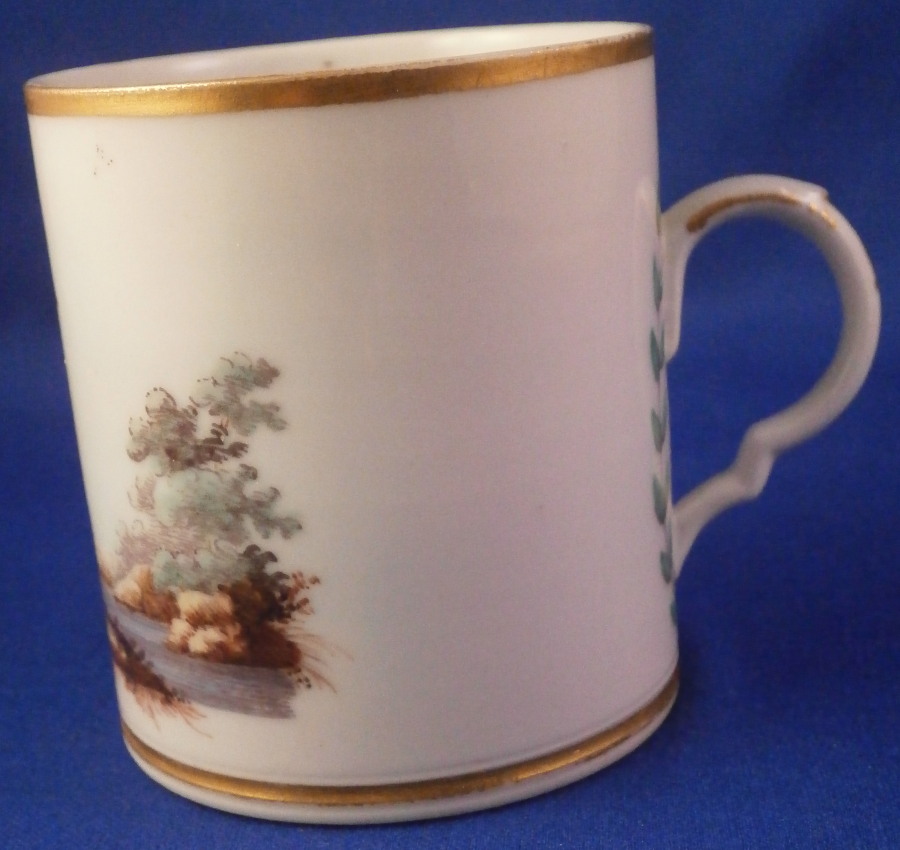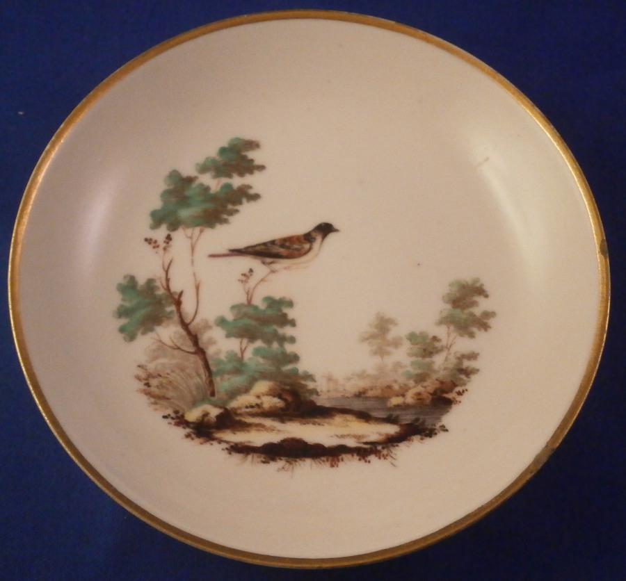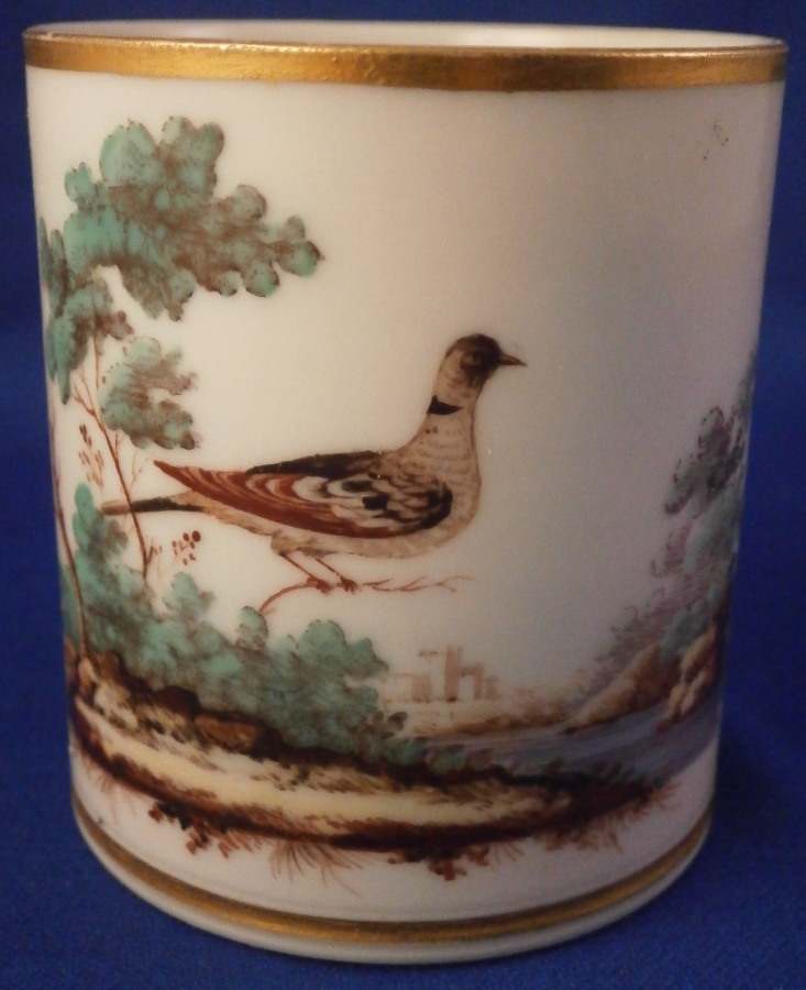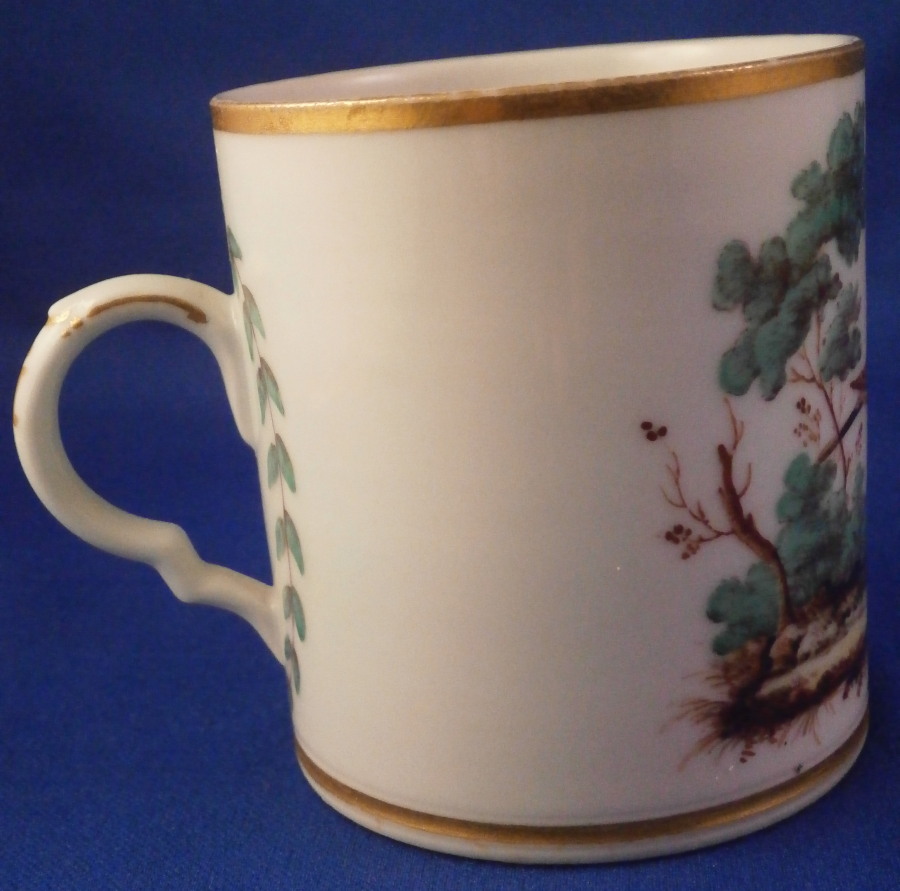 This is a superb cup and saucer made by Doccia in the 18th century. The set is hand painted with a superb landscape scene with birds in it as well as a gold trim and the typical handle shape that is quite nice! A leaf garland around the handle area and a bit of gold trim to the handle itself. The color tones are more muted than many of their pieces which to me makes it more attractive. The cup is in great condition with a large brown firing spot to the inside. The saucer has two chips in the gilded area of the edge colroed in to hide them better. Neither is large and it displays nciely as is or could easily be restored if one wanted to do that. I also own a matching differently shaped cup if one wanted to make a trio out of the set. It is also listed. The set is not marked but the colors, handle shape and paste are typical and unquestionably Doccia. The cup is 2.5 inches tall and 2.25 inches in diameter. The saucer is 1 inch tall with a diameter of 5.25 inches. Please email me for more information or other pictures.