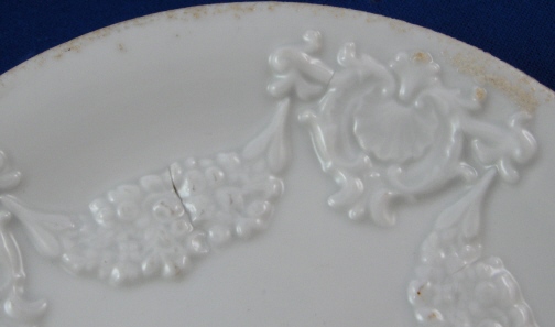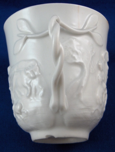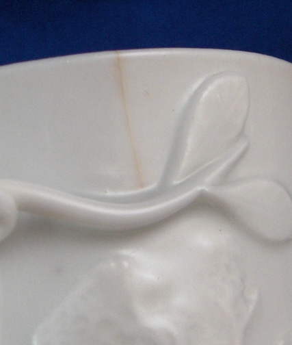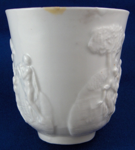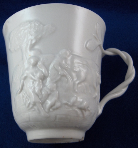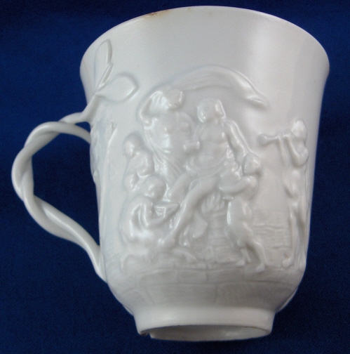 This is another cup and saucer made by Doccia in the late 18th century. I just bought an entire collection of this style just in case you were wondering! They are quite rare! This is what most people refer to this decoration as Capodimonte style with the mythological figures in relief. I don't believe Capodimonte ever actually made this style but Doccia did and made it famous for sure! The cup has lots of figural scenes on it including trees, lots of people, a man playing the flute and two oxen. The saucer is decorated with scroll work and garlands. All this is done in relief and is very detailed. The set is in good condition with some of their typical manufacturing flaws of this period including small cracks that are mostly under the glaze, minor black spots and inclusions. This cup has a small restoration to the top rim that has turned yellow and a 1 inch hairline plus a small chip to the footring. The saucer is fine. The handle is supposed to simulate twisted branches and was used during the same time the coral type handle was used. The cup is marked with the crown over N mark in underglaze blue as is the saucer. The cup stands 3 inches tall and 2.875 inches in diameter. The saucer is 0.75 inches tall and 5.75 inches in diameter. Please email me for more information or other pictures.