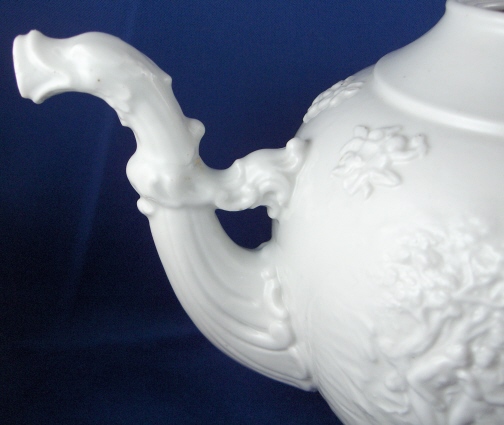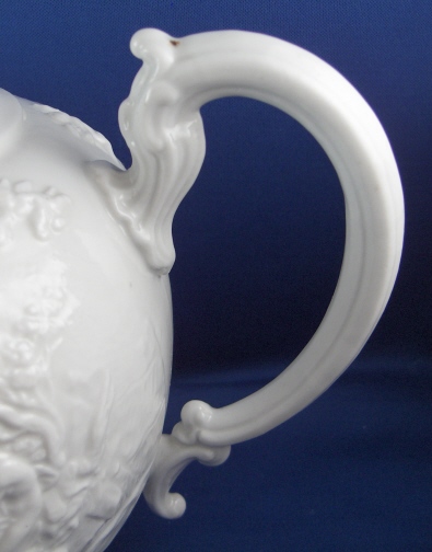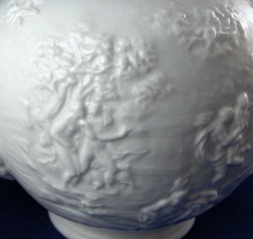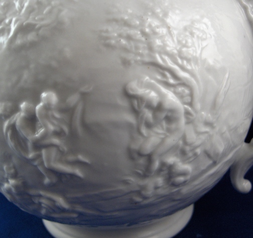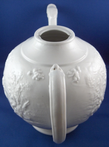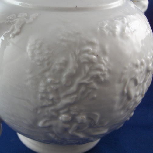 This is a rare large teapot made by Doccia in the late 18th century. I just bought an entire collection of this style design just in case you were wondering! They are quite rare and I have not seen nor owned a piece like it! This is what most people refer to as Capodimonte style with the mythological or biblical scenes in relief. I don't believe Capodimonte ever actually made this style but Doccia did and made it famous for sure! The teapot has figural scenes on all around including trees, lots of people and pairs of little cherubs in the sky plus a nice handle and figural spout. The lid has a superb figural finial on it. All the scenes are done in relief and are very detailed though the thick glaze hides some of it as usual. The teapot is in superb condition with some of their typical manufacturing flaws of this period including small cracks that are under the glaze, minor black spots and inclusions. There is a larger firing crack in the spout which was factory filled at some point though some of that has come out. The glaze does cover it. The lid is a bit of a mystery - certainly of the period by them and it fits perfectly but the inside ring is much smaller than the opening and it does not have the two points the main body opening has room for. But it does fit perfectly so maybe a special order?? The teapot is not marked which is fairly normal with Doccia pieces. It stands 7.75 inches tall including the finial, it has a diameter of 6 inches and it is 11.25 inches long including the handle and spout. Please email me for more information or other pictures.