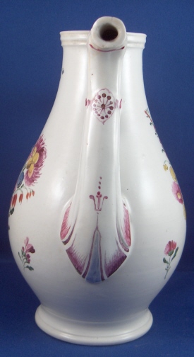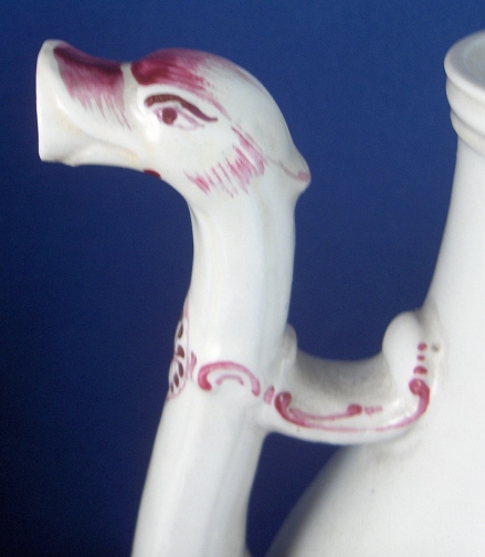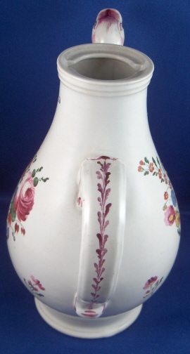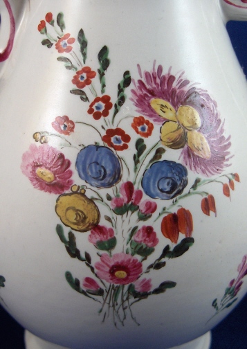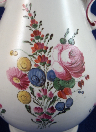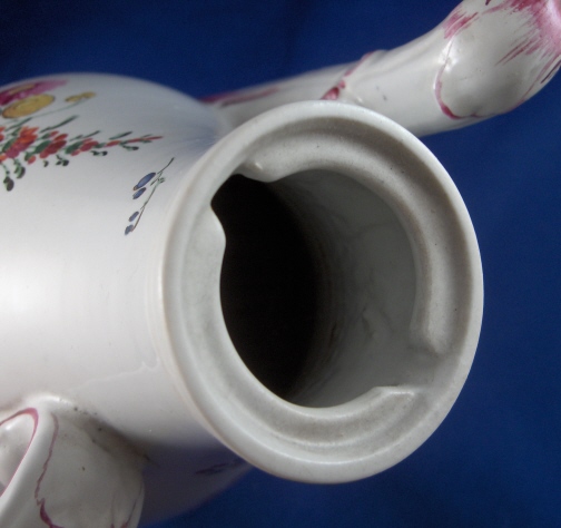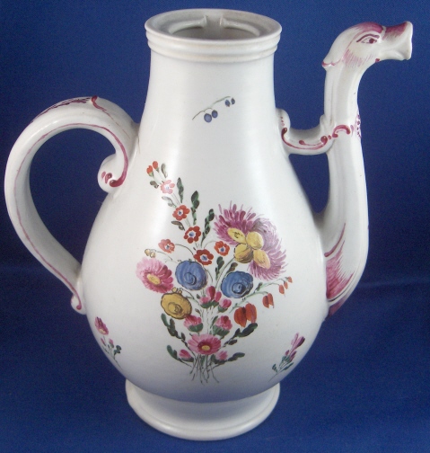 This is a rare coffee pot made by Doccia in about 1770. The piece is superbly modeled with an animal spout and is handpainted with lots of nice flowers including two large arrangements. Also a nice colorful mostly puce trim. It is made of tinglazed porcelain. The pot is in superb condition with nothing wrong at all except that the lid is missing which is a bit of a bummer. It is not marked but that is the norm for these pieces. The coffee pot is 7.375 inches tall, 4.25 inches wide and 6.25 inches long including the spout and handle. Please email me for more information or other pictures.