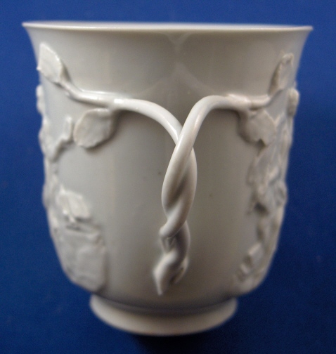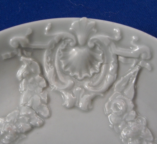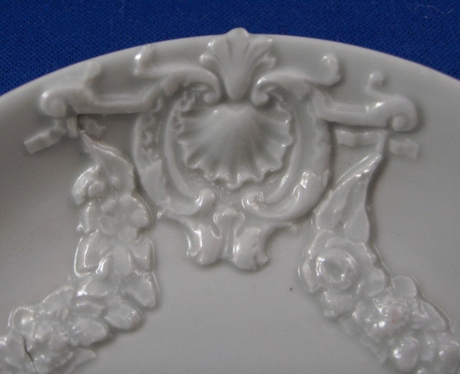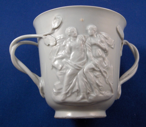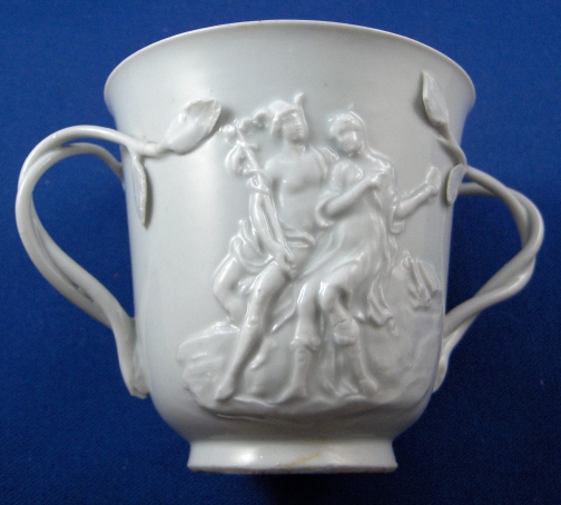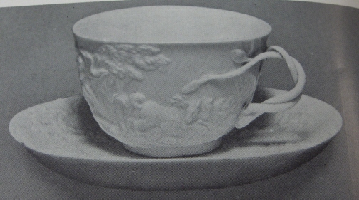 This is a rare cup and saucer made by Doccia in about 1760. This is the original to all the copies you see everywhere. The cup is decorated with mythological figures one being Mercur. The saucer is decorated with scroll work and garlands. All this is done in relief and is very detailed. The set is greyish in color and is in great condition. Two leaves of the ends of the handles are chipped. Some firing flaws such as black specs and small firing cracks (surface ones only) as well as the pieces not being perfectly round but these are just more proof that the set is 18th century. The cup and saucer are unmarked which was pretty much always the case with their wares. The cup stands 2.875 inches tall, 4 inches wide and 2.625 inches deep. The saucer is 0.875 inches tall and 4.875 inches in diameter. Please email me for more information or other pictures.