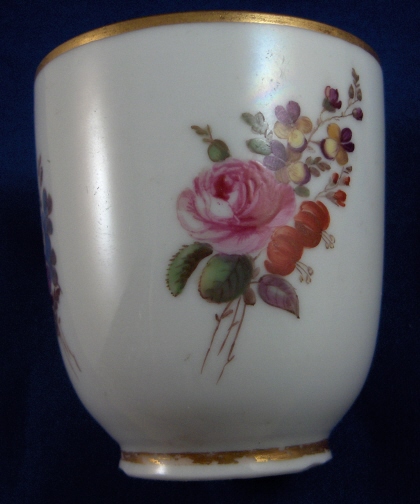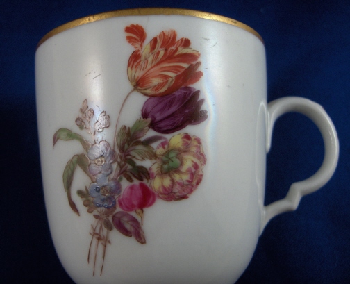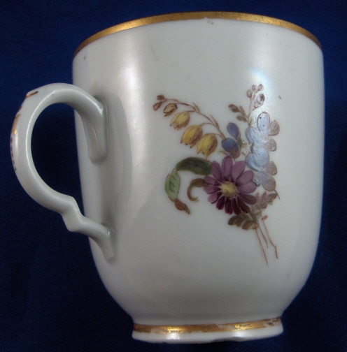 This is another nice cup made by Doccia in the 18th century. It is handpainted with three floral arrangements that are very well done as well as a nice gold trim. Typical handle also highlighted with gilding. The cup is in great condition with some chipping to the footring bottom which might be original to the making. The cup is not marked but the flowers and paste are typical and unquestionably Doccia. The cup is 2.75 inches tall and 2.5 inches in diameter. Please email me for more information or other pictures.