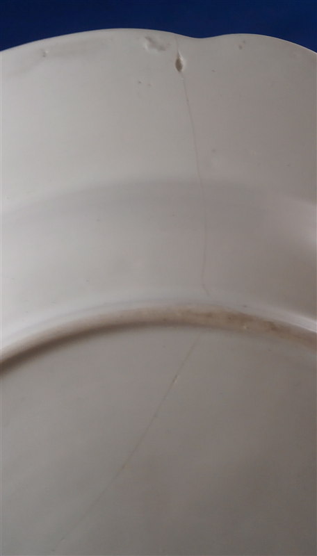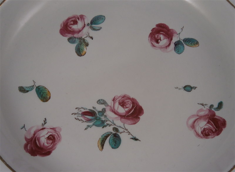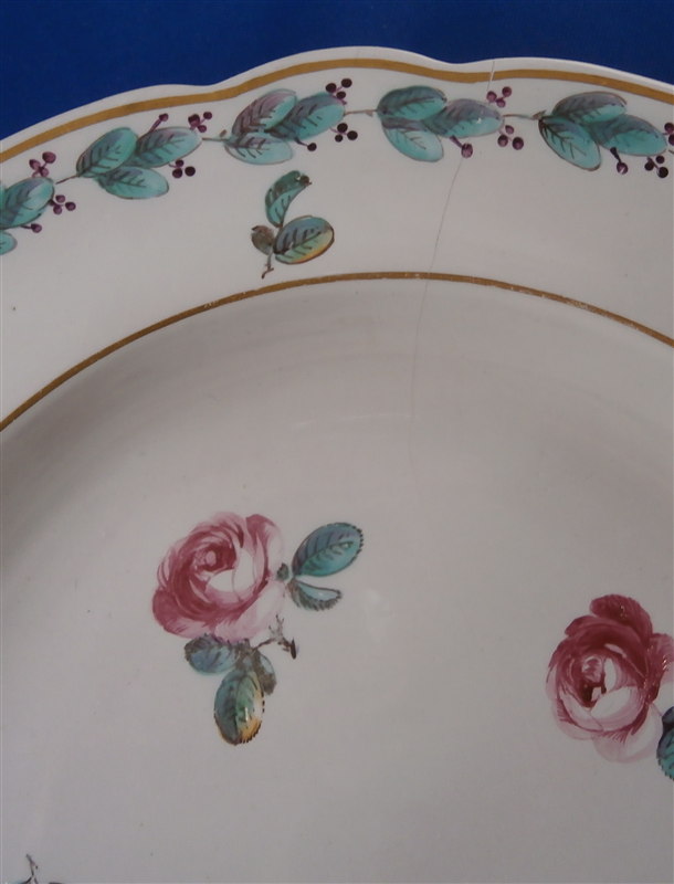 This is a rare soup bowl / plate made by Doccia / Ginori in about 1770. It is handpainted with detailed roses, rose buds and leaves as well as a leaf garland around the rim and two gold lines. This the called the Lodi pattern. The plate is made with a tin glaze to cover the not so white porcelain paste. This was used around 1770. The plate displays superbly but it has a small chip to the back edge and a large hairline as shown. Too bad since otherwise it is as nice as one could hope for. It is unmarked which is very common. The dish is 1.625 inches tall and 9.5 inches in diameter. Please email me for more information or other pictures.