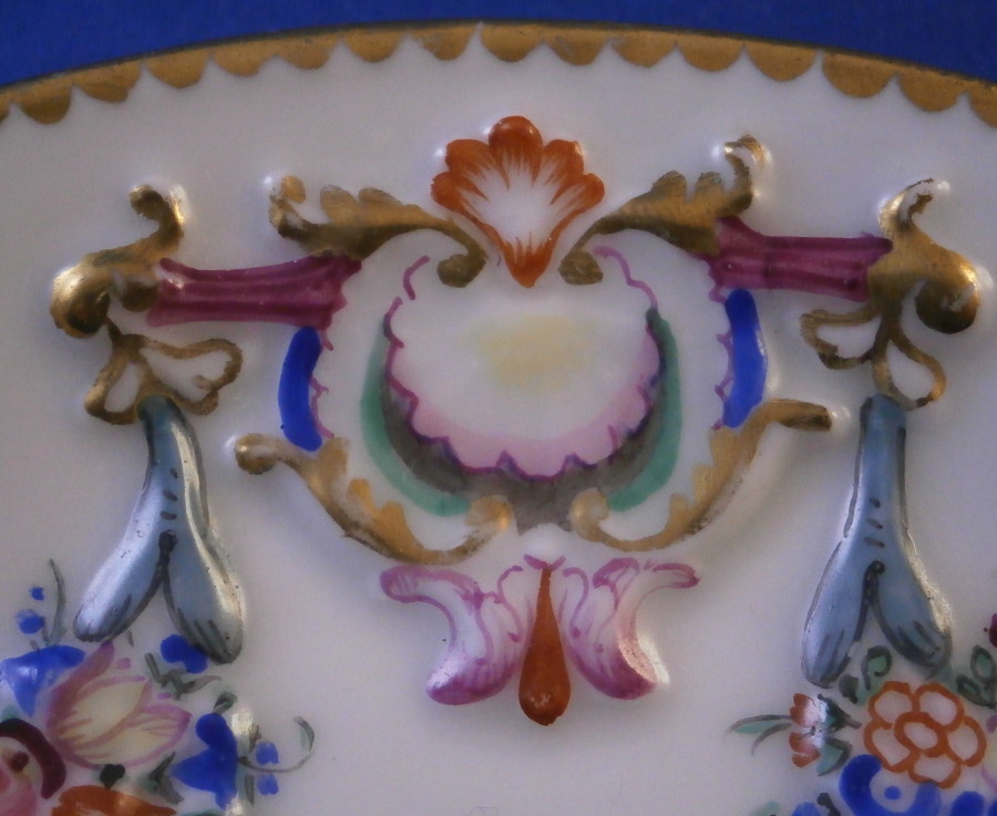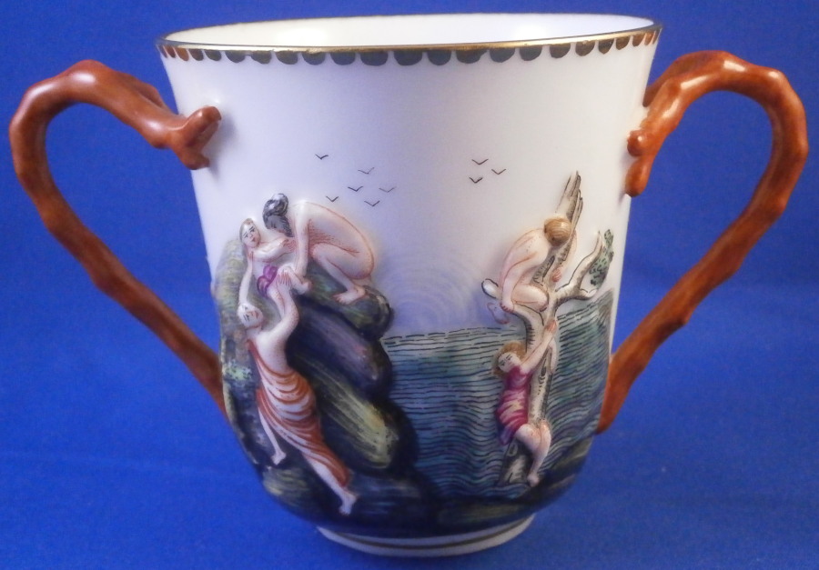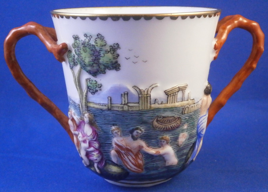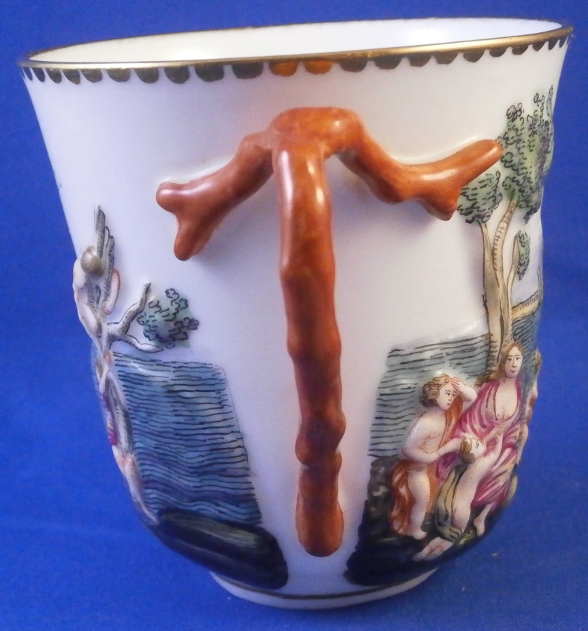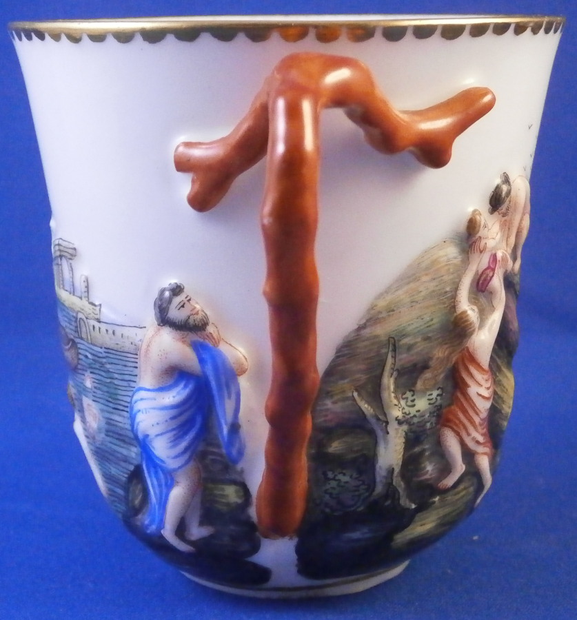 This is a nice double handled cup & saucer made by Doccia / Ginori in the mid 19th century. Probably a hot chocolate cup. The cup is decorated with biblical or mythological scenes in relief all around that are hand painted very nicely. It has a red coral branch handle to either side. The saucer has the usual really neat relief design with swags of relief flowers in between. The set is in great condition with some very minor wear to the gilding and a few tiny black firing spots from when it was made. Both pieces are faintly marked with the under glaze blue crown over the letter N as shown. The saucer is 1 inch tall and 5.75 inches in daimeter, the cup is 3 inches tall and just under 3 inches in diameterl. Please email me for more information or other pictures.
